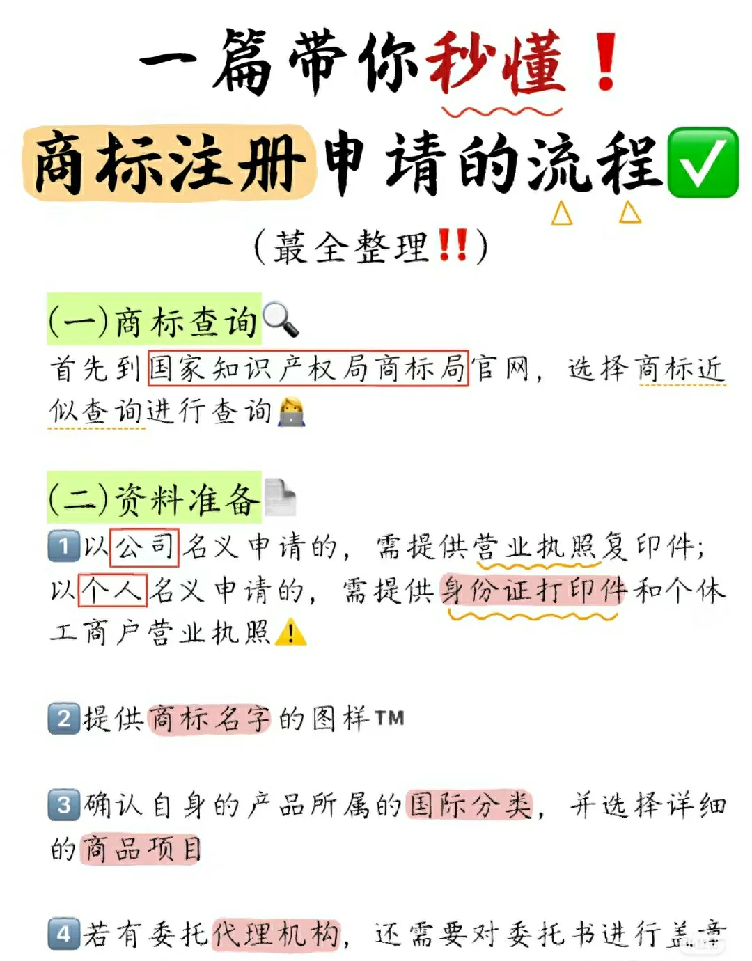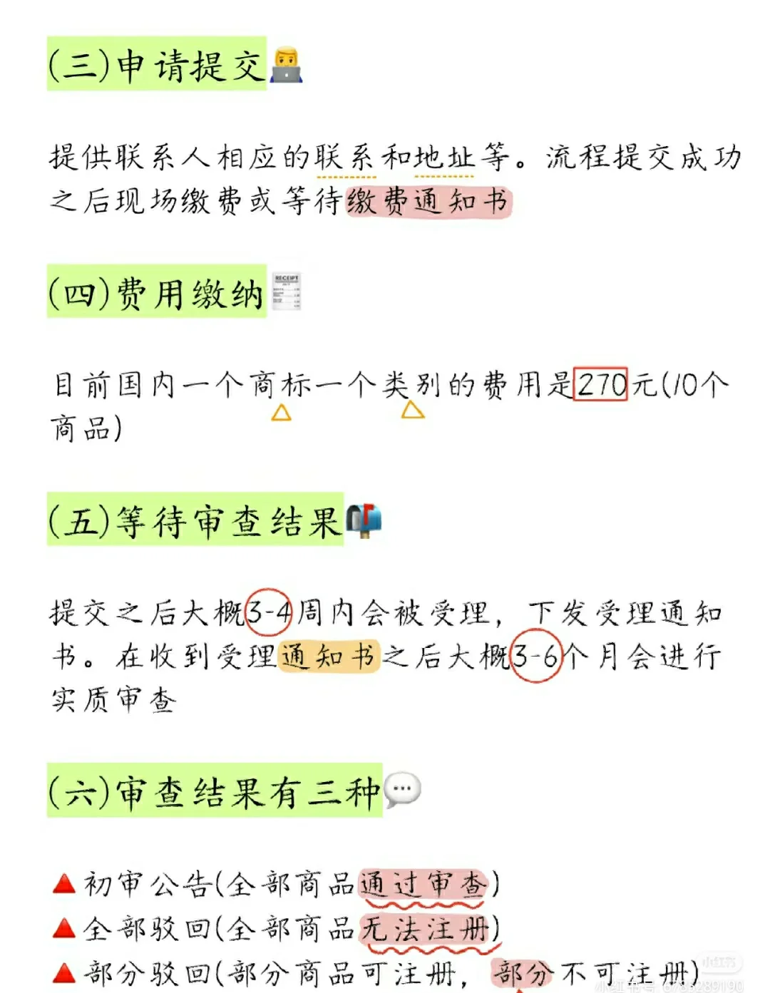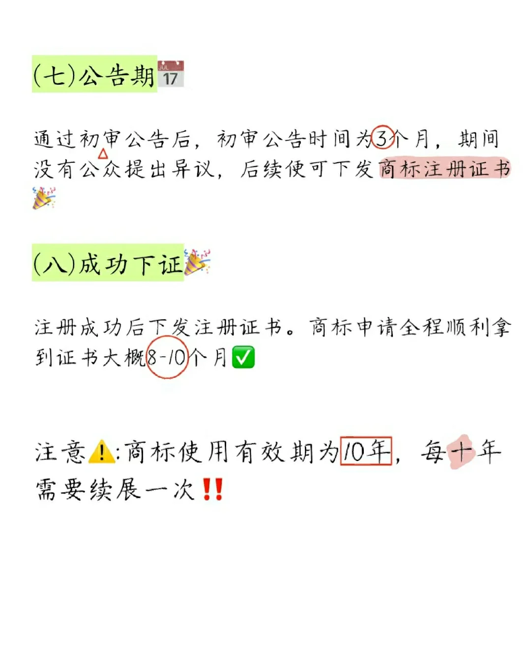 一篇能让你在几秒钟内理解的文章!商标注册申请流程五 (1) 商标查询 首先,进入中国国家知识产权局商标局官网,选择商标近似查询进行查询 (2) 数据准备 如果以公司名义申请,则需要营业执照副本: 如果以个人名义申请,必须提供其身份证打印件和个体工商户营业执照! 提供商标名称™的设计 3.确认您的产品的国际分类,并选择详细的产品项目 如果有委托代理机构,还需要在授权书上盖章或签字 (3) 提交申请 提供相应的联系人和地址。成功提交流程后,进行现场付款或等待付款通知 (4) 费用的支付 目前,中国每个类别一个商标的成本为270元(10种产品) (5) 正在等待审核结果 提交后,它将在大约3-4周内被接受,并将发出接受通知。实质性审查将在收到验收通知后约3-6个月内进行 (6) 评审结果有三种类型 预审公告(所有产品均已通过评审) 所有被拒绝(所有产品都无法注册) 部分拒绝(有些产品可以注册,有些不能注册) (7) 公告期17 初次审查公告通过后,初次审查公告期为3个月,期间不公开提出异议。随后,可以颁发商标注册证书 提交后,它将在大约3-4周内被接受,并将发出接受通知。实质性审查将在收到验收通知后约3-6个月内进行 (6) 评审结果有三种类型 预审公告(所有产品均已通过评审) 所有被拒绝(所有产品都无法注册) 部分拒绝(有些产品可以注册,有些不能注册) (7) 公告期17 初审公告通过后,初审公告期为3个月,期间不得公开异议,后续可颁发商标注册证书 (8) 已成功颁发证书 注册成功后,颁发注册证书。商标申请过程顺利,取证耗时约8-10个月√ 注意该商标有效期为10年,每10年需要更新一次!