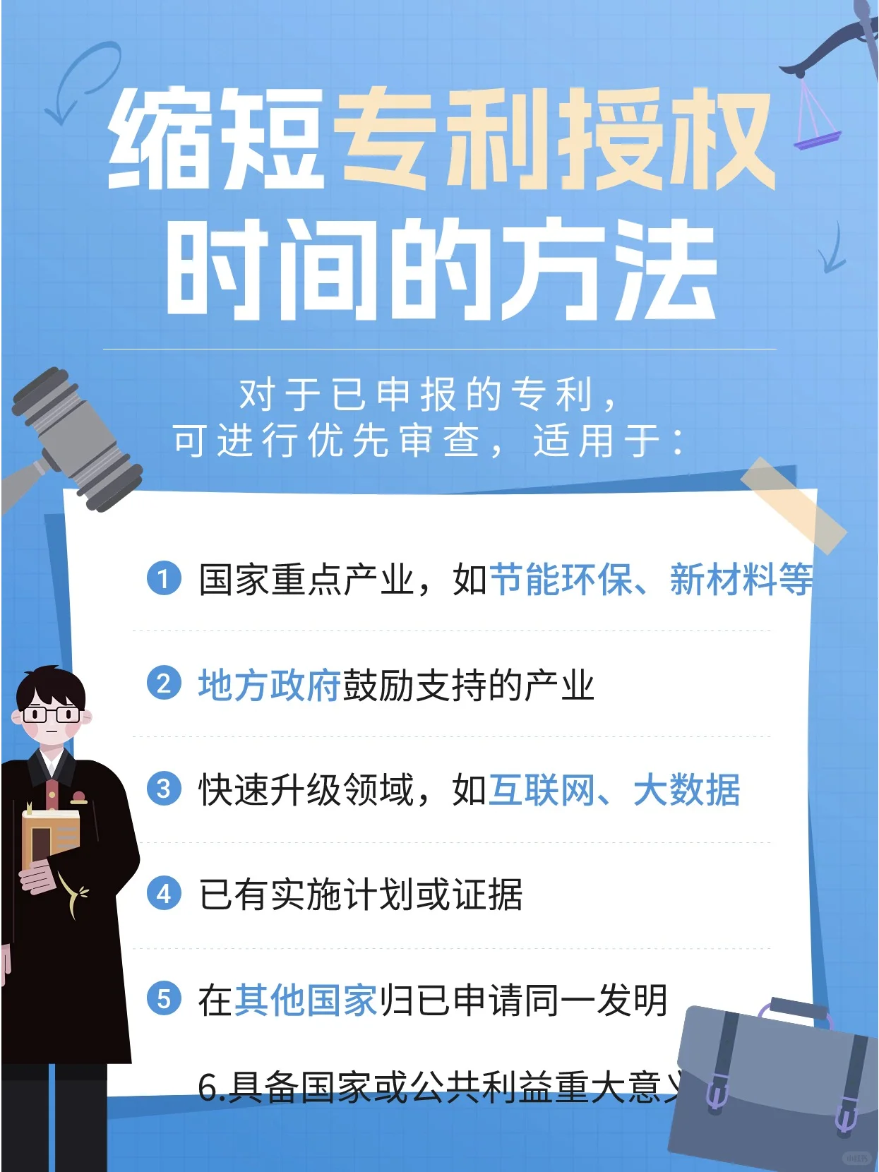 普通的专利申请过程复杂而耗时,尤其是发明专利,通常需要2-3年甚至更长的时间。尽管普通专利申请对申请人的限制较少,但随着技术竞争的日益激烈,一些高科技行业对专利的需求与日俱增。普通的专利申请程序对产品升级快的企业几乎没有优势,因此对于这类企业,中国国家知识产权局先后推出了【优先审查】和【快速预审】两个加速通道。 ❊ 专利优先权审查: 专利局根据《专利优先审查管理办法》(2017年),为符合要求的发明、实用新型和外观设计专利申请提供快速审查渠道。 ❊ 快速专利预审: 主要是指地方知识产权保护中心为备案申请人提供专利申请初审服务,中国国家知识产权局加快对通过保护中心初审的专利申请进行复审,缩短专利申请授权周期。 那么,专利预批准的速度有多快 理论上,各类专利的授权时间如下: 发明专利的授权期限可以从2-3年缩短到3-6个月左右; 实用新型专利的授权期限可以从6-9个月缩短到2个月左右; 外观设计专利的授权期限可以从3-6个月缩短到1个月左右。