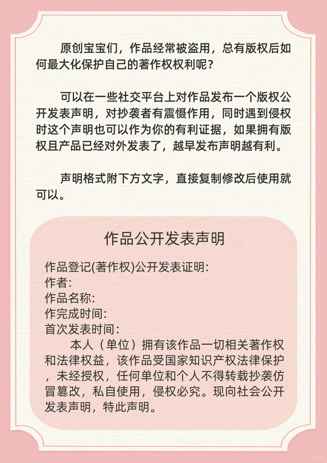 直接复制和使用 版权公开声明 作品登记公开发表证明(版权): 著者 作品名称: 完成时间: 首次发布时间: 本人(单位)拥有本作品的所有相关著作权和合法权益,本作品受国家知识产权法保护。未经授权,任何单位和个人不得擅自转载、抄袭、模仿、篡改、使用。任何侵权行为都将受到起诉。我在此向社会公开声明。