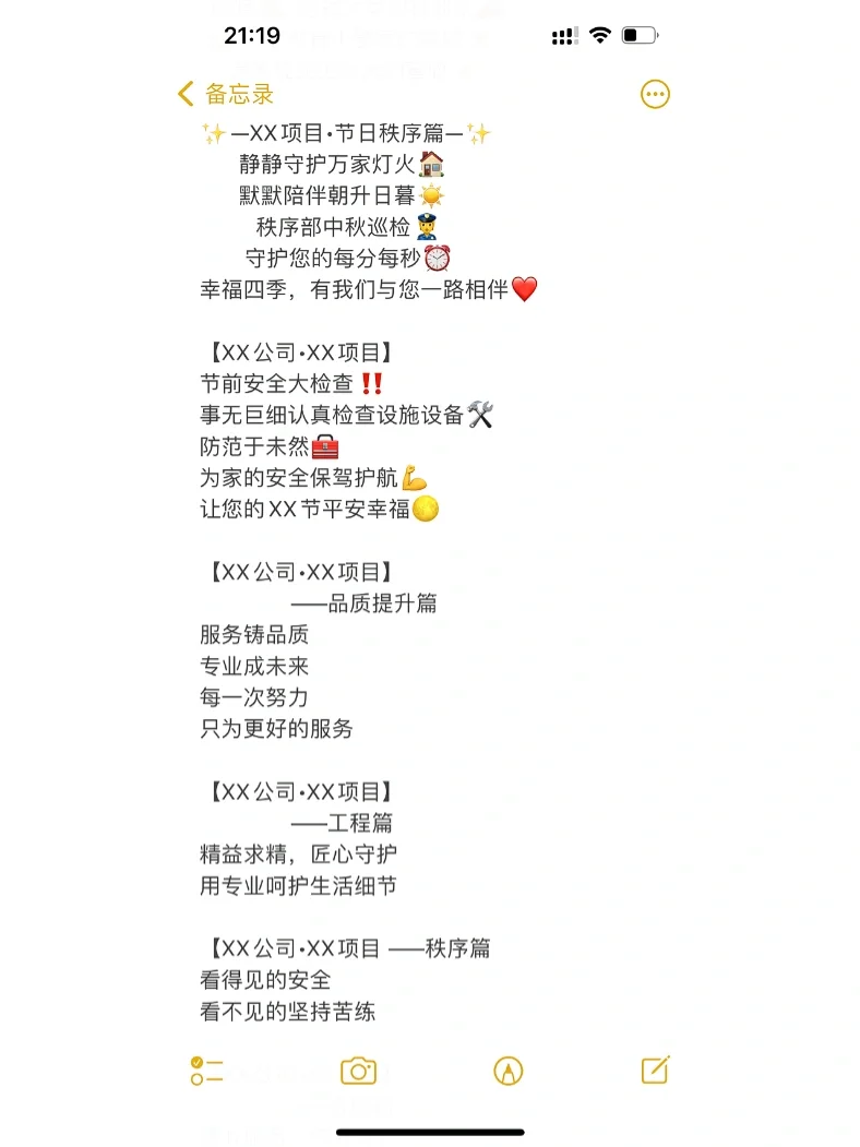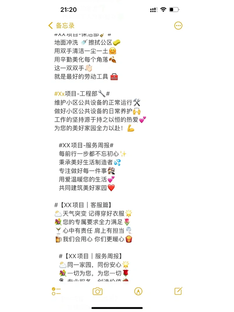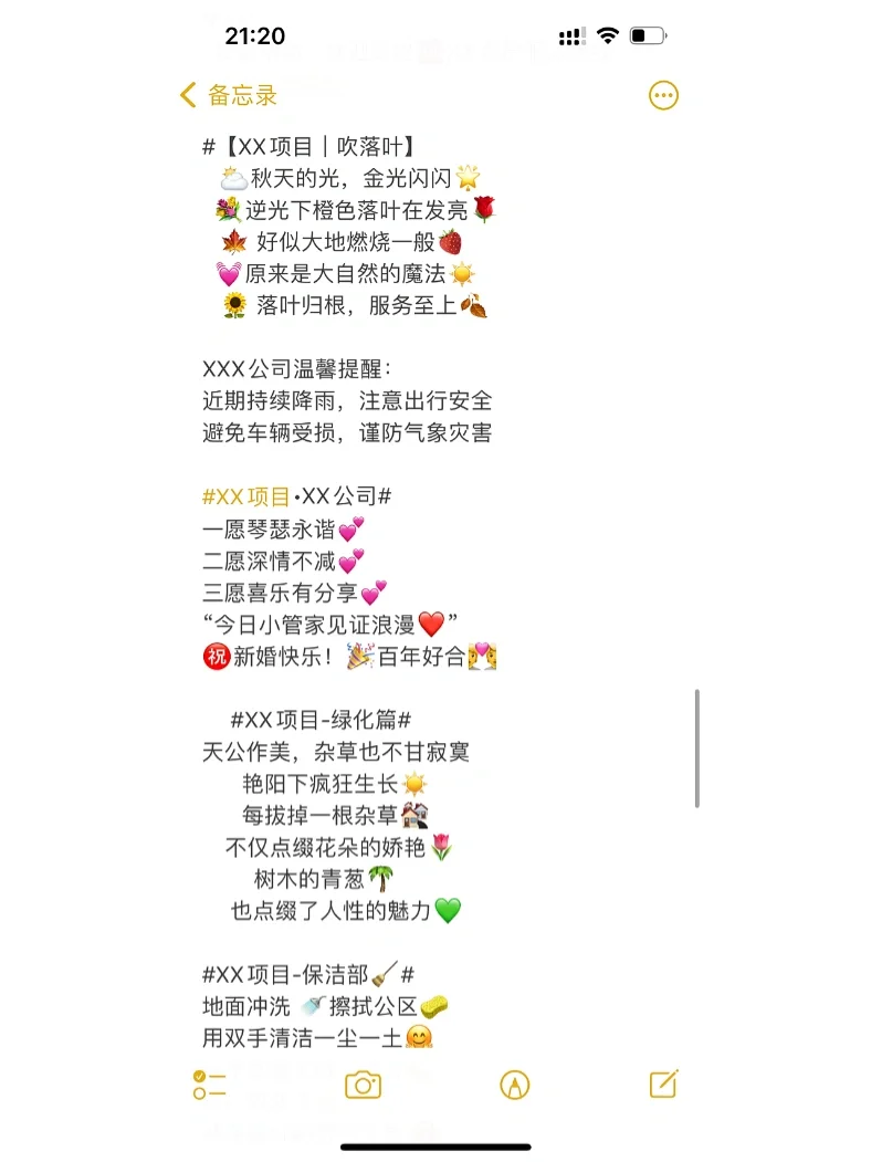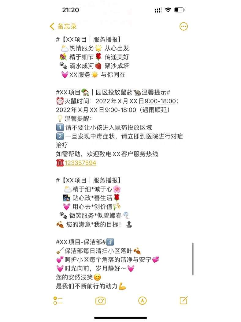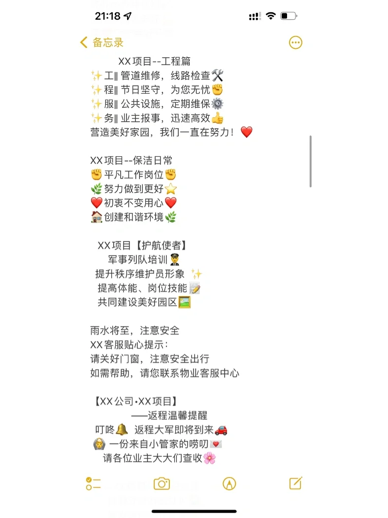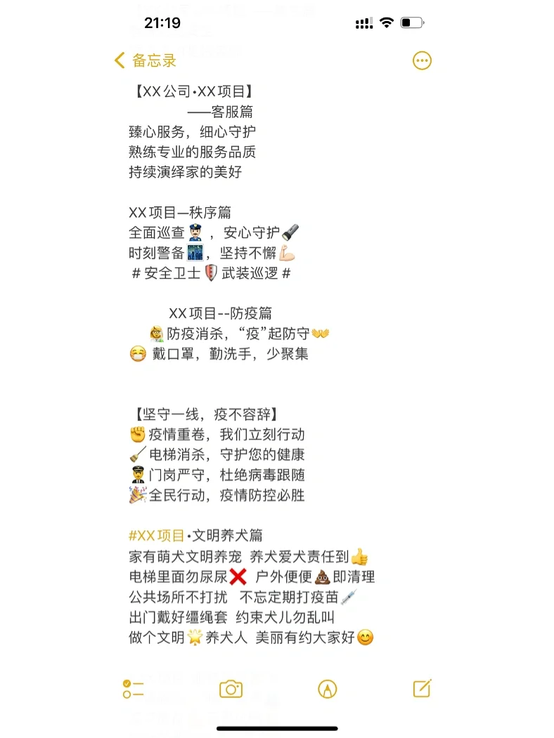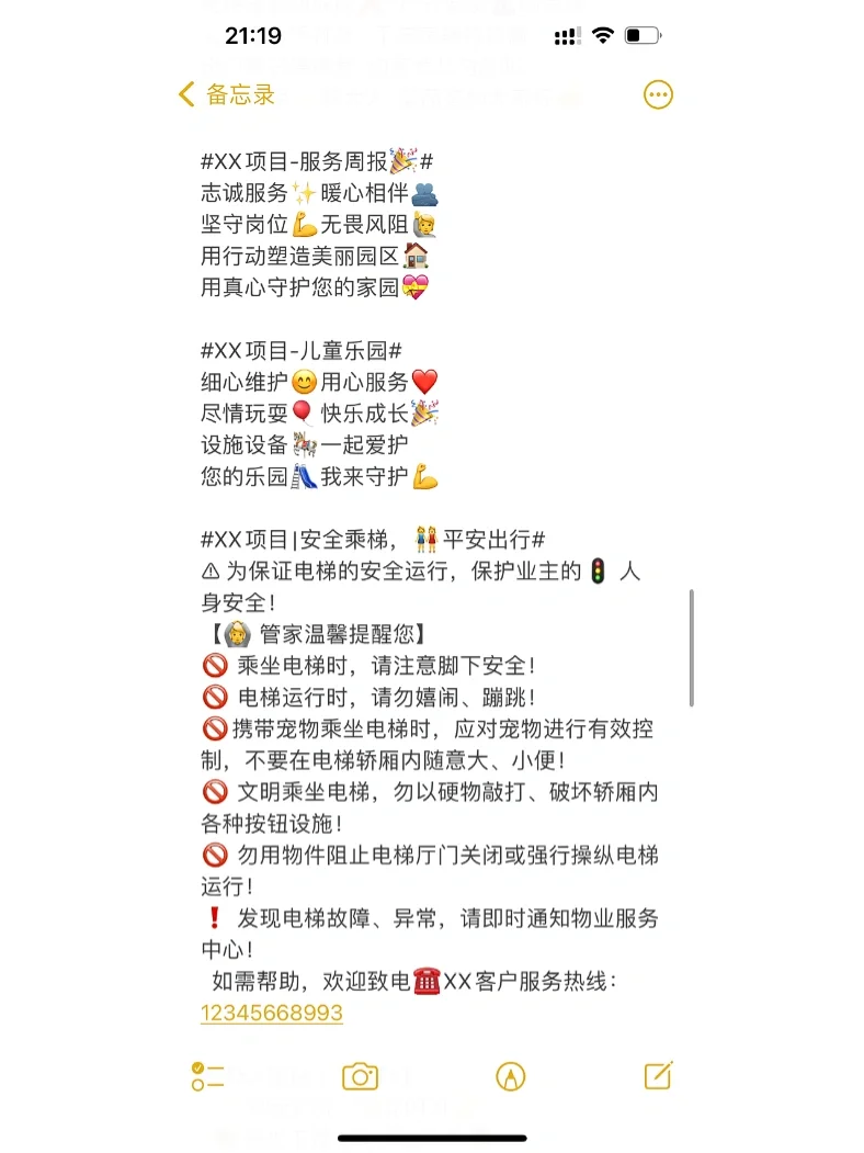天气突变时记得穿好衣服吗 您是否完全满足您的专属要求 你心里有责任感,肩上有责任感 我们会把我们的心放进你的心里,你会更暖心吗 -清洁部 清洁部门每天都清理小区里的落叶吗 关心社区每一个角落的清洁与宁静 时间在前进,时间在安静~ 你平静的微笑 这是我们继续前进的动力吗 |环境章节~ 尽职调查每天承担责任 专注于每一刻 空中地板清洁 专门负责守卫♀️ 我们永远在你身边 [专为您的生活质量而设计] 【XX公司•XX项目】 -----订单章节 保安武装巡逻 总有一盏灯为你点亮吗 有一群人在等你回家吗 成千上万的礼貌问候和安全护送 只是为了让你享受回家的时刻 |坐电梯安全吗,安全出行 确保电梯的安全运行并保护业主人身安全! [管家温馨提醒] 乘坐电梯时请注意脚部安全! 电梯运行时,请不要玩耍或跳跃! 在电梯内携带宠物时,应对宠物进行有效控制,不允许宠物在电梯轿厢内随意大小便! 文明乘坐电梯,不要用硬物敲击或损坏电梯轿厢内的各种按钮设施! 不要用物体阻止电梯厅门关闭或强行操作电梯! 如果发现任何电梯故障或异常,请立即通知物业服务中心!