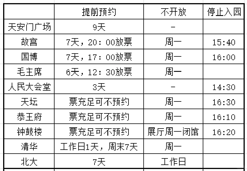 北京的许多景点都要求提前预订,而且提前时间和关闭时间也不同。我们准备了一张照片给大家看。 基本上,通过微信公众号预约是可以的。注意时间,设置闹钟,然后抢票。紫禁城、国家博物馆、毛纪念馆和人民大会堂都很紧张。由于买不到世博会的票,我不得不调整行程。 其他地方,如天坛、颐和园和圆明园,可以直接在现场购买。记得通过官方微信或迷你程序在手机上购买。 此外,天安门广场周围的整个区域都是封闭的,不能毫无保留地进入。但是,如果你已经预约了故宫、国家博物馆、毛主席纪念馆和人民大会堂,你可以避免单独预约天安门广场。如果你想看升旗仪式,你需要单独预约。