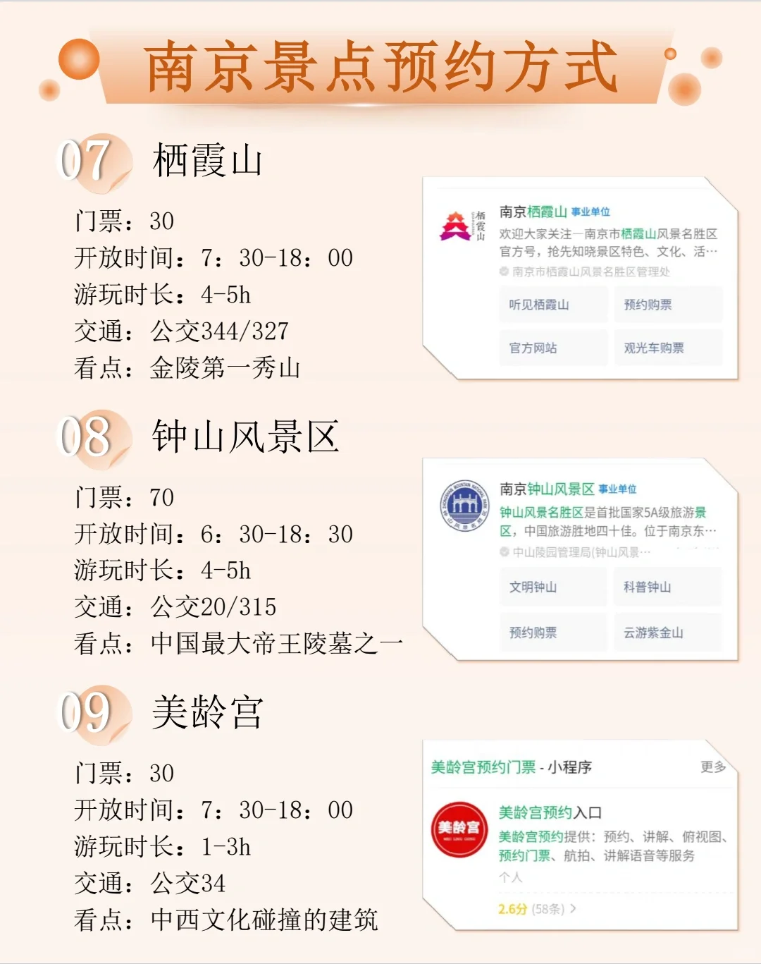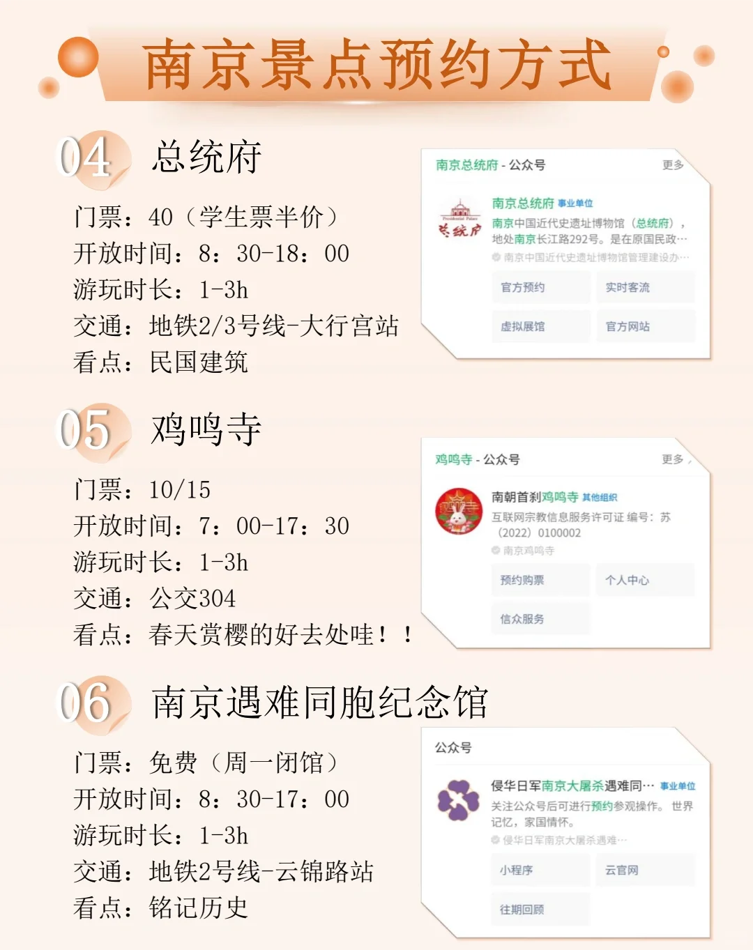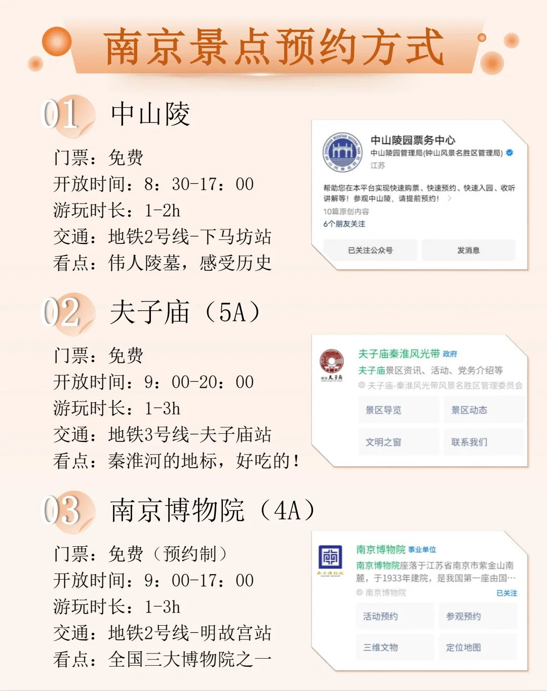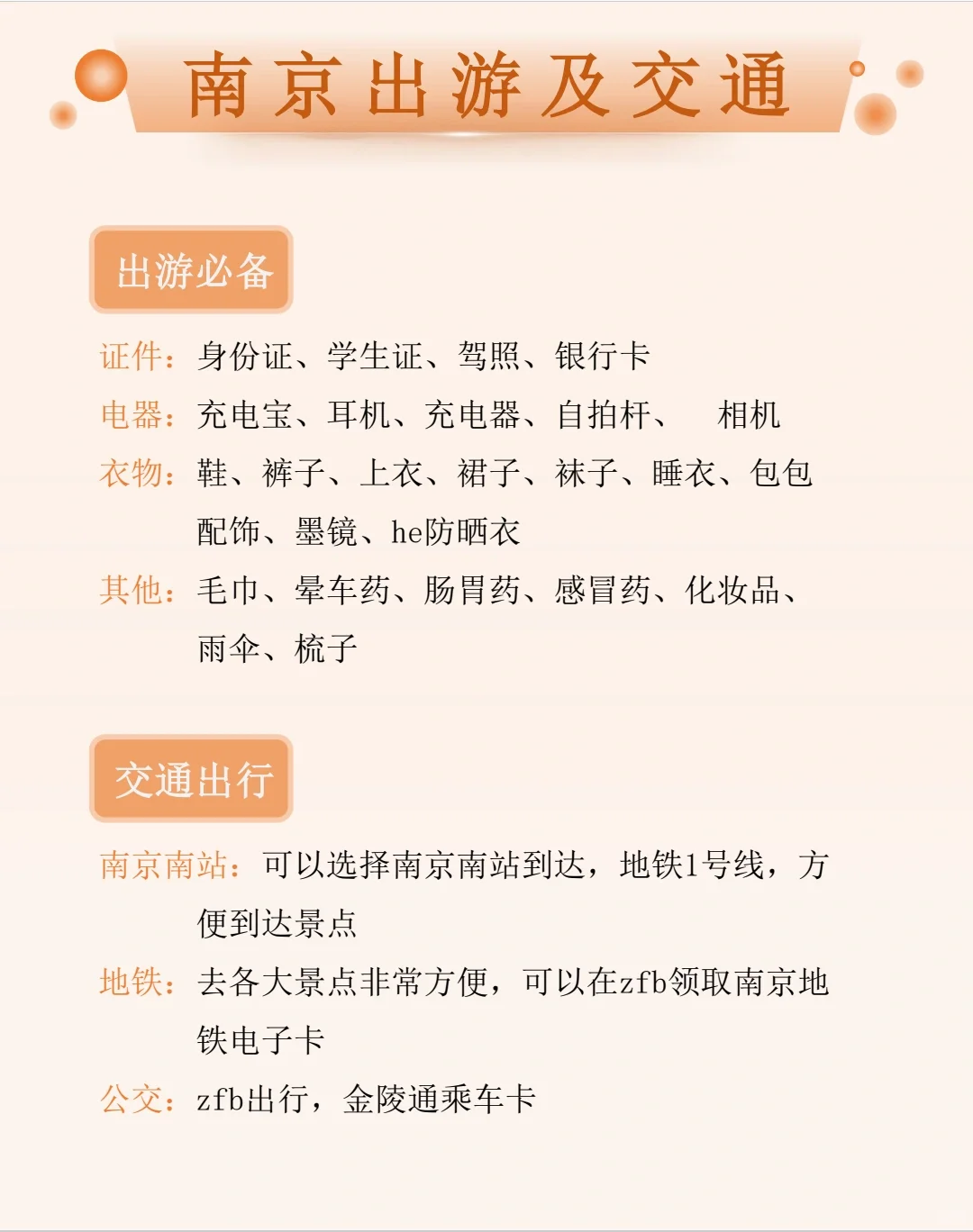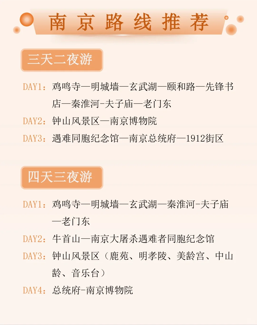 运输 南京南站:到达后乘坐地铁1号线,方便前往景点 地铁:前往主要旅游景点非常方便,您可以在ZFB领取南京地铁电子卡。旅游景点主要集中在1/2/3号线 公共交通:ZFB出行、金领通卡 住宿选择 地铁站附近:交通便利,可以通过地铁到达许多景点 新街口附近:在中心区,有很多美味的食物 孔庙附近:有很多景点,比较方便 经典路线 第一天:鸡鸣寺-明城墙-玄武湖-孔庙-东门 第二天:牛寿山——南京大屠杀遇难同胞纪念馆 第三天:中山风景名胜区(鲁园、明孝陵、美龄宫、中山陵、音乐频道) 第四天:总统府-南京博物馆 特色美食: 金陵码头俱乐部:他家专门做老南京菜,河豚也做得不错! 新芳园酒家·市集老南京菜:特别有名,年过六旬,招牌菜:老南京秘制鸭舌锅、金陵烤鸭 南京板鸭:特别有名,俗称“琵琶鸭”。它皮白肉嫩,外皮酥脆,肥而不腻。 南京烤鸭:独特的香气,酸甜可口,是南京特有的红焖烤鸭。 鸭血粉丝汤:非常有名!粉丝煮得恰到好处,汤一点也不腥味。 还有龙袍蟹饺、梅花饼、皮都面、牛肉面、牛肉锅贴、月亮包、红豆元宵等!!!
