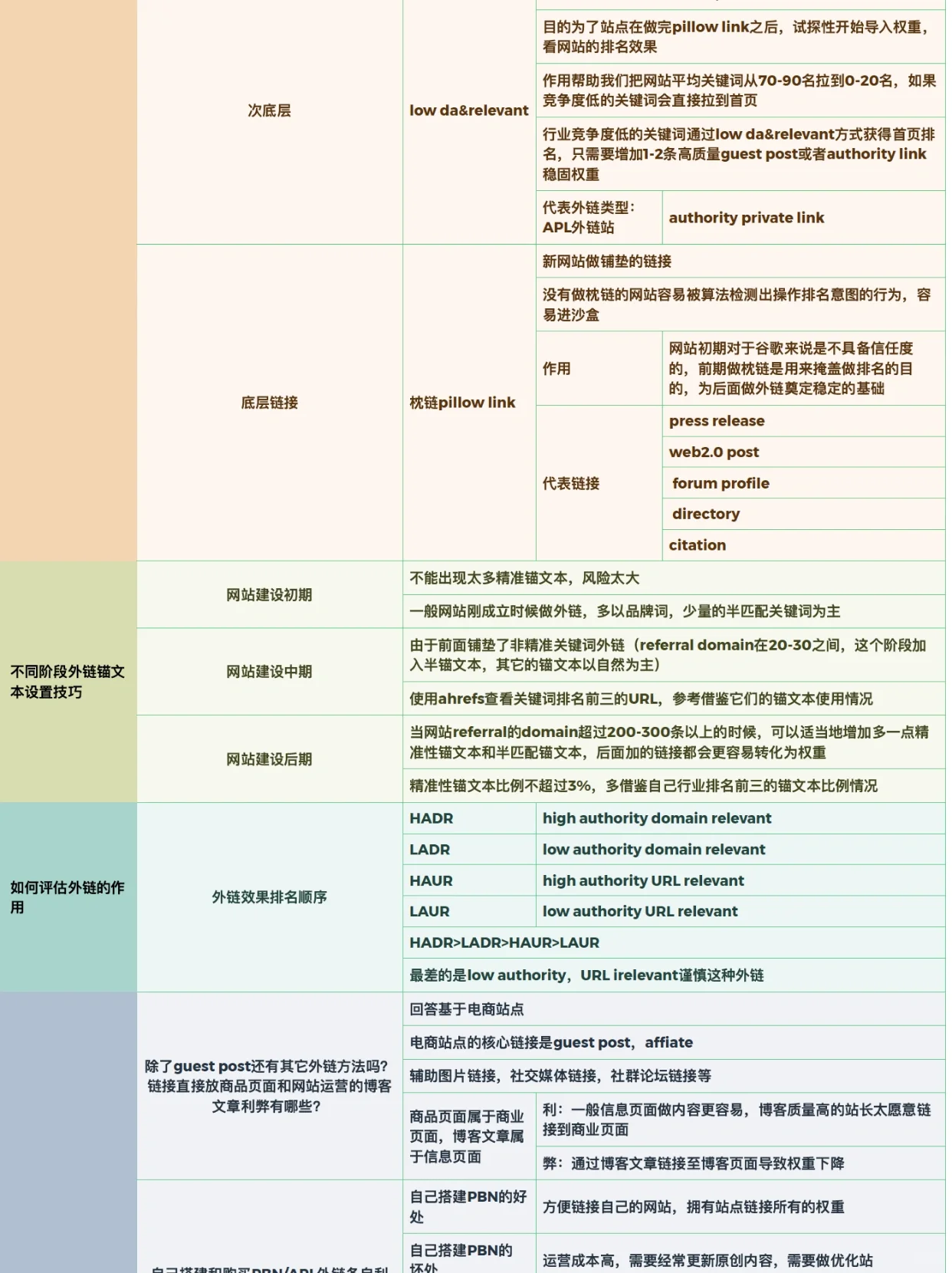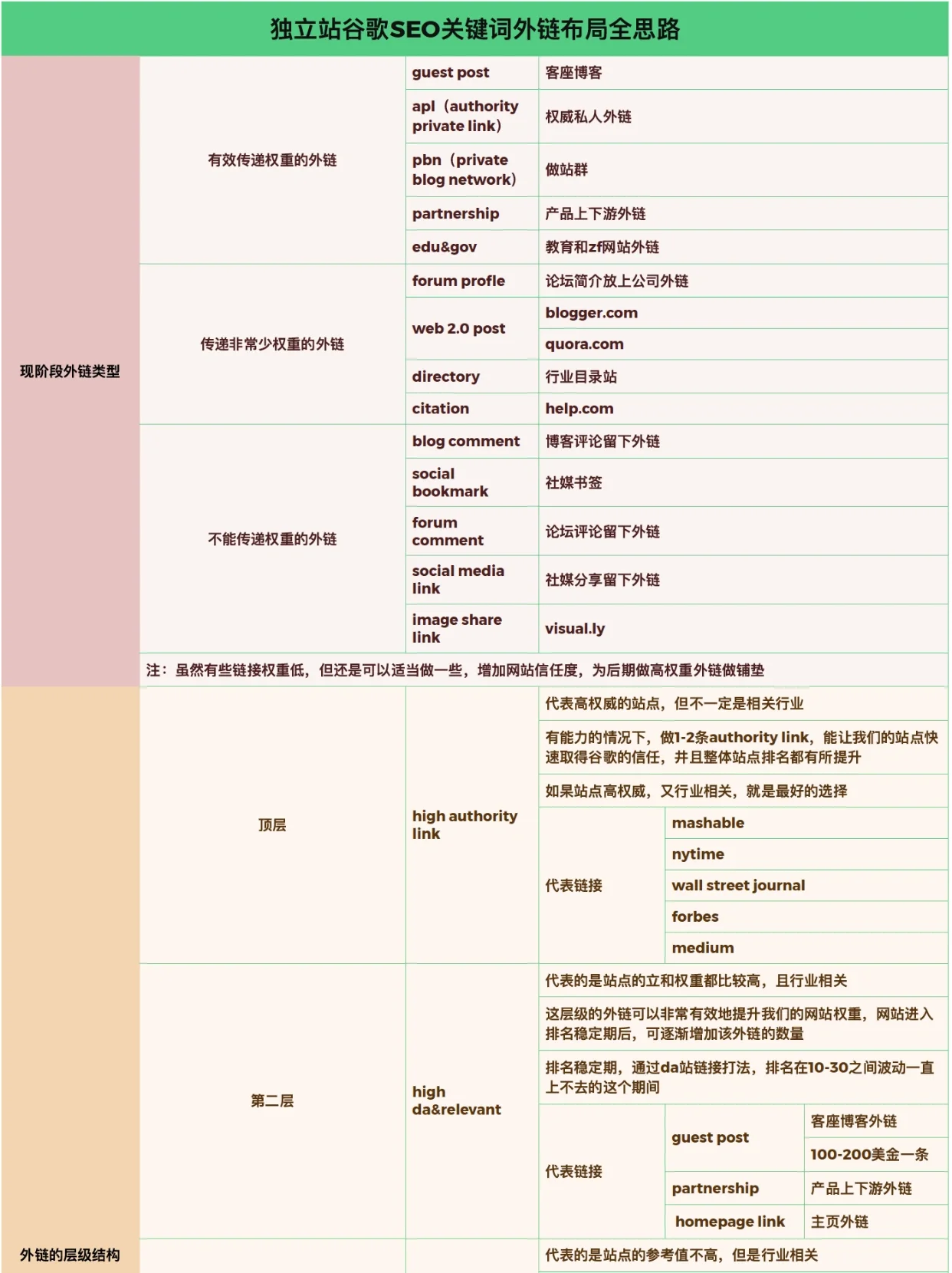 在独立的谷歌SEO过程中,我们需要优化关键词外部链接的布局,主要组织五大板块: 目前,外部链接的类型 外部链接的层次结构 在不同阶段设置外部链锚文本的提示 如何评估外部链接的作用 常见问题 具体细节请参考图片内容。此外,这里还有一份独立网站运营的全过程指南,与您分享!