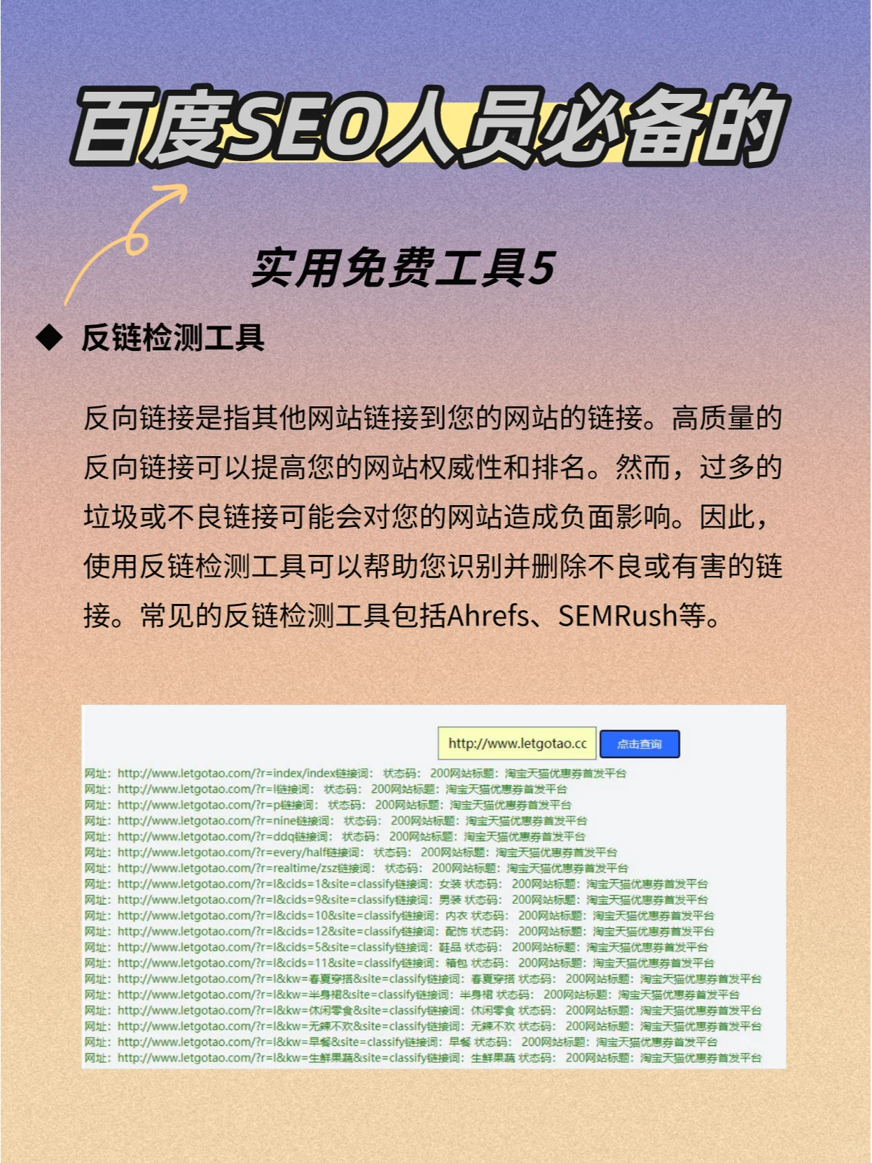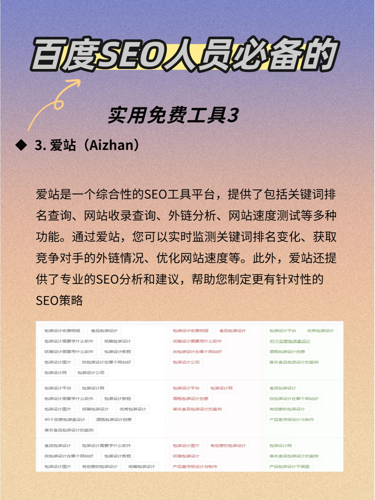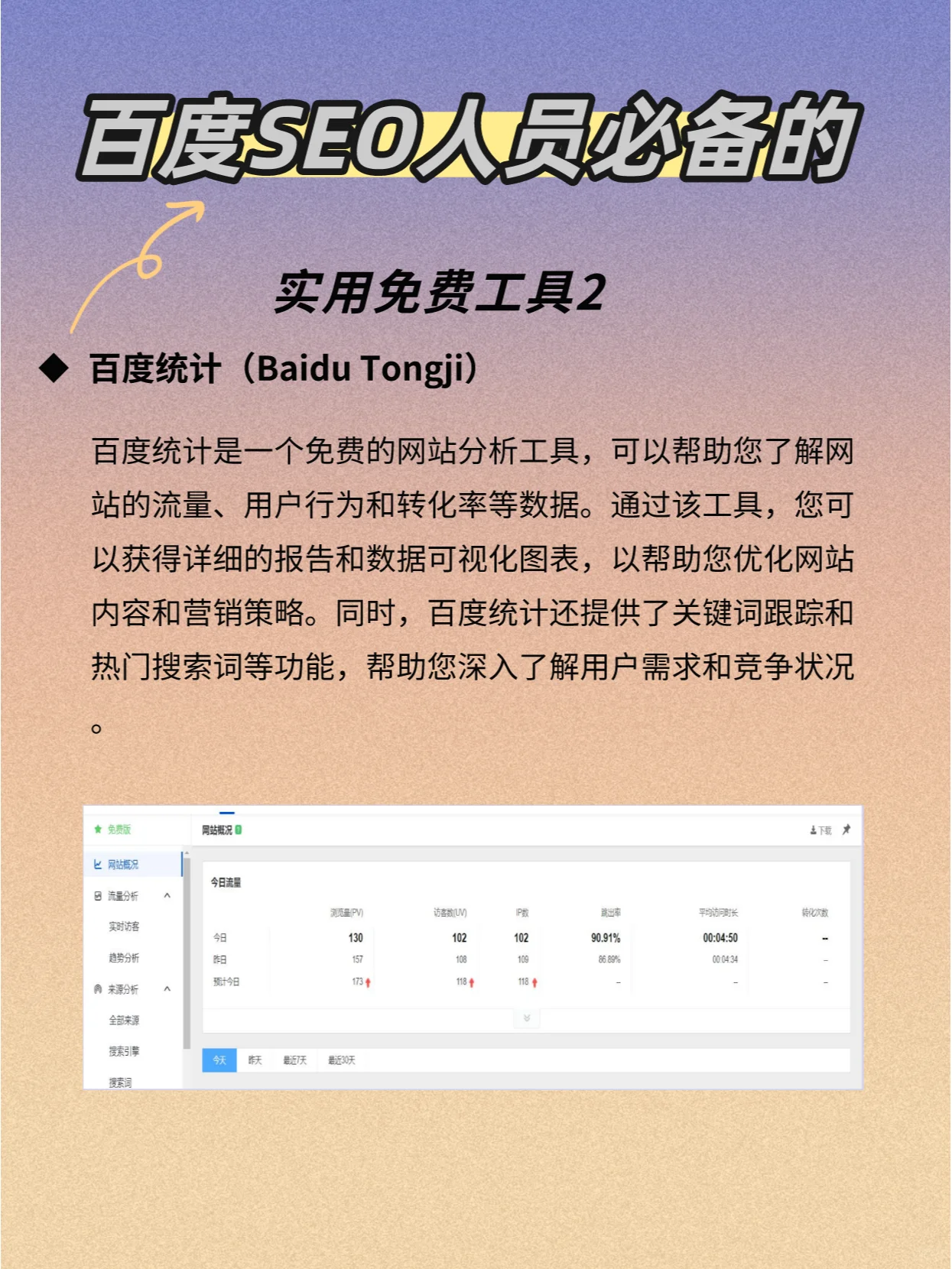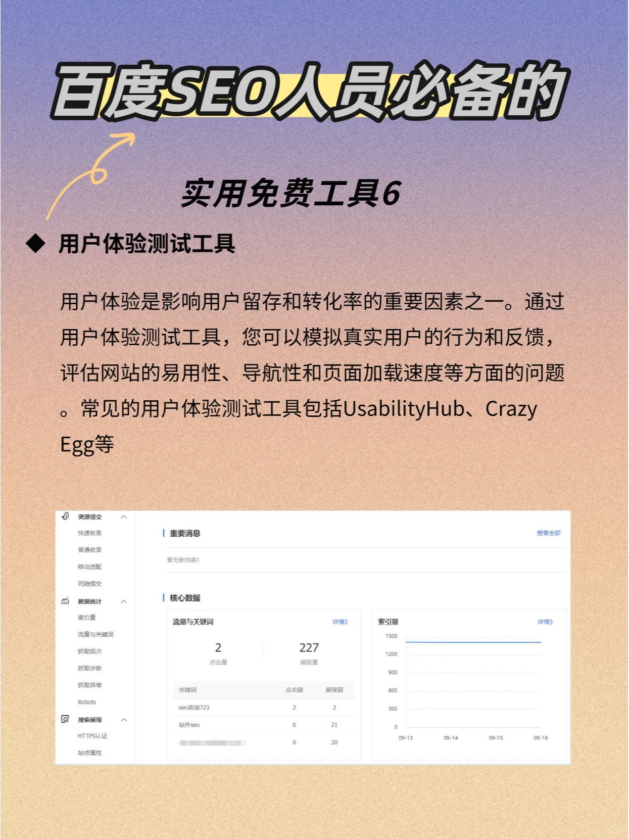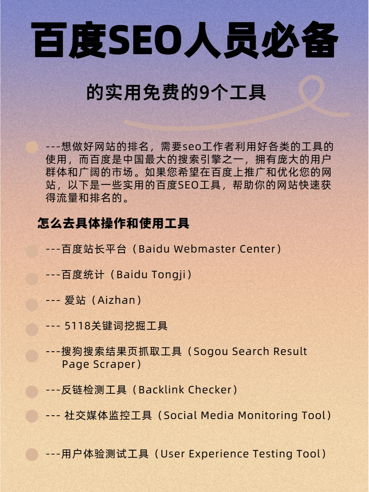 新手初学者需要掌握SEO技能和工具才能开始学习SEO 上面列出的9个超级实用的百度SEO工具可以帮助你更好地了解和优化你的网站在百度的排名和曝光率。通过正确使用这些工具,您可以改善网站的用户体验,增强安全性,提升品牌形象等能力,从而在竞争激烈的互联网市场中取得更好的效果。 有了这9个SEO人员必备的超级实用工具,学会管理网站流量和排名