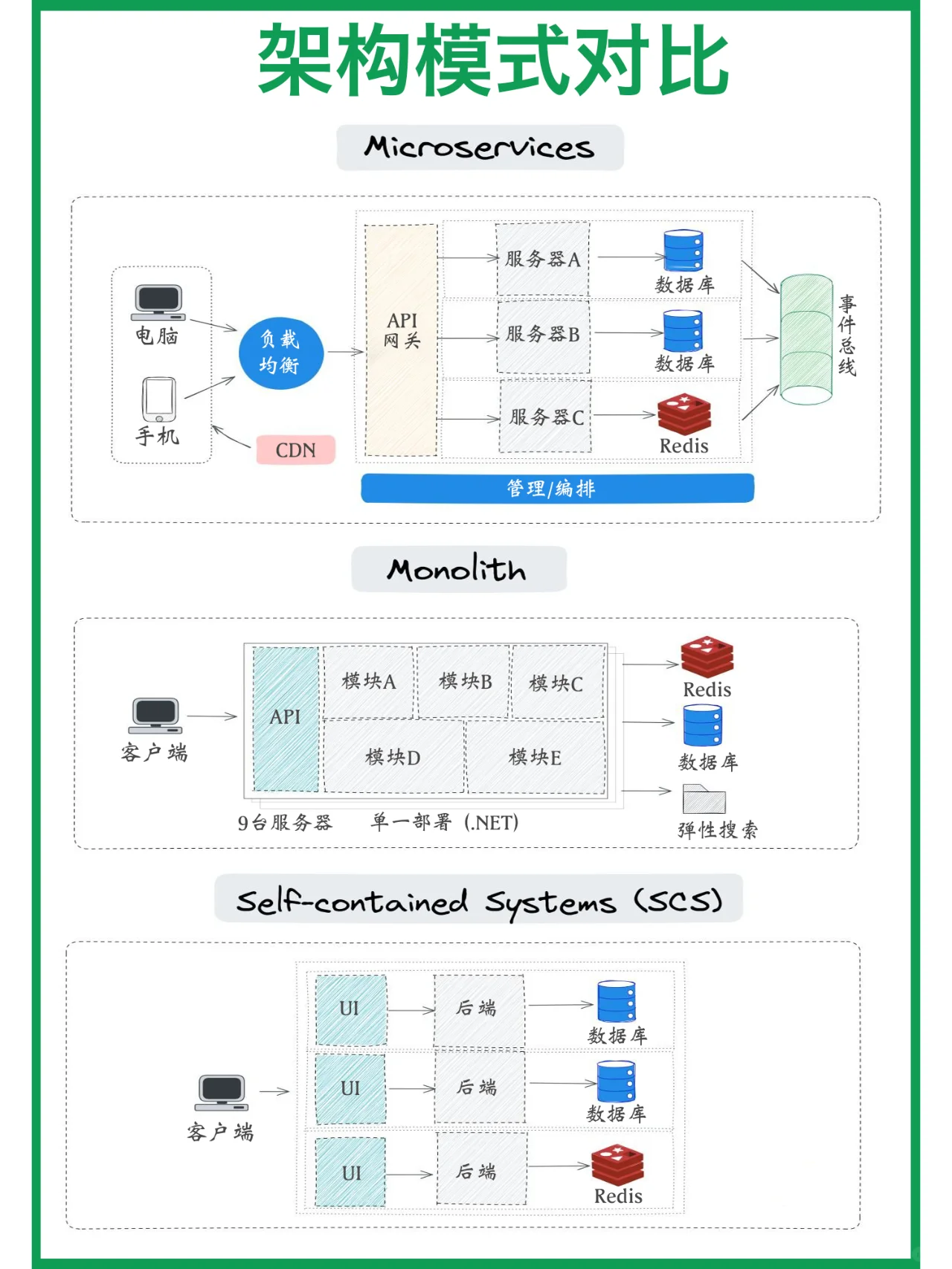 微服务将应用程序分解为一组小型、自主的服务,每个服务都专注于实现特定的业务功能。每个微服务都在一个独立的进程中运行,并通过HTTP/REST、消息队列或远程过程调用等轻量级通信机制相互通信。 微服务的特点包括:服务拆分独立部署松耦合技术多样性可扩展性容错 微服务体系结构有助于处理大型复杂的应用程序,使团队能够更好地组织、开发和维护应用程序。它提供了更好的可扩展性、灵活性和可维护性,并促进了团队协作和独立性。 Monolith是一个单片应用程序,它将应用程序作为一个单元进行开发、部署和运行。所有功能和模块都打包在一起,共享相同的代码库和数据库。这意味着整个应用程序作为单个部署单元部署到服务器。单体应用的特点包括:单个部署单元共享代码存储库和数据库紧密耦合单一技术堆栈横向扩展困难性能瓶颈。微服务体系结构通过将单个应用程序分解为一组小型、自主的服务来解决它们的一些挑战,从而提供更好的可扩展性和灵活性。 SCS是一种软件体系结构方法,它优先将应用程序分散到独立的系统中,每个系统都有自己的域逻辑、UI和数据存储。与微服务不同,较小的服务只关注业务逻辑,具有较大的SCS,并涵盖更广泛的特定领域。SCS是一个表示自主web应用程序的系统,包括web UI、业务逻辑和数据库,这些应用程序可能具有服务API。通常由一个团队所有。 这种系统的主要优势是:自主性、领域对齐、去中心化的数据管理、技术多样性、明确发布的接口和独立部署能力。该系统与域驱动设计配合良好。创建这样一个系统的第一步是领域分析,这可以通过识别与特定业务领域一致的有界上下文来完成。然后,每个有界上下文都封装在SCS中,SCS包括自己的数据管理、业务逻辑和用户界面,确保每个系统都是自主的,但在必要时可以通过明确定义的API与其他系统交互。为什么独立系统(SCS)比微服务更有优势范围更广,操作复杂性更低,数据一致性更强。