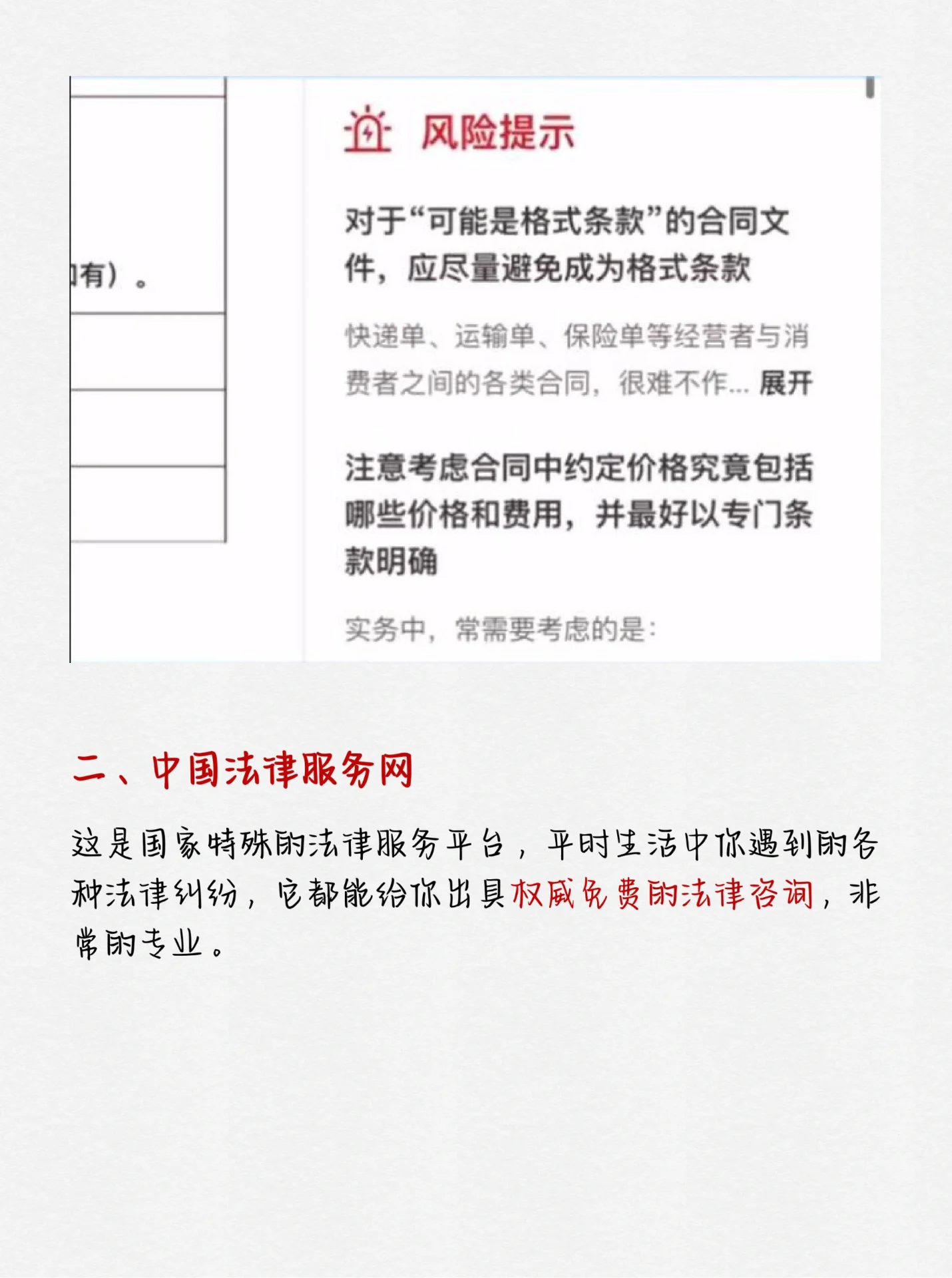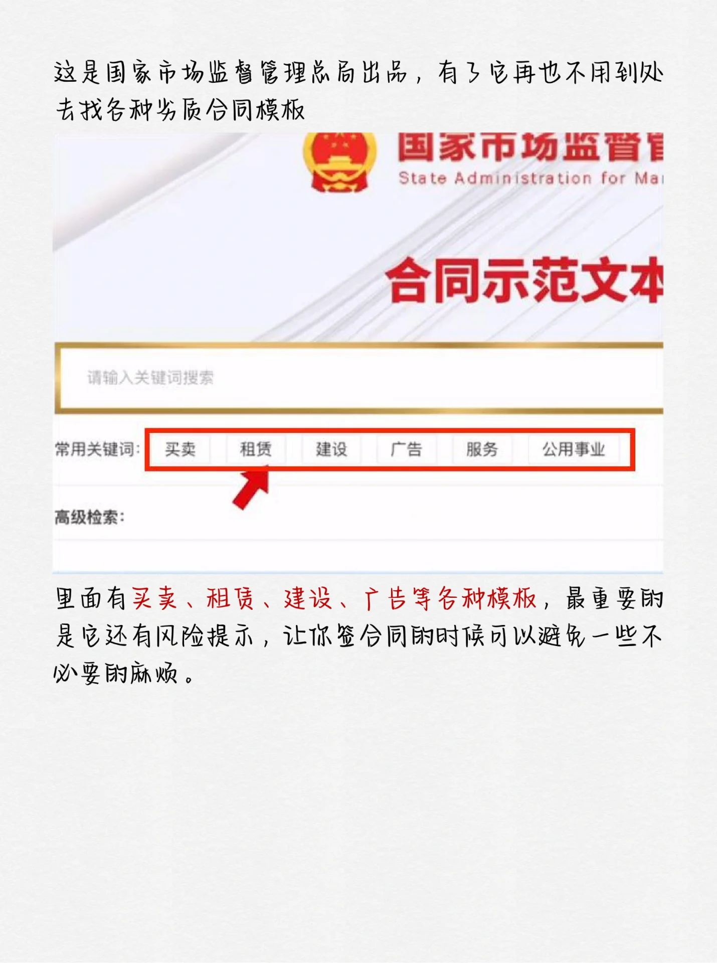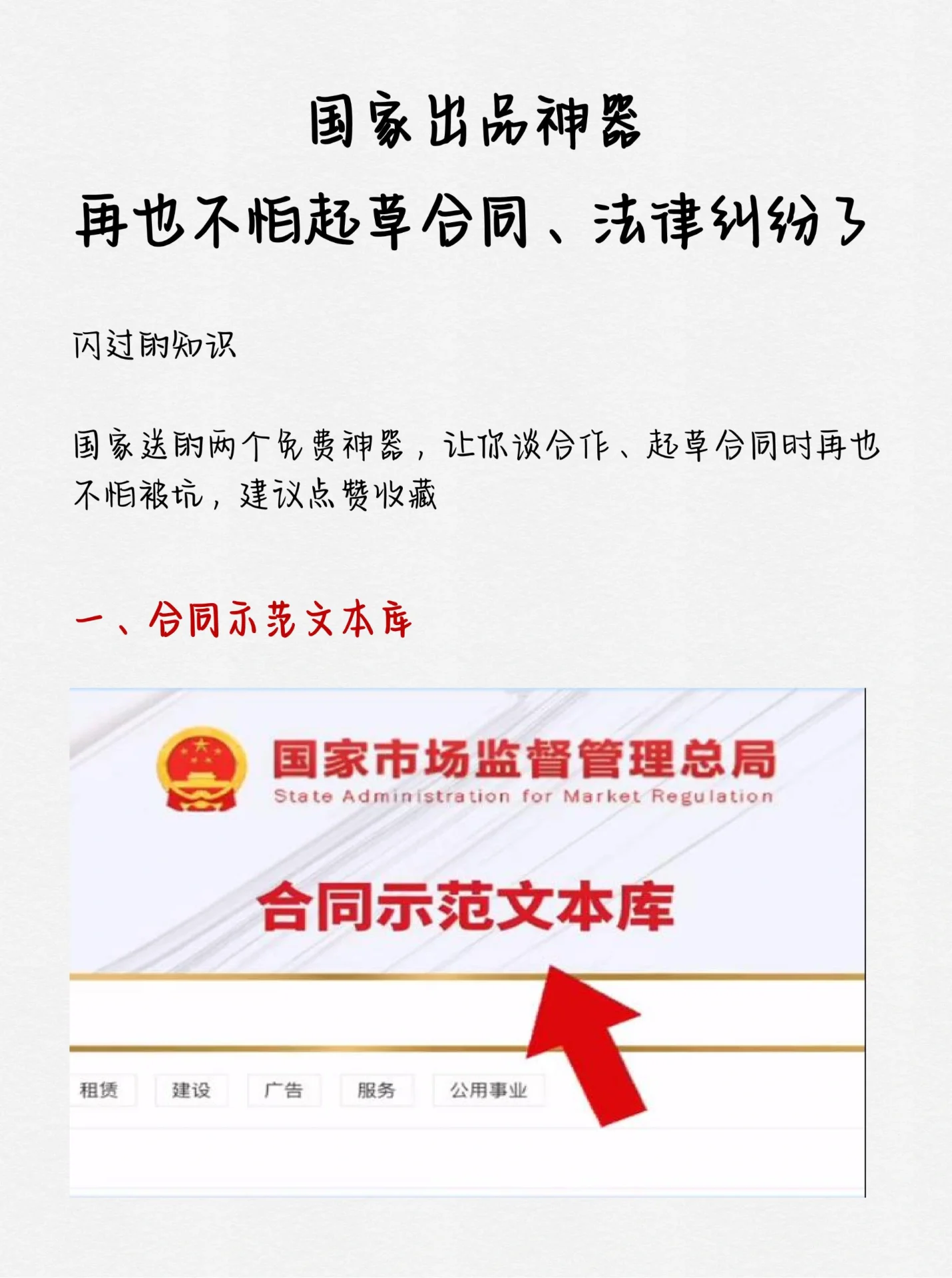 来自国家的两份免费礼物让你可以谈判合作和起草合同,而不用担心再次被骗。 合同示范文本库 这是一个国家吗由国家市场监管总局制作,有了它,再也不用到处寻找各种劣质的合同模板了 有各种各样的买卖、租赁、施工、广告模板,最重要的是,它们还有风险警告,可以帮助您在签订合同时避免不必要的麻烦。 在中间法律服务网络 这是什么一个专门的法律服务平台,可以为您在日常生活中遇到的各种法律纠纷提供权威、免费的法律咨询。非常专业。