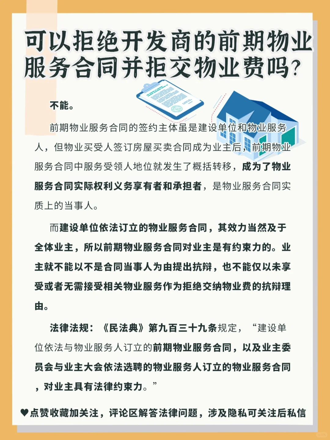 不能 虽然前期物业服务合同的签订方是建设单位和物业服务提供者,但在购房人签订房屋买卖合同并成为业主后,前期物业服务合约中服务对象的地位发生了一般性转移,成为物业服务合约的实际权利义务人和承担人,成为物业管理合约的实体当事人。 建设单位依法签订的物业服务合同自然延伸到所有业主,因此前期物业服务合同对业主具有约束力。业主不能以自己不是合同当事人为由提出异议,也不能以没有享受或不需要接受相关物业服务为由简单拒绝支付物业费。 法律规定:《民法典》第939条规定:“建设单位与物业服务提供者依法签订的前期物业服务合同,以及业主委员会、业主大会依法选定的物业服务提供者签订的物业服务合同对业主具有法律约束力。” 有关更多法律问题,请继续留言。