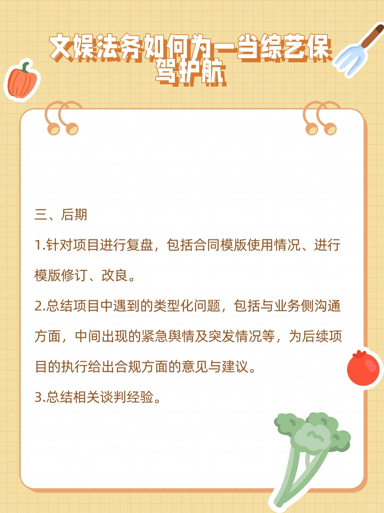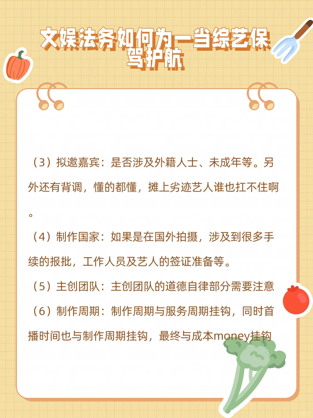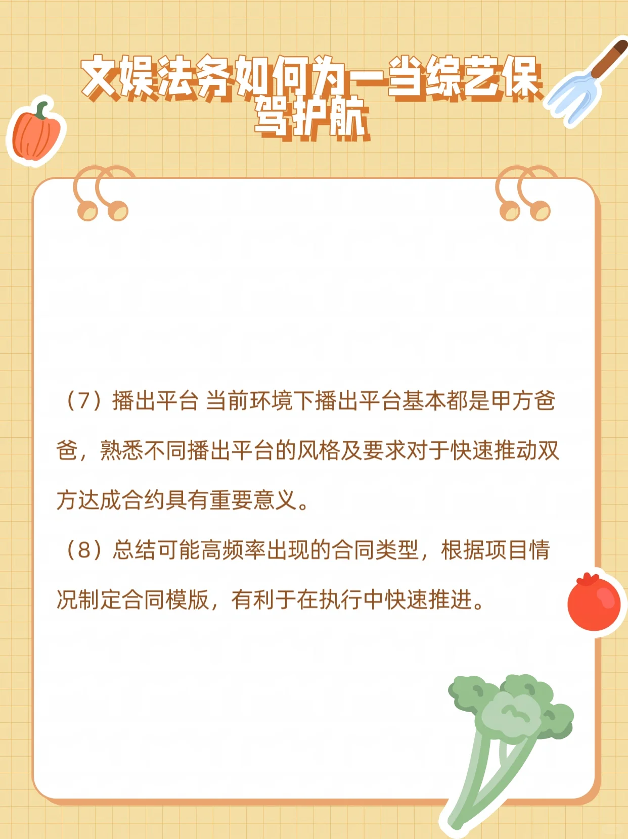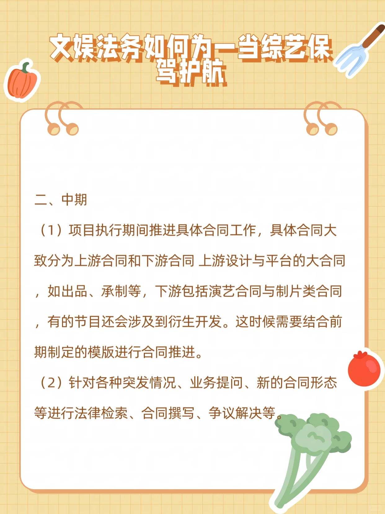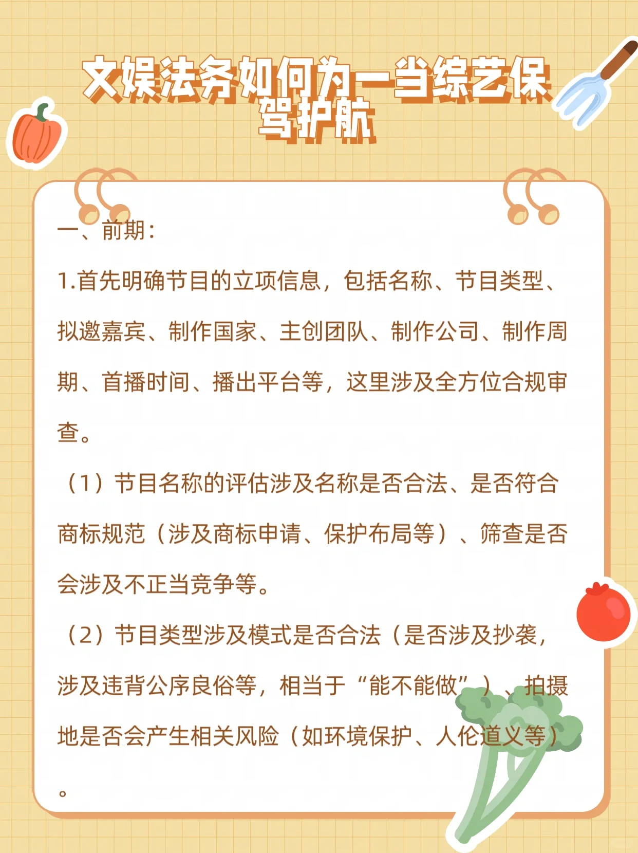 1、 早期阶段: 首先,明确节目类型和项目信息,包括名称、节目类型、邀请嘉宾、制作国家、主创团队、制作公司、制作周期、首播时间、播出平台等。这涉及到全面的合规性审查。 (1) 节目名称的评估包括名称是否合法,是否符合商标规定(涉及商标申请、保护布局等),以及是否会涉及不正当竞争。 (2) 节目类型是否涉及模式的合法性(是否涉及抄袭,是否违反公序良俗等,相当于“能不能做”),拍摄地点是否会产生相关风险(如环保、伦理道德等)。 (3) 预定嘉宾:是否涉及外籍人士、未成年人等。此外,还有背景音,大家都理解。没有人能抵得住街头那些表演不好的艺术家。 (4) 制作国:如果在国外拍摄,需要很多程序,如审批、工作人员和艺术家的签证准备等。 (5) 主创团队:主创团队的道德和自律方面需要注意 (6) 制作周期:制作周期与服务周期挂钩,首映时间也与制作周期挂钩,最终与资金成本挂钩 (7) 在目前的广播平台环境下,大多数广播平台都是甲方之父。熟悉不同广播平台的风格和要求,对于迅速推动双方达成合同具有重要意义。 (8) 总结可能频繁发生的合同类型,并根据项目情况开发合同模板,有助于快速执行。 2、 中期 (1) 在项目执行期间,将推动具体的合同工作,大致可分为上游合同和下游合同。将执行上游设计和平台合同,如生产和承包合同。下游合同包括娱乐合同和制作合同,一些节目还可能涉及衍生品开发。在这一点上,有必要结合早期开发的模板来推进合同。 (2) 针对各种突发情况、业务查询和新合同形式进行法律搜索、合同撰写和争议解决。 3、 后期 1.对项目进行审查,包括合同模板的使用、模板修订和改进。 2.总结项目中遇到的类型问题,包括与业务方的沟通、紧急舆论和可能出现的意外情况,并为项目的后续实施提供合规意见和建议。 3、总结相关谈判经验。