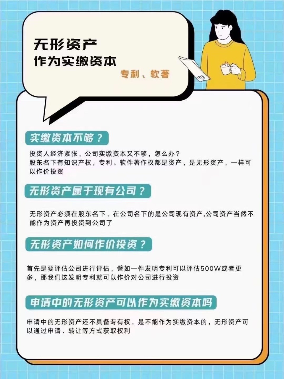 如何进行无形资产入资,交哪些税费? 最近《新公司法》修正案一经公布,很多朋友来问无形资产入资的问题,今天集中给大家讲解 下无形资产入资。 无形资产是什么? 首先无形资产也叫知识产权,公司法规定股东可以拿知识产权来出资 知识产权主要指的是什么呢? 主要包括专利权、商标权以及著册权,这三个都是有证书的, 还有1种其实也属于知识产权即专有技术,专有技术没有统一的登记证书,通常不太好界定。 2、无形资产入资的流程 知识产权出资的 一般流程,自然人股东知识产权出资首先知识产权应该登记在自然人的名下。 其次对无形资产进行评估: 第三从自然人到公司名下完成过户; 第四,验资。 以上就是完整的无形资产入资的流程。 3 无形资产入资有哪些税费? 很多老板最关心的就是无形资产出资涉及到的稅费。 1、增值稅 自然人股东用知识产权进行投资,首先要涉及到增值税。我们投资视同销售,从自然人股东到公 司名下视同销售 要缴纳增值税。自然人视同小规模纳税人,增值税税率是 1%,需要到税务机关代开发票,之后公 司才可以入账摊销。 2、印花稅 第二个就是印花税,投资要进行一个过户手续,涉及到一个产权转移登记,产权转移登记有5%的印花税,目前印花税有优惠政策,减半征收。 3、个人所得税 个人将知识产权投入到公司视同销售,按照财产转让所得来缴纳个人所得税,税率是 20%。 比如你申请的这个专利是个人申请的,没有什么成本,就几百块钱的申请费。评估后100万元,投 入到公司作为注册资本,就产生将近100万的转让所得,有20%的个人所得税。 4、个人所得税什么时候交呢? 目前有两个递延纳税政策。 第1个就是可以视同非货币性资产转让所得,按照五年纳税期限交个人所得税,也就是个税分五年来交清。 第二个就是知识产权入股,个人所得税递延纳税的政策。就是投资的时候不交,将来股权又转让给别人,按你的股权转让收入来缴纳个人所得税。 【无形资产实缴操作步骤】: 1股东会决议:确定股东以无形资产出资并获得股东会认可。 2评估无形资产价值:请专业的评估机构对无形资产进行评估,以确定其价值。 3签订出资协议:股东之间需要签订出资协议,明确各自的权利和义务。 4办理财产转移手续:将无形资产的所有权转移至公司名下。 5出具验资报告:请专业的验资机构出具验资报告,证明无形资产已经完成实缴。 6修改公司章程:将无形资产的出资方式、出资额度、时间等写入公司章程。 7办理工商备案登记:准备相关资料,在工商部门进行备案登记。 8企业公示系统变更:完成公示系统中的相关信息变更。 整个过程中需要遵循相关法律法规和政策规定,确保合法合规。 你还有什么无形资产入资的问题,欢迎联系我们!