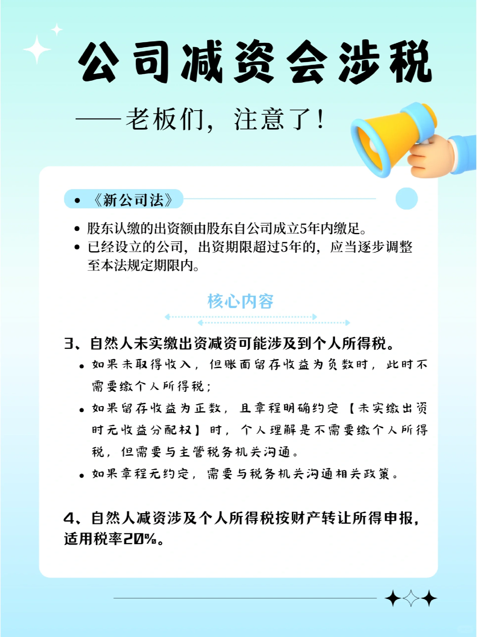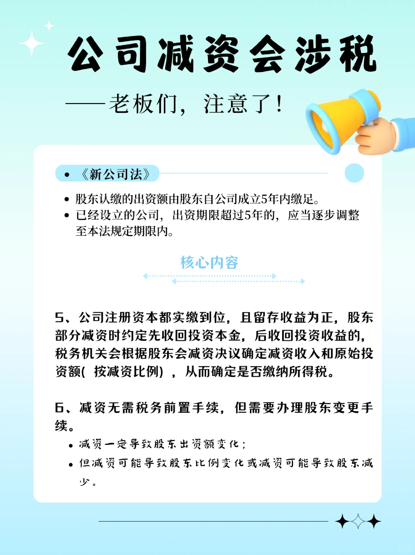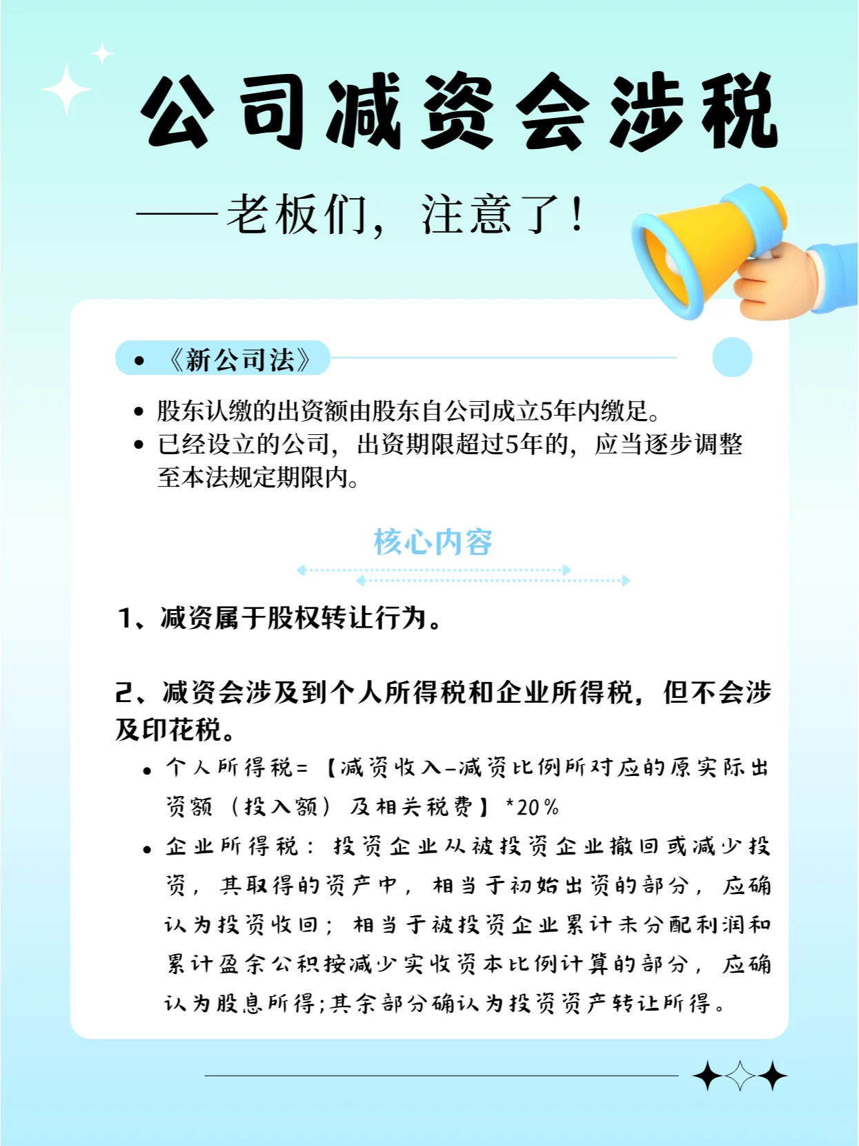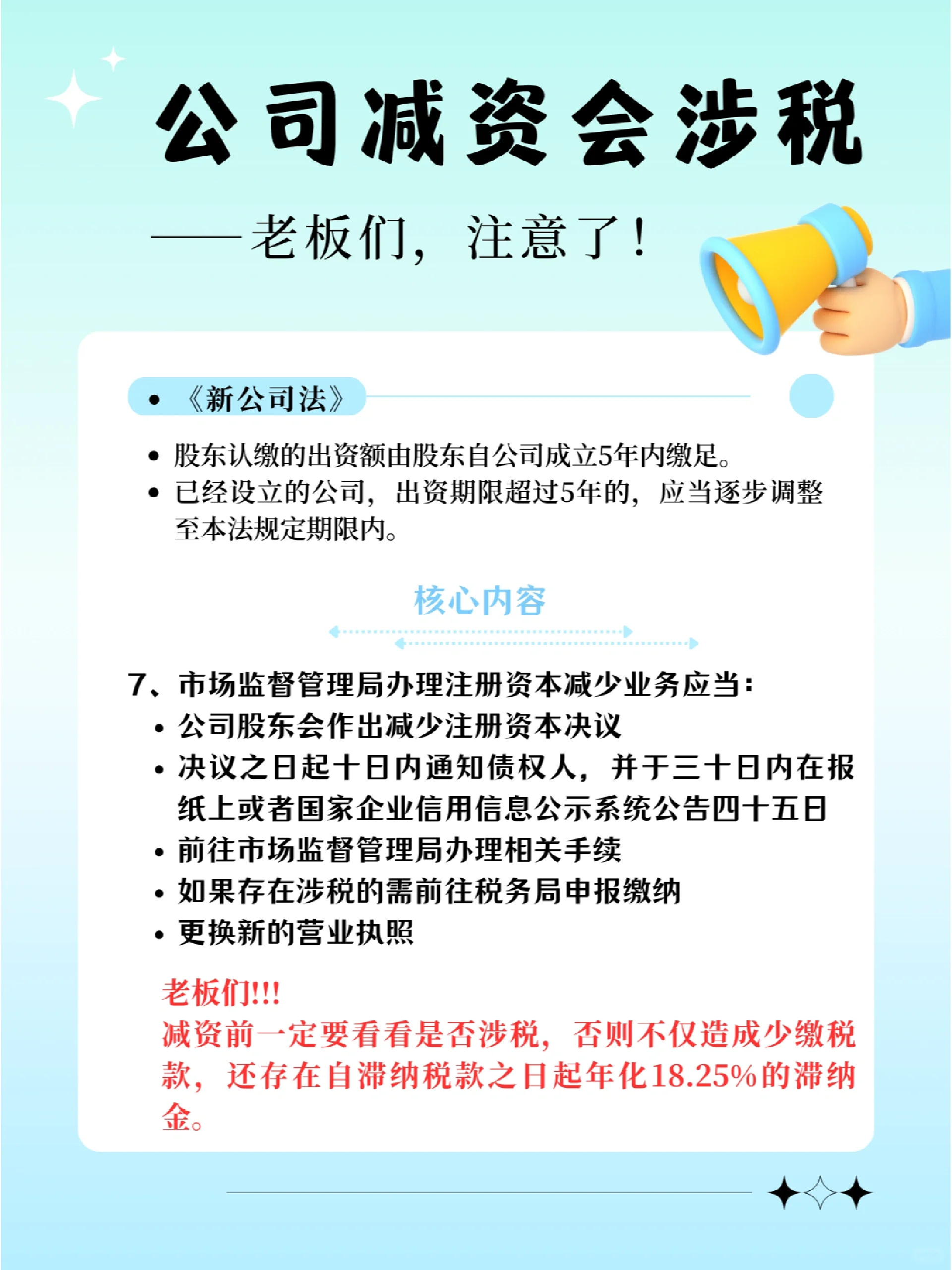 新修订的《公司法》明确规定: 股东认缴的出资额应当自公司成立之日起5年内缴足; 已设立的公司的出资期限超过五年的,应当逐步调整为本法规定的出资期限。 以至于许多在认缴制度下没有完成实际出资的企业开始减少资本 但由于缺乏减持注册资本的税务前置程序,多数人认为,整个流程只需到市场监督管理局办理减持注册资金业务即可。 完全无视税收问题 将税务风险留给未来解决, 这是关于再次纳税 又是滞纳金, 还有罚款,得不偿失 : : 那么 在减少资本之前,记得检查是否涉及纳税,以避免税务风险! 在减资期间,请记住遵守通知债权人的相关程序,以避免法律风险! 如果涉及到非货币性资产的减少,就要做好税收筹划!