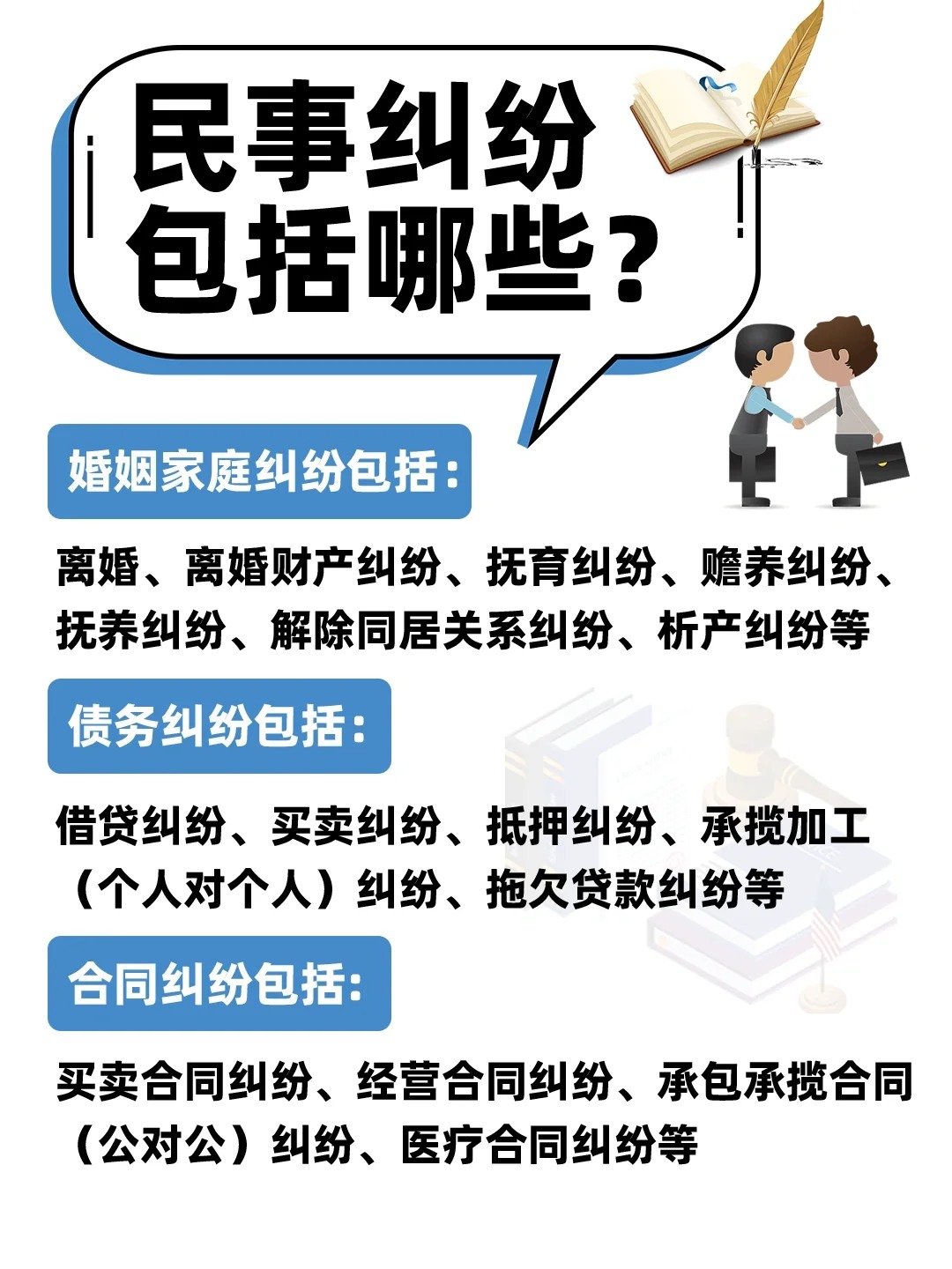 民事纠纷属于友友们平常接触较多的法律案件,像婚姻纠纷、债务纠纷、合同纠纷都是比较常见且个人较难处理的。 那么,常见的民事纠纷包括哪些呢 1.婚姻家庭纠纷包括: 离婚、离婚财产纠纷、抚育纠纷、赡养纠纷、抚养纠纷、解除同居关系纠纷、析产纠纷等 这些问题常常涉及到无尽的痛苦和争吵,给当事人带来沉重的负担和精神压力。不管是初婚还是再婚,婚姻家庭问题都可能随时出现。有时候,我们无法预测和避免这些纠纷的发生,但我们可以做好心理准备和积极应对。 2.债务纠纷包括: 借贷纠纷、买卖纠纷、抵押纠纷、承揽加工(个人对个人)纠纷、拖欠贷款纠纷等 无论是个人还是企业,债务问题都是一个非常敏感且具有挑战性的领域。有时候,因为债务问题,人们可能会面临经济危机甚至破产。因此,了解债务纠纷的处理方式和规避风险的方法是非常重要的。 3.合同纠纷包括: 买卖合同纠纷、经营合同纠纷、承包承揽合同(公对公)纠纷、医疗合同纠纷等 合同作为一种法律约束力的文件,对于双方的权益具有重要意义。然而,由于双方的理解和执行不同,合同纠纷时有发生。因此,了解合同的法律规定和注意事项,可以帮助我们更好地维护自己的合法权益。 而发生了民事纠纷后有四种解决方式,不是一定要对簿公堂的,如下所示: 1.和解:纠纷当事人就民事纠纷自行协商并达成协议,从而消灭争议。 2.调解:(诉讼外调解)由第三方就纠纷对双方当事人进行调停、说和,从而解决纠纷。 注意:调解协议不具有强制执行力,但具有法律效力,可以根据调解协议进行起诉。如果法院根据调解协议制定了调解书并经过双方确认,就不能再次起诉,但可以根据调解书申请强制执行。 3.仲裁:财产纠纷双方当事人达成协议,将纠纷提交仲裁委员会予以裁决。裁决书具有法律约束力、强制执行力。 4.民事诉讼:通过人民法院在平等主体之间行使国家审判权,解决平等主体之间民事权利义务纠纷,我们平时所说的“去法院告他”就是指这种方式。 以上四种解决途径并不是割裂而独立存在的,可以同时选择两种以上方式解决矛盾和纠纷,法律上也规定了一些特殊案件必须以一种解决方式作为另一种途径开启的前置程序。