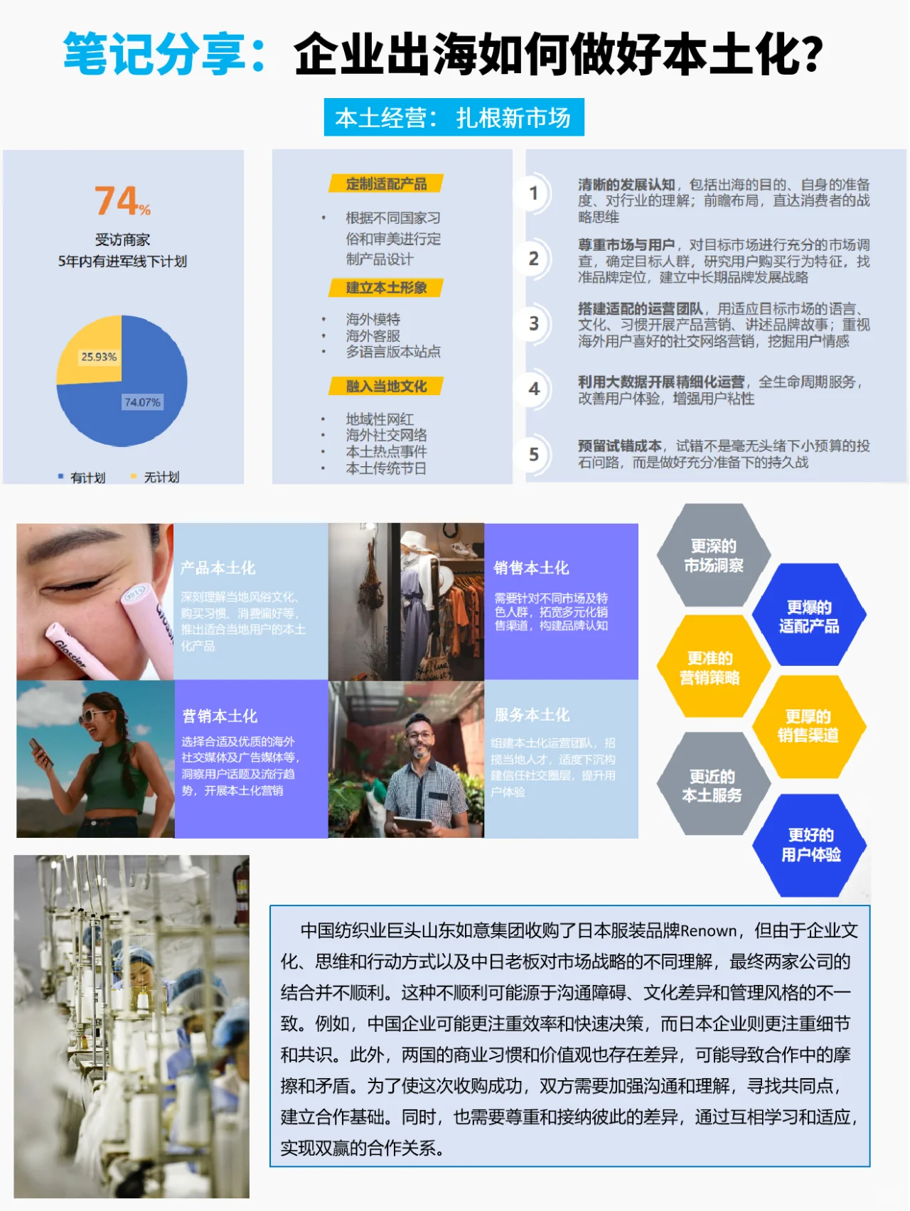 本地化具体涉及哪些方面 ① 产品本地化:深入了解当地风俗文化、购买习惯、消费偏好等,推出适合当地用户的本地化产品 ② 销售本地化:要拓展多元化的销售渠道,针对不同的市场和特色群体建立品牌知名度 ③ 营销本地化:选择合适、优质的海外社交媒体和广告媒体,洞察用户话题和趋势,进行本地化营销 ④ 服务本地化:建立本地化运营团队,招募本土人才,适度下沉打造信任社交圈,提升用户体验 本地化管理应该做些什么 ① 清晰的发展意识,包括出国目的、自身准备、对行业的了解;前瞻性布局和直接触及消费者的战略思维 ② 尊重市场和用户,对目标市场进行充分的市场调研,确定目标受众,研究用户购买行为特征,确定品牌定位,制定中长期品牌发展战略 ③ 建立一支适应的运营团队,以适合目标市场的语言、文化和习惯进行产品营销并讲述品牌故事;重视海外用户偏好并探索用户情绪的社交网络营销 ④ 利用大数据进行精细化运营,提供全生命周期服务,提升用户体验,增强用户粘性 ⑤ 储备试错成本,试错不是没有清晰思路的小预算,而是有充分准备的持久战 本地化方法 ① 定制化适配产品:根据不同的民族风俗和审美设计定制化产品 ② 建立本地映像 ·海外车型 ·海外客户服务 ·多语言版本网站 ③ 融入当地文化 ·区域网红 ·海外社交网络 ·当地热点事件 ·当地传统节日 总之,企业海外业务本地化的重要性在于更好地了解当地市场,建立本地化渠道,适应当地竞争,提高企业形象和品牌知名度,遵守监管操作。只有通过本地化经营,企业才能在国际市场上取得成功。