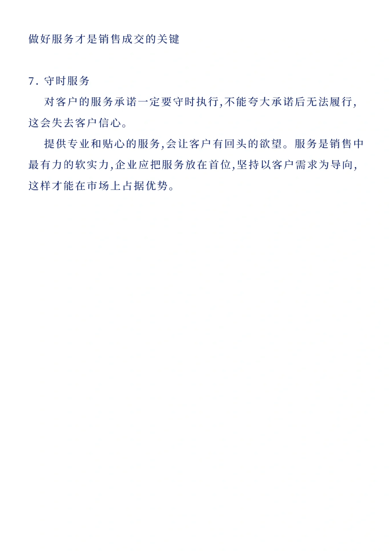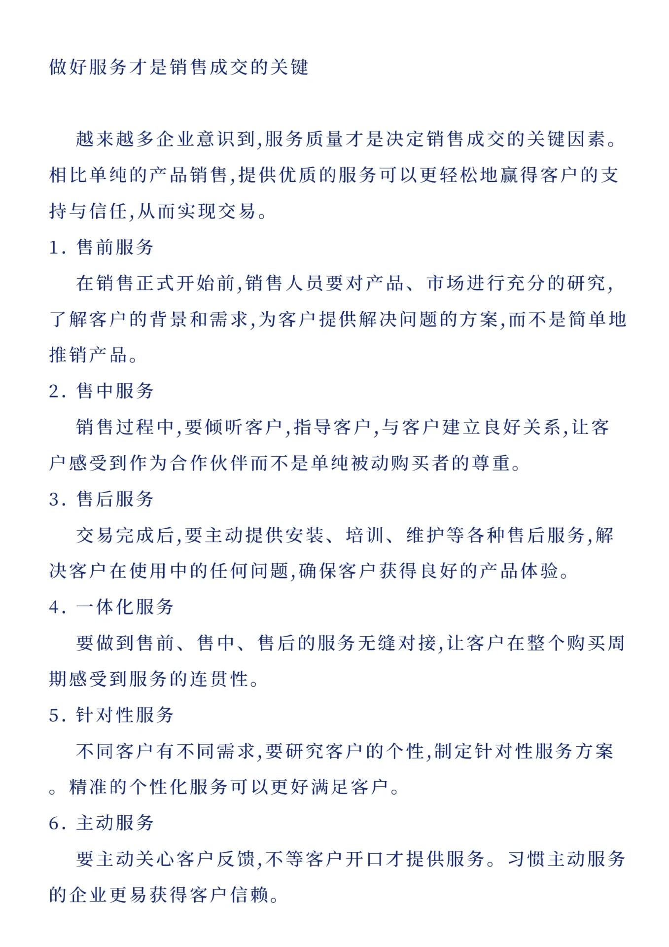 越来越多的公司意识到服务质量是决定销售和交易的关键因素。与简单的产品销售相比,提供高质量的服务更容易赢得客户的支持和信任,从而实现交易。 一⃣ 在正式开始销售之前,销售人员应该对产品和市场进行彻底的研究,了解客户的背景和需求,并为他们的问题提供解决方案,而不是简单地推销产品。 二⃣ 在销售服务的销售过程中,重要的是倾听客户的意见,引导他们,与他们建立良好的关系,让他们感觉到作为合作伙伴而不是被动买家的尊重。 三⃣ 在完成售后服务交易后,需要主动提供安装、培训、维护等各种售后服务,以解决客户在使用过程中可能遇到的任何问题,确保客户获得良好的产品体验。 四⃣ 集成服务应实现售前、售中和售后服务的无缝集成,让客户在整个购买周期中感受到服务的连续性。 五⃣ 针对性服务:不同的客户有不同的需求,有必要研究他们的个性并制定有针对性的服务计划。精准的个性化服务可以更好地满足客户的需求。 六⃣ 主动式服务需要积极关心客户的反馈,等待客户发言后再提供服务。习惯于主动服务的企业更有可能获得客户的信任。 七⃣ 及时服务需要及时履行客户服务承诺,不能夸大无法兑现的承诺,因为这会失去客户的信心。提供专业周到的服务会让客户产生回头的欲望。 服务是销售中最强大的软实力,企业应优先考虑服务,坚持以客户需求为导向,才能在市场中占据优势。