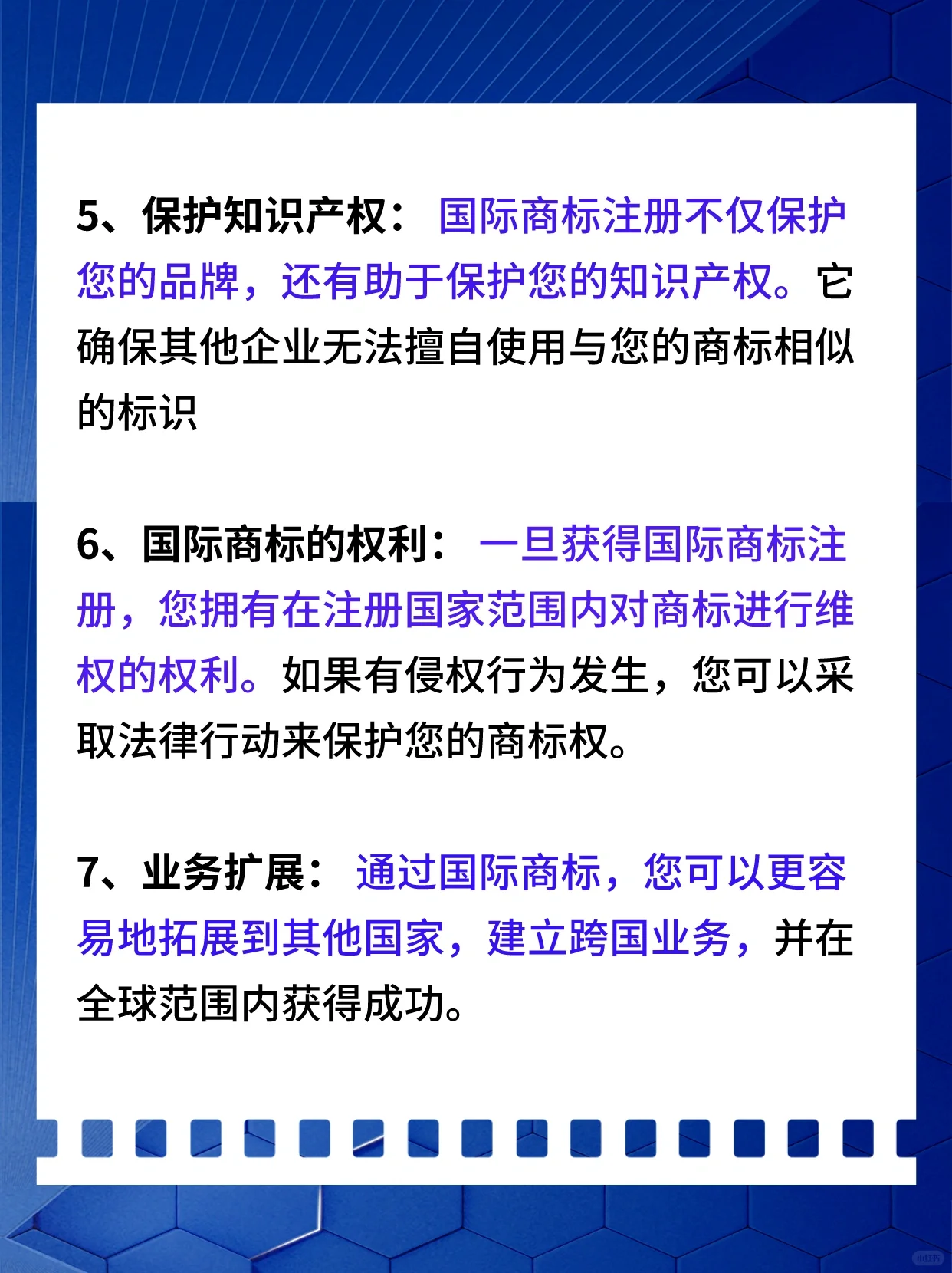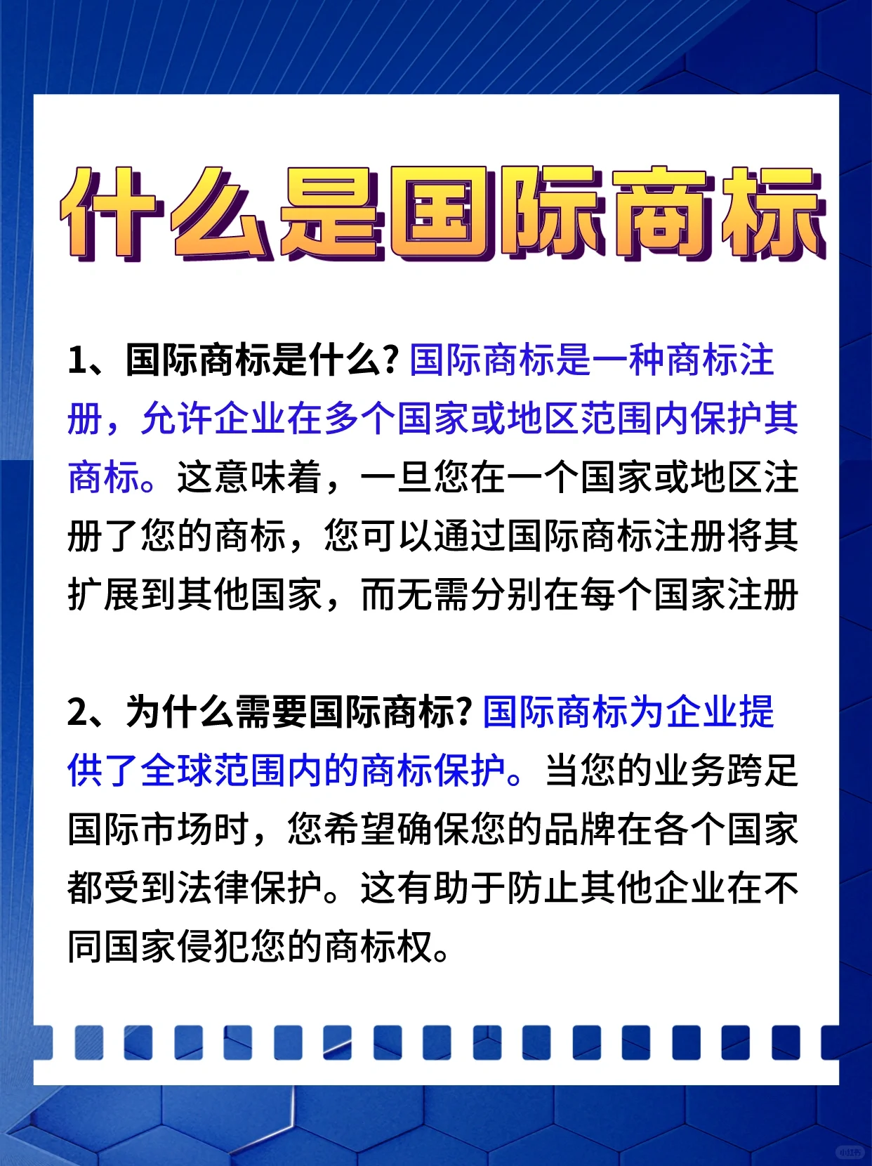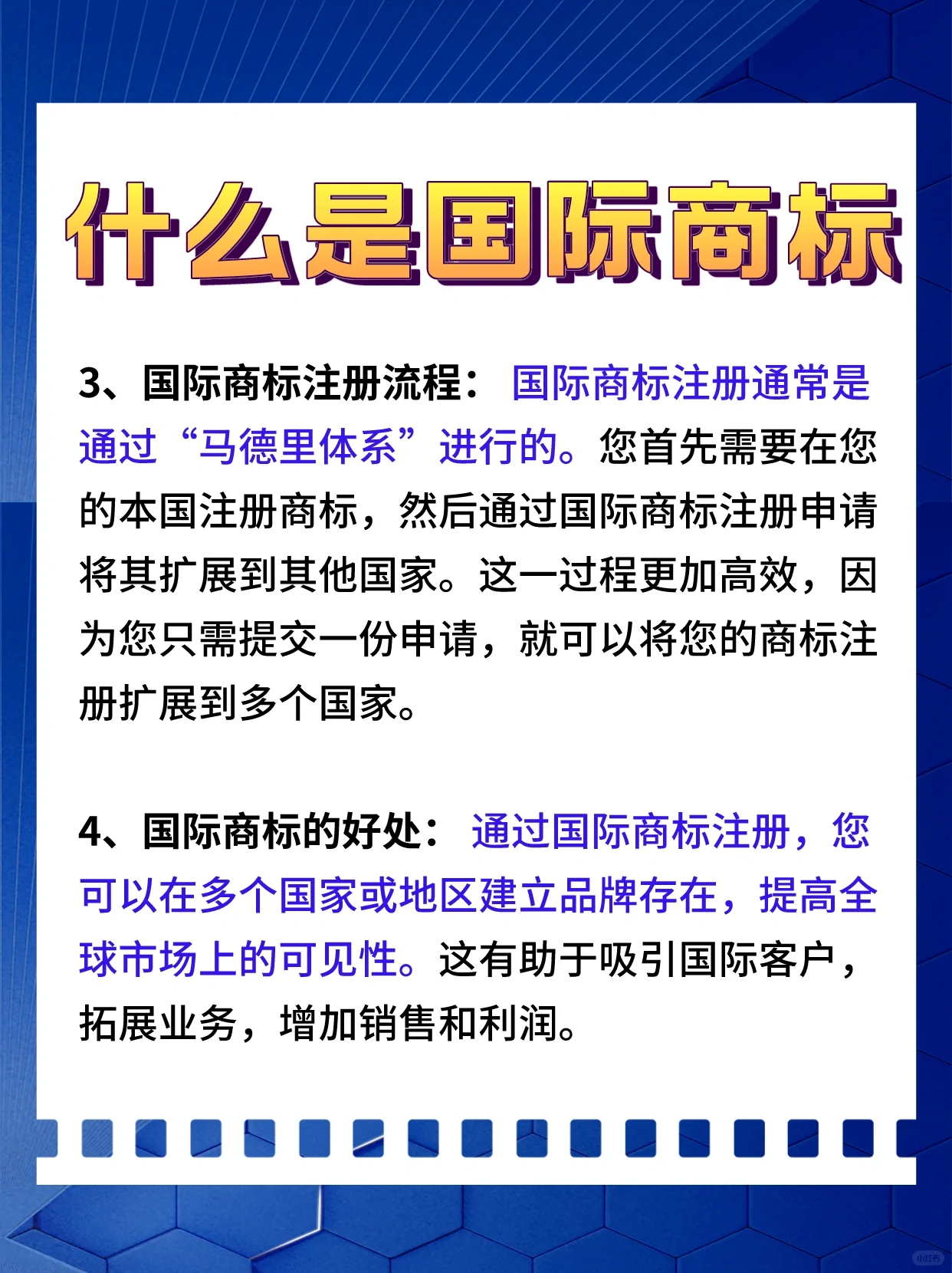 当您决定将业务扩展到国际市场时,国际商标就变得至关重要。让我们了解一下什么是国际商标,以及它给您的企业带来的好处。 1.什么是国际商标国际商标是一种商标注册,允许公司在多个国家或地区保护其商标。这意味着,一旦你在一个国家或地区注册了商标,你就可以通过国际商标注册将其扩展到其他国家,而不必在每个国家单独注册。 2.为什么我们需要一个国际商标国际商标为企业提供全球商标保护。当您的企业进入国际市场时,您希望确保您的品牌在所有国家都受到法律保护。这有助于防止其他公司在不同国家侵犯您的商标权。 3.国际商标注册流程:国际商标注册通常通过马德里系统进行。您首先需要在本国注册商标,然后通过国际商标注册申请将其扩展到其他国家。这个过程更有效,因为你只需要提交一份申请,就可以将商标注册扩展到多个国家。 4.国际商标的好处:通过国际商标注册,您可以在多个国家或地区建立品牌影响力,提高在全球市场的知名度。这有助于吸引国际客户,扩大业务,增加销售额和利润。 5.保护知识产权:国际商标注册不仅保护您的品牌,也有助于保护您的知识产权。它确保其他企业在未经授权的情况下不能使用与您的商标类似的徽标。 6.国际商标权:一旦您获得国际商标注册,您就有权在注册国保护商标。如果发生侵权行为,您可以采取法律行动保护您的商标权。 7.业务拓展:通过国际商标,您可以更容易地扩展到其他国家,建立跨境业务,并在全球范围内取得成功。 总的来说,国际商标是扩大国际业务的重要工具,为您的品牌提供全球保护和机会。如果您计划在国际市场发展业务,并考虑注册国际商标,这将为您的业务带来长期利益。