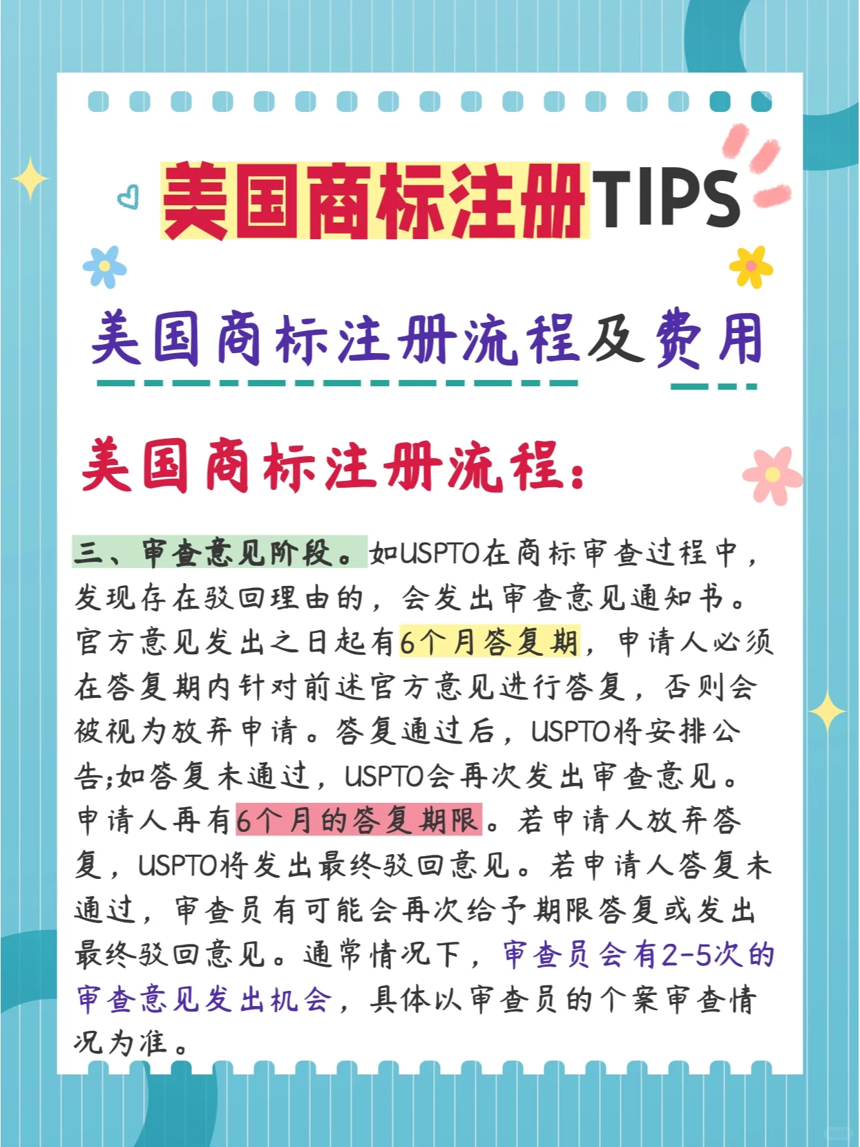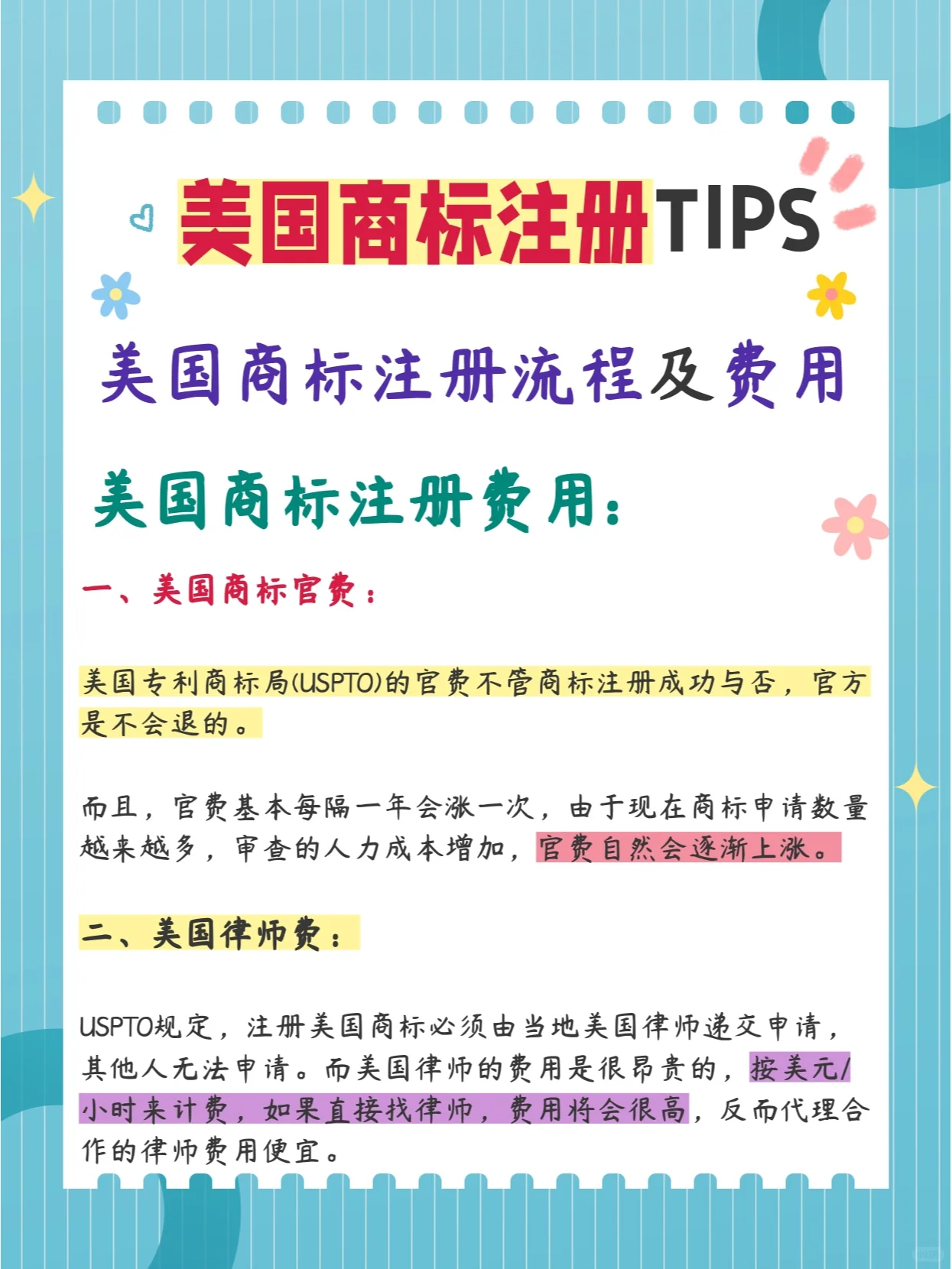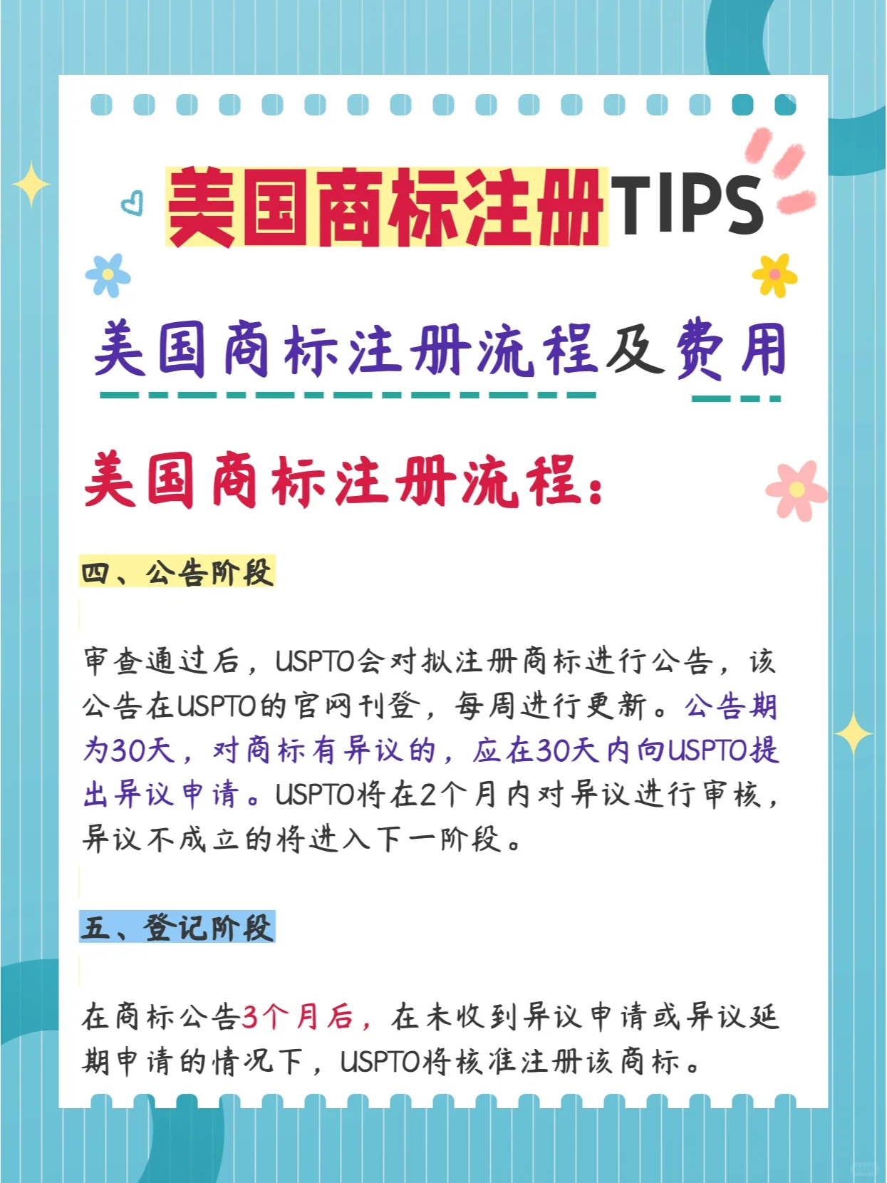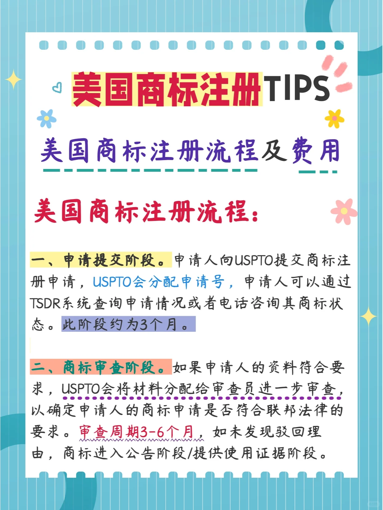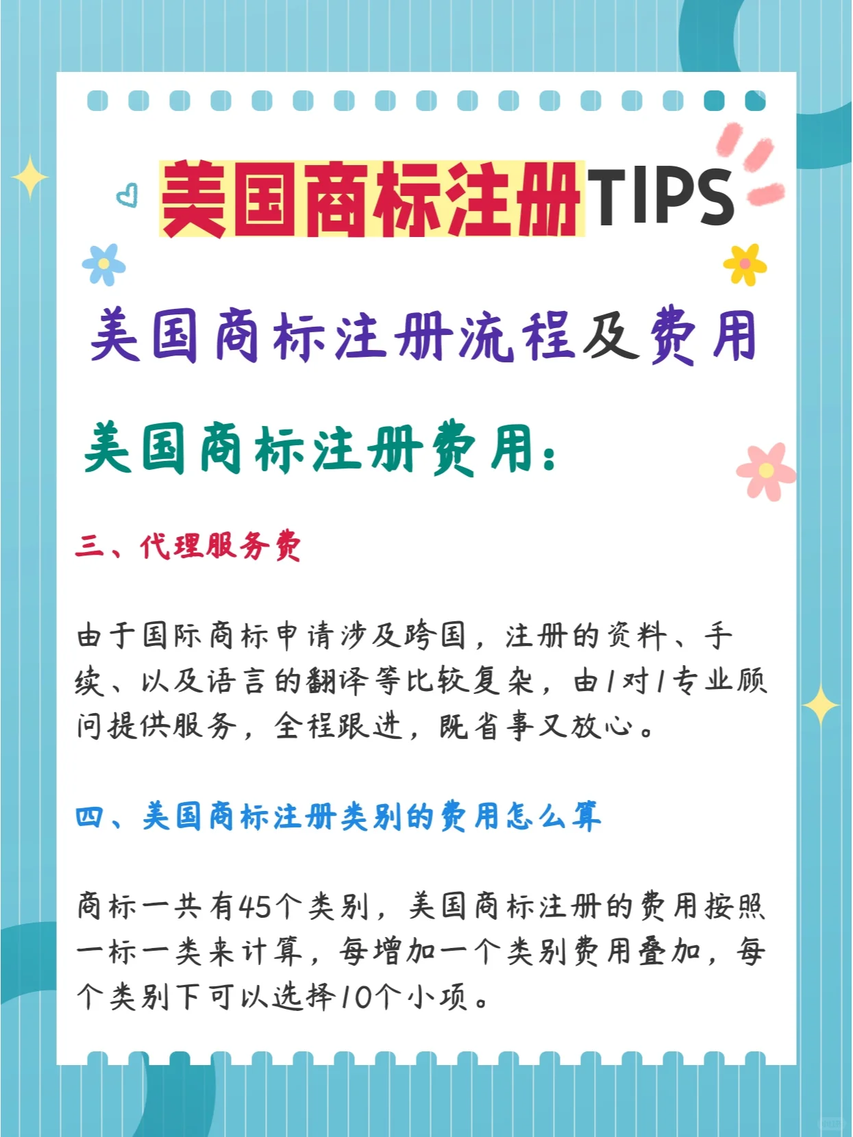 我们需要提交商标注册所需的材料吗然后按照规定的程序注册,注册美国商标也是如此。你需要按照相关程序注册。让我们一起了解详细的美国商标注册流程和费用~ 美国商标注册流程 申请提交阶段 申请人向USPTO提交商标注册申请,USPTO将指定申请号。申请人可以通过TSDR系统查看申请状态,也可以通过电话查询其商标状态。这个阶段大约需要3个月。 商标审查阶段 如果申请人的信息符合要求,美国专利商标局将把材料分配给审查员进行进一步审查,以确定申请人的商标申请是否符合联邦法律的要求。审查期为3-6个月。如果没有发现拒绝的理由,该商标将进入公告/提供使用证据的阶段。 评审意见阶段 如果美国专利商标局在商标审查过程中发现驳回理由,将发出审查意见通知书。自正式意见发布之日起有6个月的答复期,申请人必须在答复期内对上述正式意见作出答复,否则将被视为放弃申请。 公告阶段 审查通过后,美国专利商标局将公布拟议的注册商标,并将在美国专利商标总局的官方网站上发布,每周更新一次。公告期为30天。如果对商标有任何异议,应在30天内向美国专利商标局提交异议申请。USPTO将在2个月内审查反对意见,不持有反对意见的将进入下一阶段。 注册阶段 在商标公告三个月后,如果没有收到异议申请或异议延期申请,美国专利商标局将批准该商标的注册。 美国商标注册费的构成 美国商标局费用: 无论商标注册是否成功,美国专利商标局(USPTO)的官方费用都不会退还。 此外,公务费通常每隔一年就会增加一次,随着商标申请数量的增加和考试人力成本的增加,公务费自然会逐渐增加。 美国律师费: 根据美国专利商标局的规定,注册美国商标必须由当地的美国律师提交,其他人不能申请。美国律师的费用非常昂贵,每小时收费美元。如果你直接聘请律师,费用会很高,相反,代表和合作的律师的费用会更便宜。 代理服务费 由于国际商标申请的跨境性质,注册材料、程序和语言翻译都相当复杂。服务由一对一专业顾问提供,全程全程全程跟进,既方便又放心。 在美国注册商标的费用是多少 共有45个类别的商标,在美国的商标注册费是根据每个类别一个商标计算的。对于每个额外的类别,费用是堆叠的,每个类别可以选择10个子项目。 具体费用还将取决于您的商标注册需求和所选类别的数量。