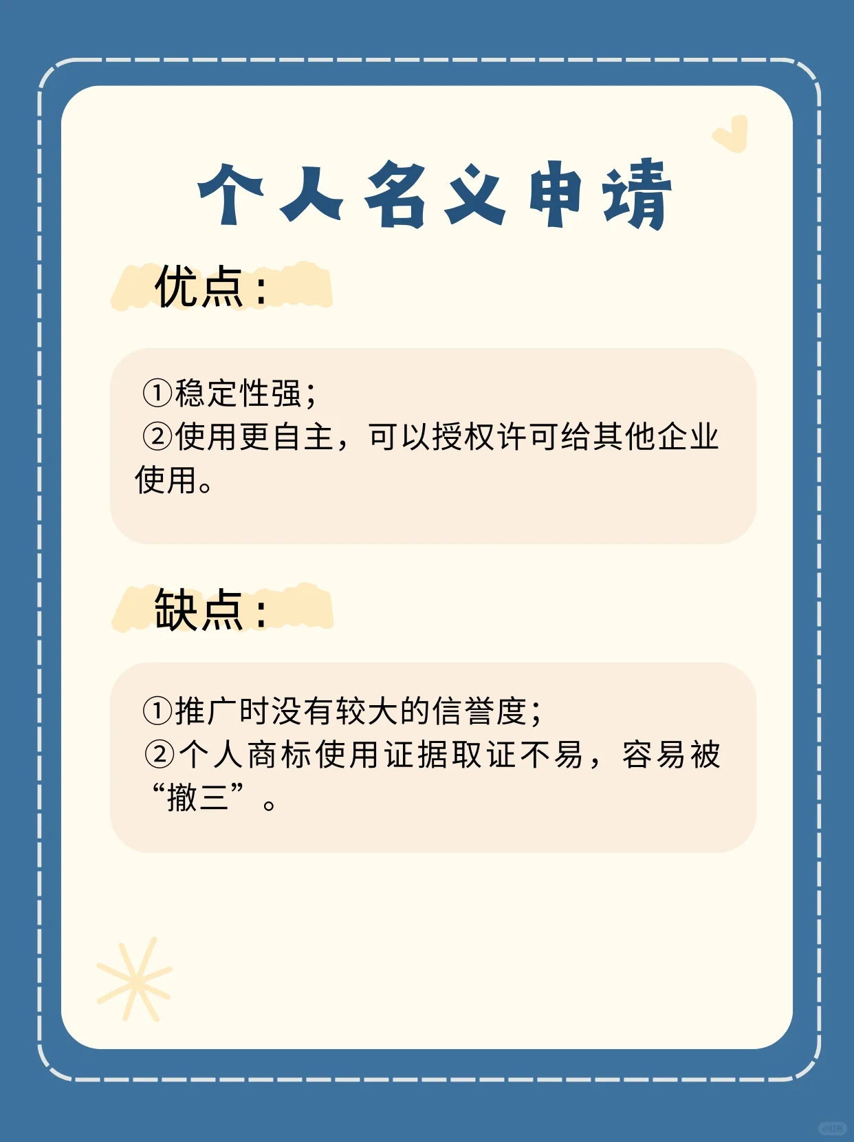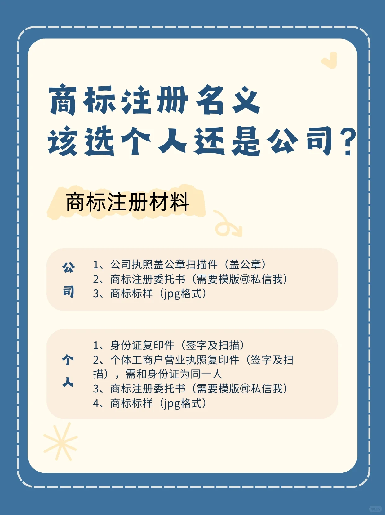 在注册商标时,申请人经常会问:以个人名义还是以公司名义注册商标更好 这两种不同类型的商标所有权各有优缺点。如何选择取决于后期商标的具体使用需求,什么最适合你的需求。 事实上,不同的商标申请名称具有相同的申请时间、审查流程,享有相同的权利。 在实际使用中,个体工商户更适合以个人名义申请商标注册,而多股东企业更适合以公司名义申请商标登记。