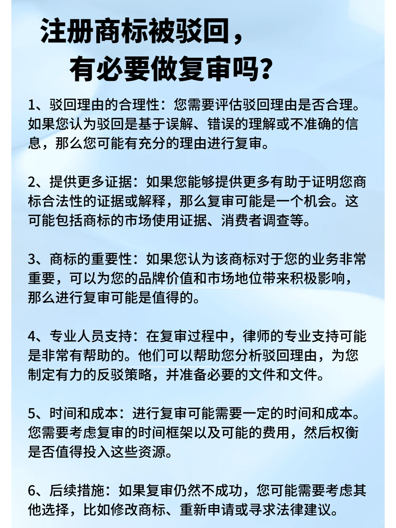 1.拒绝理由的合理性:首先,你需要评估拒绝理由是否合理。如果您认为拒绝是基于误解、不正确的理解或不准确的信息,那么您可能有足够的理由进行审查。 2.提供更多证据:如果你能提供更多的证据或解释来帮助证明你的商标的合法性,那么审查可能是一个机会。这可能包括商标的市场使用证据、消费者调查等。 3.商标的重要性:如果你认为商标对你的业务非常重要,可以对你的品牌价值和市场地位产生积极影响,那么进行审查可能是值得的。 4.专业支持:在审查过程中,律师的专业支持可能会非常有帮助。他们可以帮助你分析拒绝的原因,为你制定强有力的反驳策略,并准备必要的文件和文件。 5.时间和成本:进行审查可能需要一些时间和成本。你需要考虑审查的时间表和潜在成本,然后权衡是否值得投资这些资源。 6.后续措施:如果复审仍然不成功,您可能需要考虑其他选择,如修改商标、重新申请或寻求法律建议。