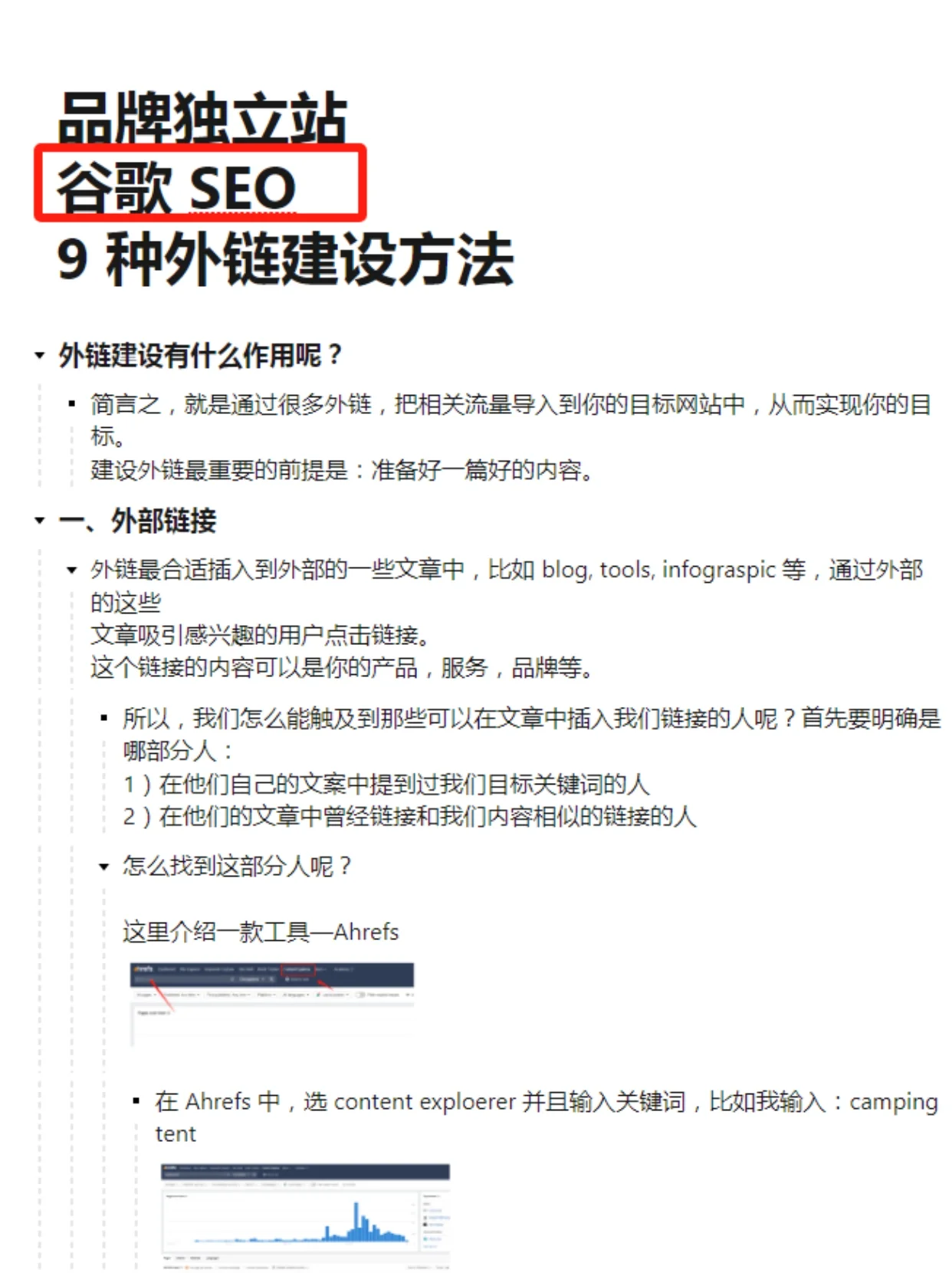 品牌独立网站Google SEO外部链接构建方法: ① 外部链接②撰写博客副本③更新/替换过时的链接④利用未链接的文章⑤激活无效链接 文件中详细提到 带上你需要的东西