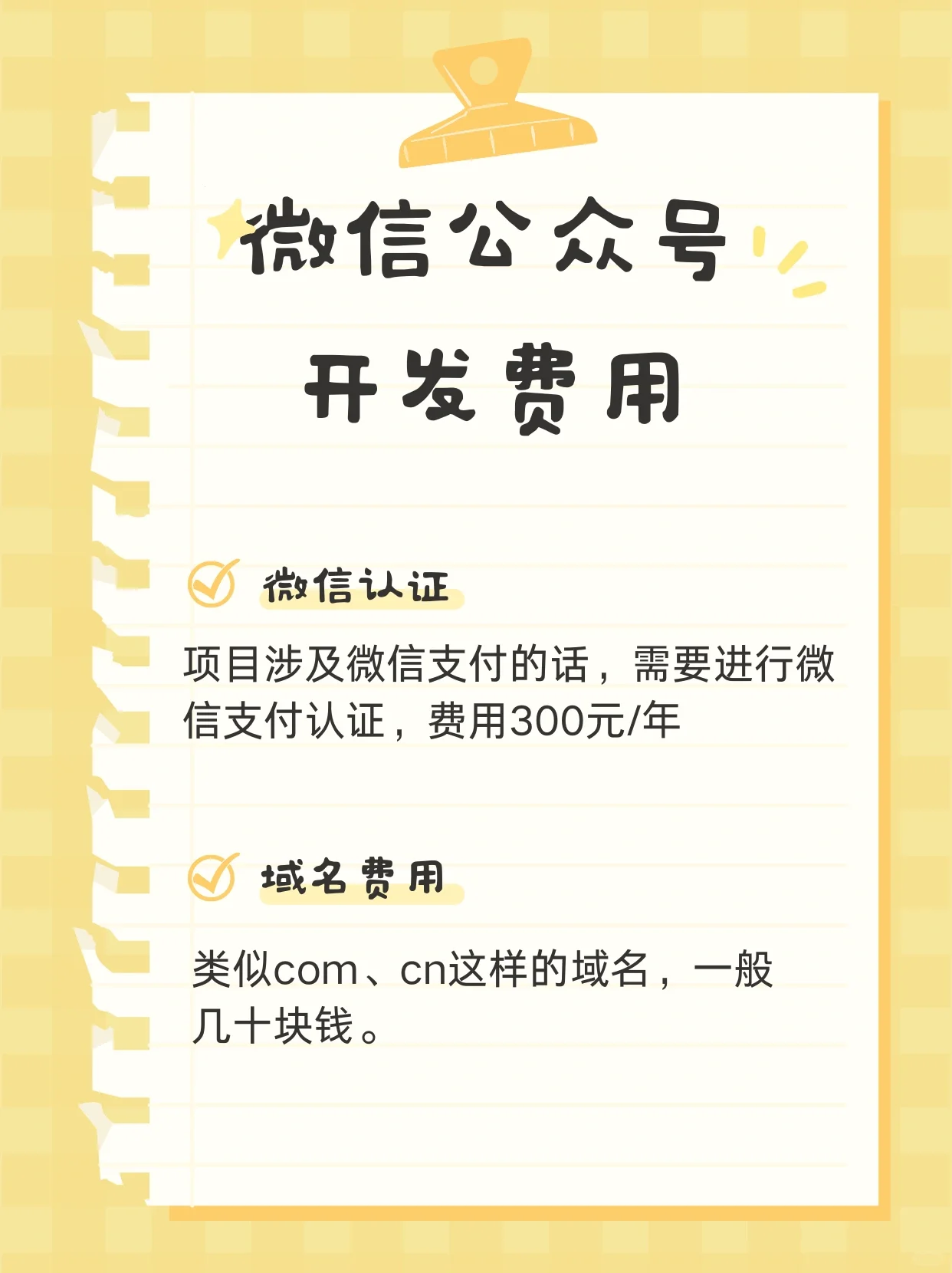 建立一个公众号需要多少钱 微信认证费: 如果您的公众号涉及微信支付,您需要支付300元/年的公众号微信支付认证费。域名费: 在公众号开发过程中,您需要为您的公众号注册域名,以确保用户可以通过一个简单易记的网站访问您的公众账号。域名的成本取决于您选择的域名注册商和域名类型(如.com、.cn等)。一个典型的域名要几十元 服务器费用: 公众号需要托管在服务器上。您可以选择使用自己的服务器或选择云服务提供商。服务器成本取决于您的选择,包括服务器硬件规格、带宽、存储空间等因素。常见的阿里云和腾讯云。费用从几百到几千不等 项目开发成本: 该项目的开发成本主要涉及开发团队的人力成本。如果你选择外包给专业的开发公司,成本可能会相对较高。此外,开发复杂性和功能需求也会对开发成本产生影响。模板类型的成本通常为几千元,定制和开发成本从10000元起 微信支付率: 如果您的公众号需要微信支付功能,则需要支付一定的交易费用。微信支付率为0.6%