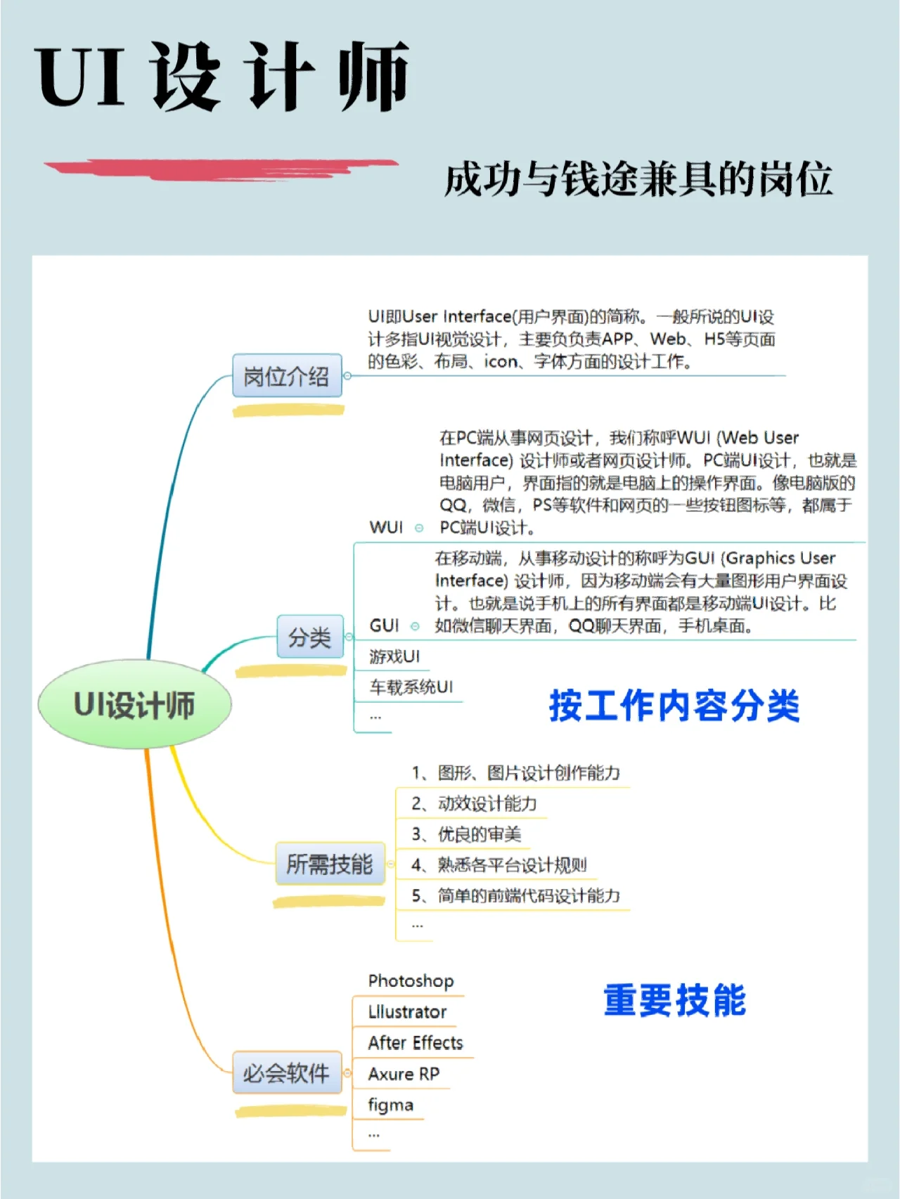 当谈到一个职业时,每个人的首要关注点都是它的薪水和发展前景。今天,我们要谈论的是UI设计师,这是一个平衡成功和金钱的职位。 近年来,随着“UI”这个新名词的出现,“UI设计师”也成为人们眼中的一个新兴位置。 如今,UI设计师已成为苹果和谷歌等全球知名IT公司的热门招聘职位。 在中国,微软、谷歌、诺基亚、中国移动、腾讯、百度和阿里巴巴等公司为专业UI设计师提供了30万至50万元的年薪。 从发展历史来看,UI设计在中国仍处于起步阶段,但目前存在巨大的人才缺口,UI就业市场供不应求。 全国UI设计师的平均工资在1万左右,其中10万至15万的比例最高,达到25.9%。 所以对于那些非常看重“钱”的人来说,为什么不考虑这个职位呢 UI设计师的详细工作介绍如图所示~ 欢迎UI设计爱好者帮忙补充内容。