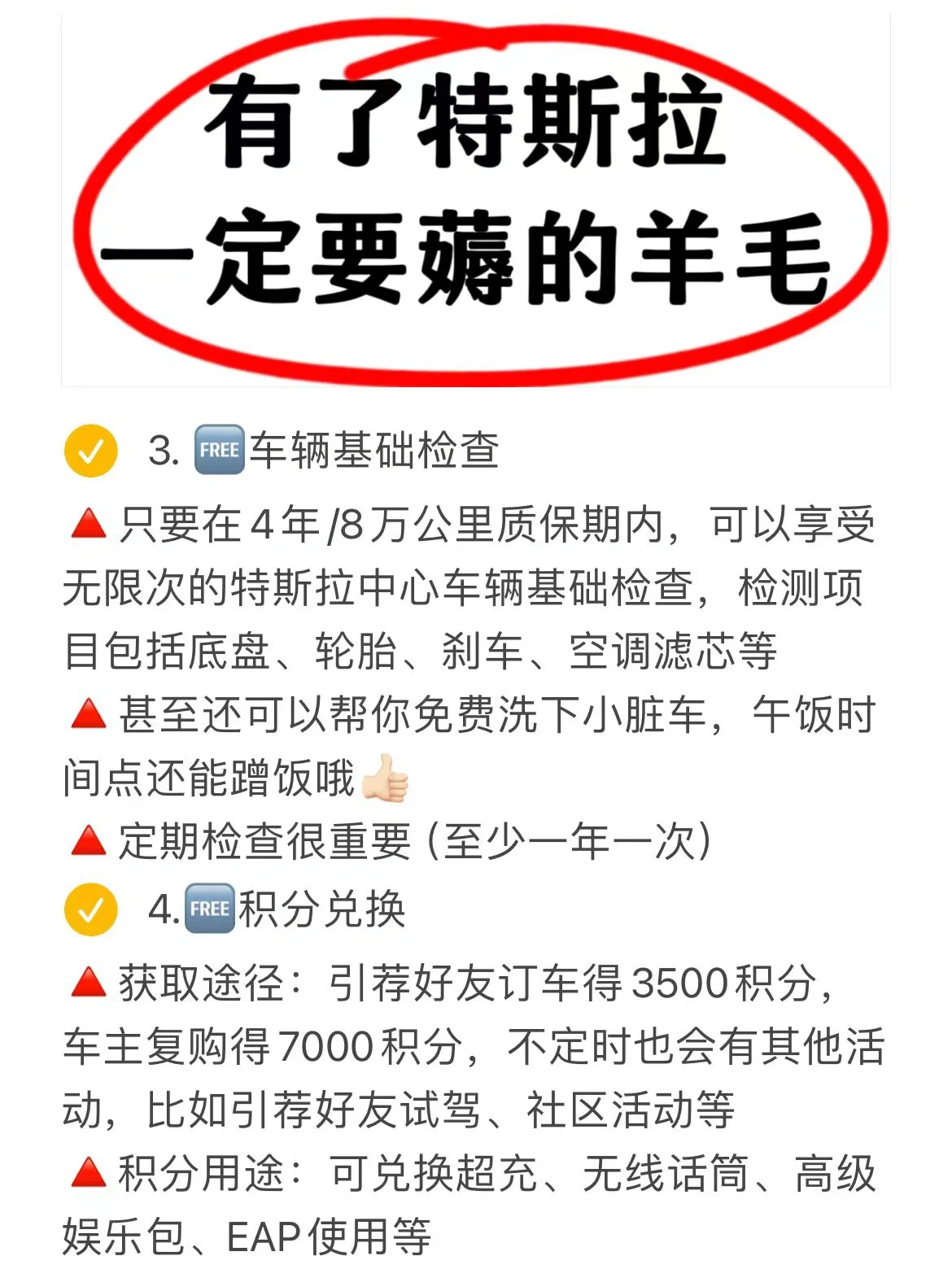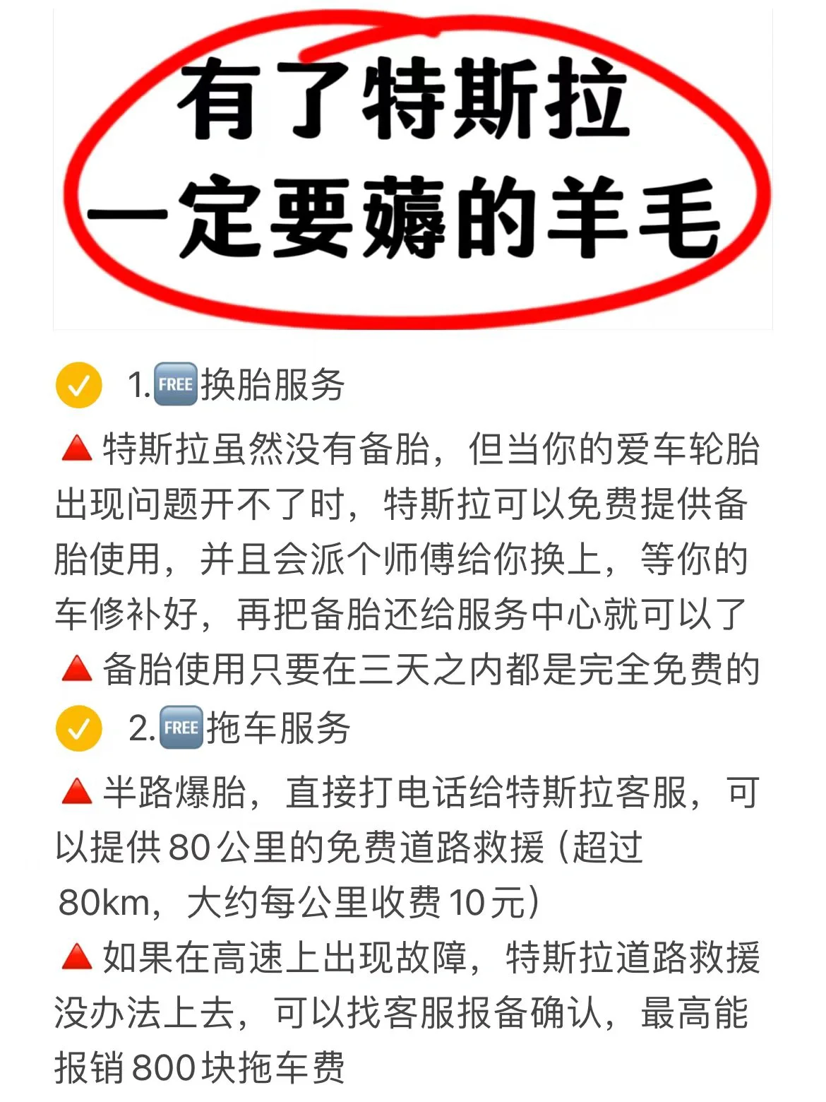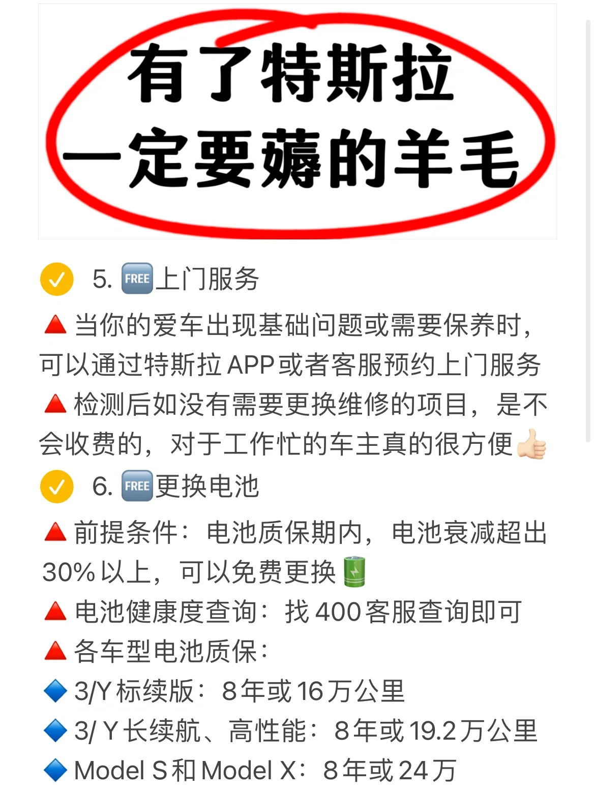 特斯拉提车后 这些头发 我不知道,我会失去很多 什么 1.轮胎更换服务 虽然特斯拉没有备用轮胎,但当您的汽车轮胎出现问题而无法驾驶时,特斯拉可以免费提供备用轮胎,并将派技术人员为您更换。汽车修好后,您可以将备用轮胎退还给服务中心 备胎在三天内完全免费使用 2.车辆牵引 中途爆胎,直接致电特斯拉客服,提供80公里免费道路救援(80公里以上,每公里10元) 如果高速公路发生故障,特斯拉道路救援无法上去,您可以向客服报告确认,拖车费最高报销800元 3.车辆基础检查 只要保修期为4年/80000公里,您就可以享受无限量的特斯拉中心车辆基本检查,包括底盘、轮胎、制动器、空调滤清器等 我甚至可以免费帮你洗脏车,你还可以在午餐时间吃顿饭,对吧 定期检查很重要,至少每年一次,以使日常使用更放心 4.积分兑换 获取方式:推荐朋友订车可获得3500积分,车主回购可获得7000积分。此外,还将不定期举办其他活动,如推荐朋友试驾、社区活动等 积分可用于充值、无线麦克风、高级娱乐套餐、EAP使用等 5.现场服务 当您的汽车出现基本问题或需要维修时,您可以通过特斯拉应用程序或客服预约现场服务 如果检查后没有需要更换或修理的物品,就不会收费。这对忙碌的车主来说真的方便吗 6.更换电池 前提条件:在电池保修期内,如果电池衰减超过30%或以上,是否可以免费更换 电池健康查询:只需联系400客服即可查询 每种车型的电池保修: 3/Y标准延续版:8年或160000公里 3/Y远程、高性能:8年或192000公里 S型和X型:8年或240000公里