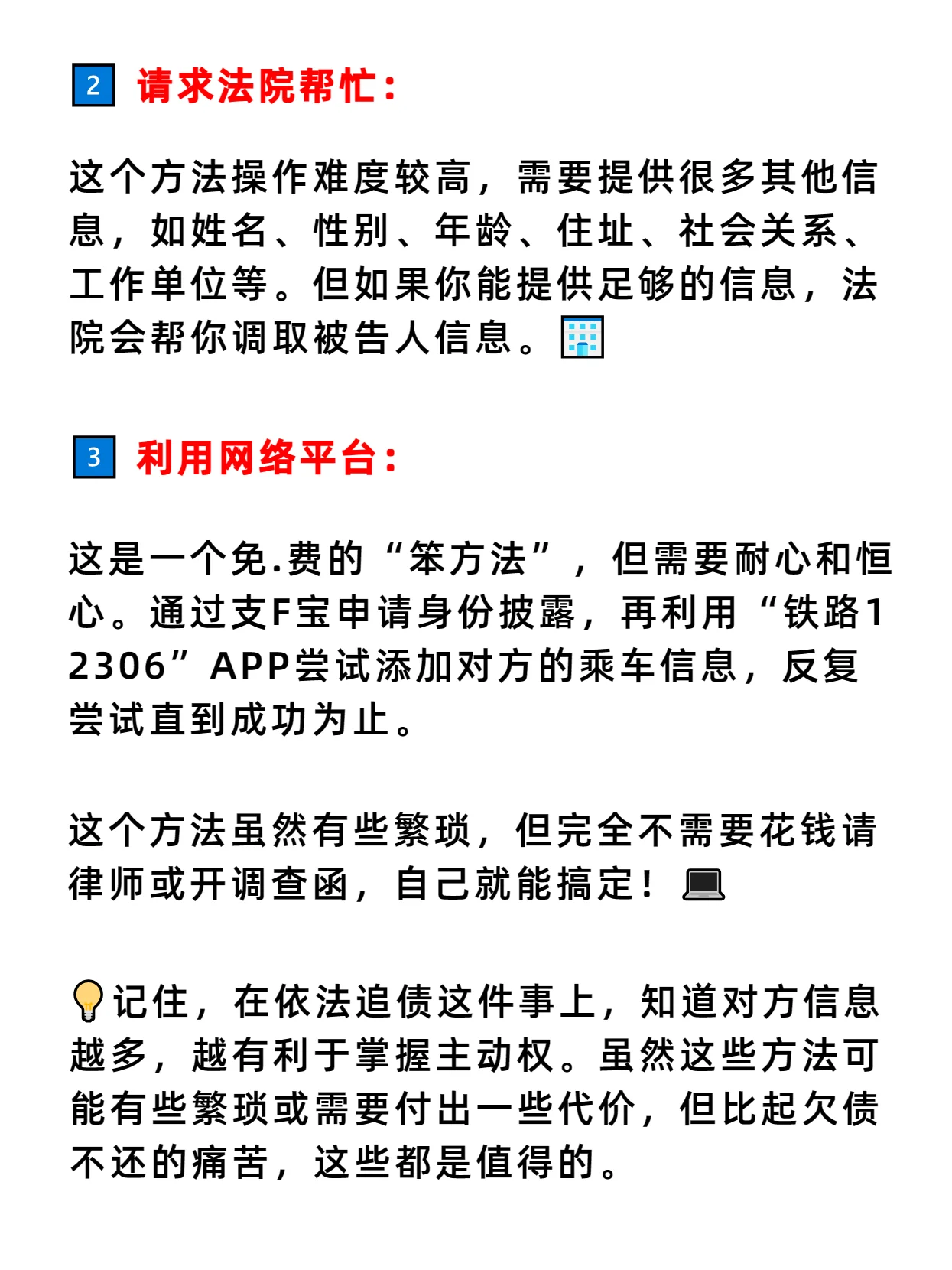 世界上zui有风险的事情:给别人借钱,一不小心就遇到跑路的,VX、支F宝、电/话都拉黑,主打的就是“有借不还”,着实让人恨得牙痒痒这种时候该怎么要回欠款呢 上网搜了一大圈得到结论——去法院起诉,然而很多人在起诉的第.一步就被难住了。不知道对方身.份证号码啊!!!虽说几千块钱看清一个人也算物超所值,但就是咽不下这口气呀 内心想:谁交朋友前还查下身份证啊! 但法院的工作人员会说:如果没有对方身.份证号码,就没有办法确定你想起诉的具体是哪一个人,全国同名同姓的人那么多······但如何才能知道对方身份证号码呢 下面教你几个小方法,说不定就用得上: 委托律师进行查询 派出所户籍查询: 律师带着律所介绍信和律师证,就能到辖区派出所申请查档。 即时工具查询: 通过实名电.话号码、VX、支F宝等账号,律师可以协助你获取对方身.份信息。只需提供相关线索,律师就能帮你调取信息 立案后向法院申请协查函 在向法院提交起诉材料的同时,提交一份调取被告户籍信息协查的申请书。法院审核后,会出具协查函,协助你获取被告信息 网络数据库查询 企业信息查询: 如果对方是企业,可以去当地工商局或国家企业信用信息公示系统查询。只需提供企业名称,就能查到对方的组织机构代码、地址、法定代表人等信息 失信被执行人网站查询: 在这个网站上,失信被执行人的姓名和身份证号码都会公示。你可以通过检索了解对方是否是失信人员,从而获取更多身.份信息 全国工商信息查询平台查询: 通过企查查等平台,可以查询对方是否注册公司、是否为股东或法人等信息。如果有这些情况,律师可以直接去市场监管局调取工商内档信息,获取被告人的身份证复印件 法律文书网站查询: 通过中国裁判文书网、阿尔法系统、无讼网等网站,可以查询对方是否存在诉讼案件,从而了解对方身.份信息 如果需要我单独出一篇其他平台的查询信息其他平台指导流程的,可以问我哟 如果需要起诉对方,需要律师帮忙查询对方身.份信息的,可以留盐:你的大概情况+涉及金额,收到大家的问题后都会帮助大家的!