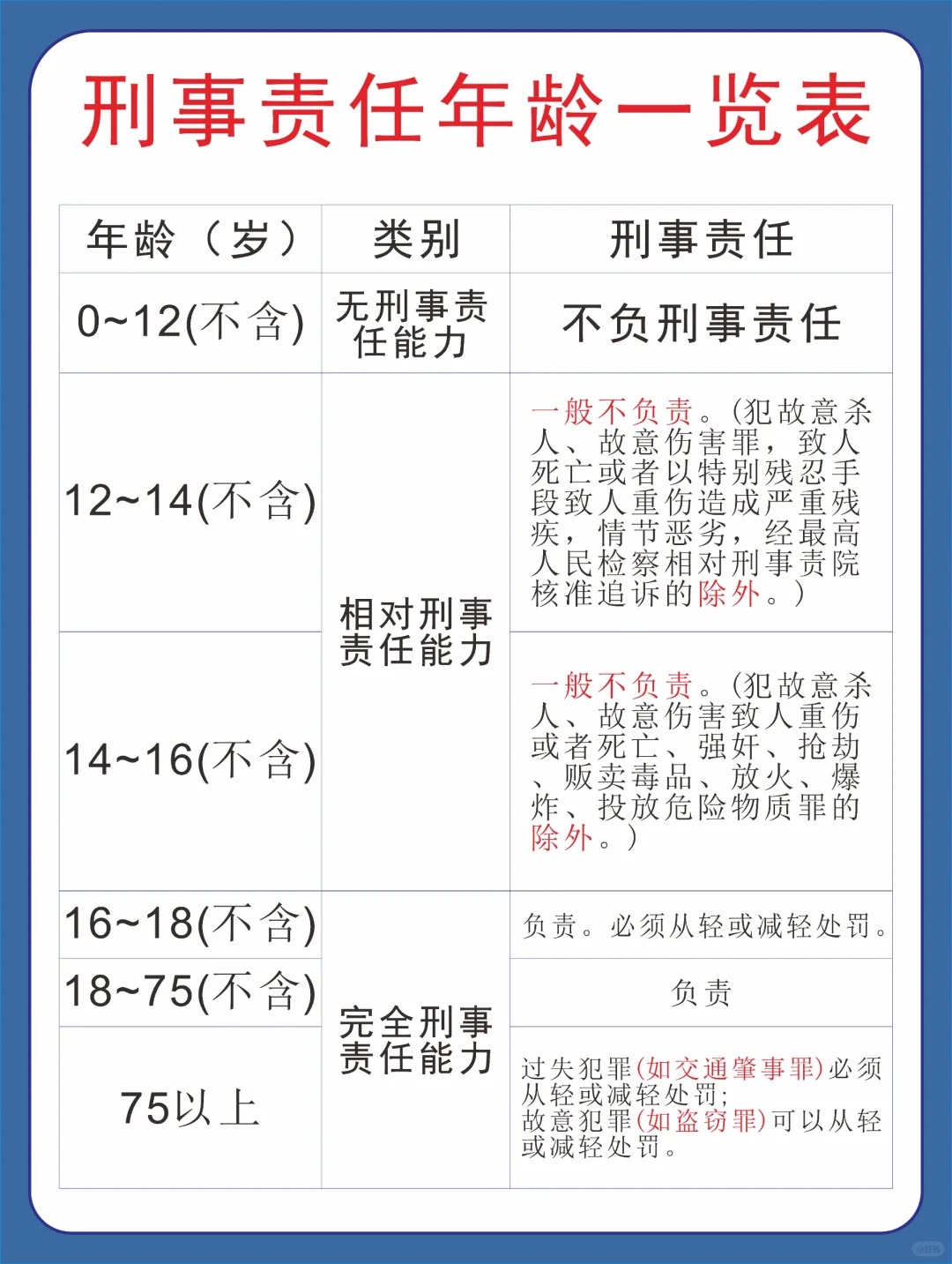 不满14岁的未成年人杀人案件再次让刑事责任年龄成为焦点话题。 在刑法中规定刑事责任年龄,理论依据在于未达责任年龄的孩子缺乏是非对错的辨认能力或控制能力,因此对他们的刑事惩罚没有意义。 我国刑法曾经以14周岁作为有无责任年龄的标准,在法律上推定不满14周岁,没有是非对错的辨认能力或控制能力,这种法律逻辑清晰明了。 但是,法律的生命是经验而非逻辑。如果经验事实不断地证明法律逻辑存在问题,那么这种逻辑命题就值得修正。从发生过的多起不满14岁的孩子实施杀人等严重犯罪的案件来看,认为他们缺乏是非对错的辨认能力或控制能力的法律逻辑很难服众。 2021年《刑法修正案(十一)》就借鉴了英美法系的恶意年龄补足制度。它并未整体性下调刑事责任年龄,只是对刑事责任年龄做出了一种例外性下调,对于两种特定的犯罪经过特定的程序,可以追究刑事责任。对于已满12周岁不满14周岁的人,如果实施了故意杀人、故意伤害致人死亡或者以特别残忍手段致人重伤造成严重残疾的行为,同时达到情节恶劣的程度,对于特定犯罪,经最高人民检察院核准追诉的,应当负刑事责任。 目前我国关于刑事责任划分如下: 1、不满12周岁的人(不满12不包含12周岁),不承担刑事责任 不满12周岁的人只是不承担刑事责任,并非所有责任都不承担。 2、已满12周岁不满14周岁的人承担刑事责任的条件 犯故意杀人、故意伤害罪,致人死亡或者以特别残忍手段致人重伤造成严重残疾,情节恶劣,经最高人民检察院核准追诉的应当负刑事责任。 3、已满14周岁不满16周岁的人承担刑事责任的条件 仅对8种严重犯罪负刑事责任:故意杀人、故意伤害致人重伤或死亡、抢劫、强奸、贩卖毒品、防火、爆炸、投放危险物质(烧、 杀、淫、掠、伤、投、爆、毒)。 4、已满16周岁的人,应当承担刑事责任 未成年人犯罪,应当从轻或者减轻处罚。因不满16周岁不予刑事处罚的,责令其父母或其他监护人加以管教;在必要的时候,依法进行专门的矫治教育。 5、已满75周岁的人 故意犯罪的,可以从轻或者减轻处罚;过失犯罪的,应当从轻或者减轻处罚。