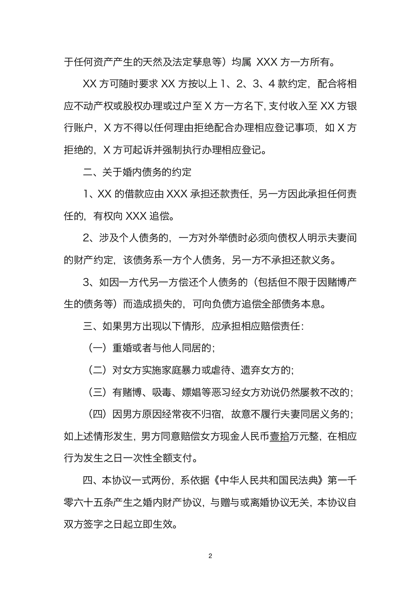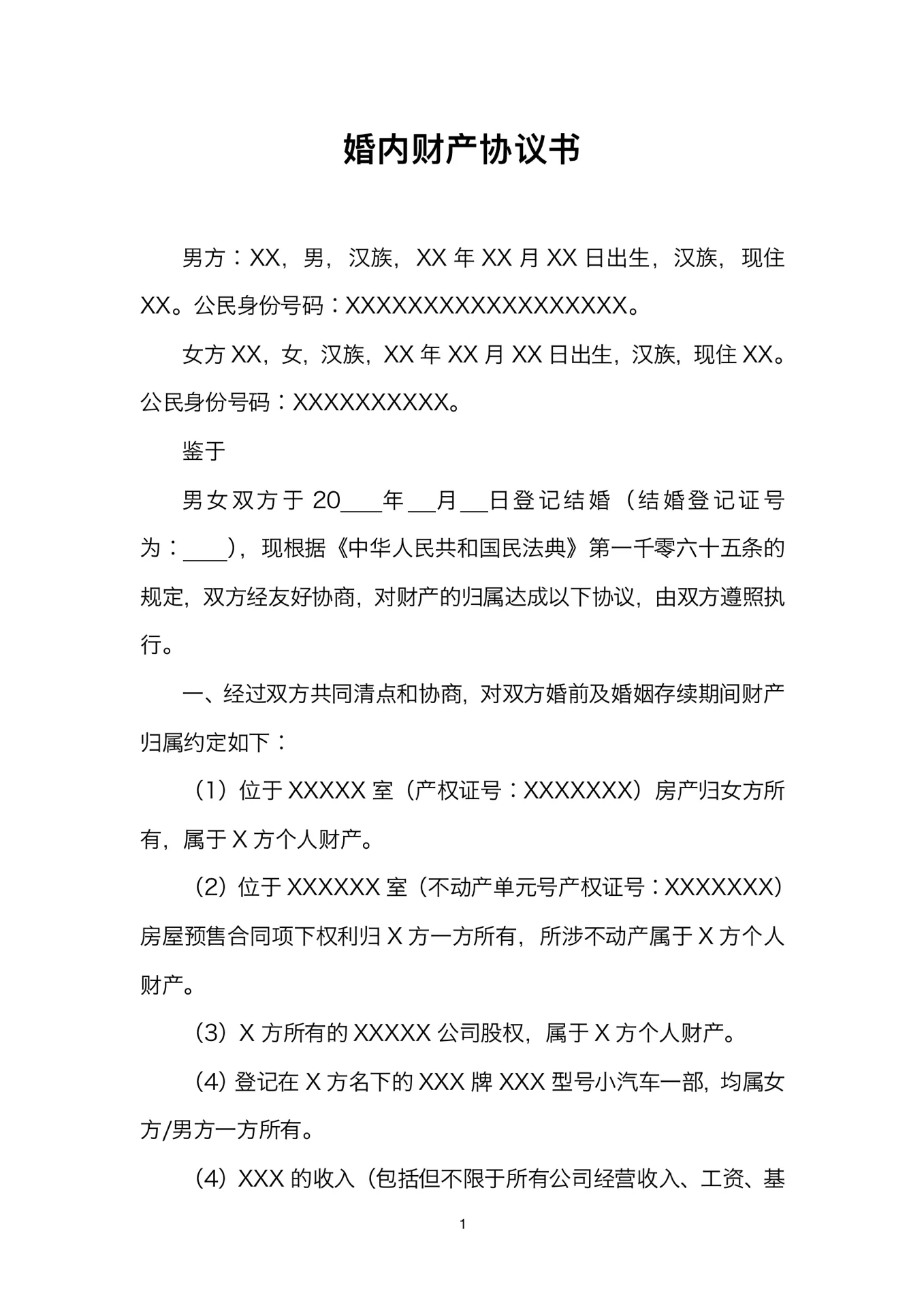 有没有人不知道婚姻财产协议书上有没有这些空白的签名在查看协议时,您仍然可以看到这些东西 重申为了使《婚姻财产协议》有效和安全,协议中不能规定以下内容。来自我检查一下 净房条款:“谁提出离婚,谁来净房”、“一方出轨,双方必须离婚”、“如果一方提出离婚,给对方多少补偿”; 剥夺一方监护权和探视权的规定,如“如果任何一方有外遇,他们将自动失去监护权”或“如果一方提出离婚,他们不能见到自己的孩子”; 不能附加离婚条件:如“双方离婚按本协议执行”或“如果以后离婚,双方同意按本协议分割财产”; 无法就尚未发生的财产继承达成一致(如父母双方的继承归属) 还建议在达成夫妻财产协议后尽快完成财产所有权转移手续。