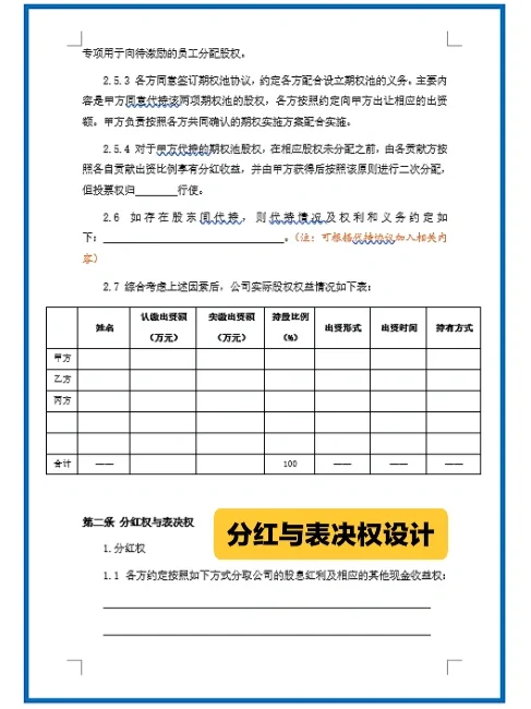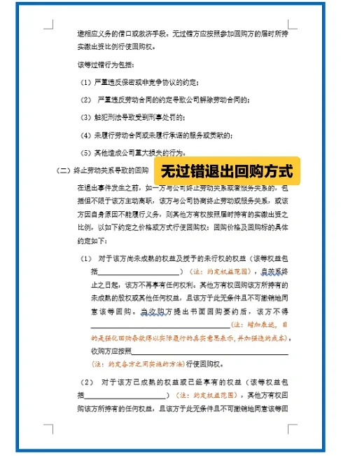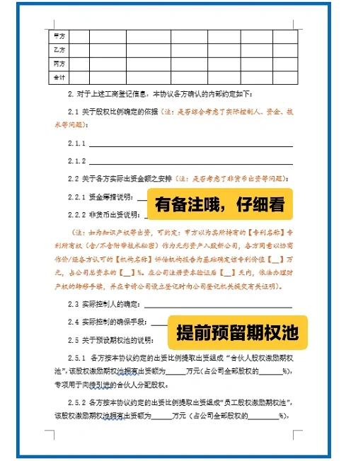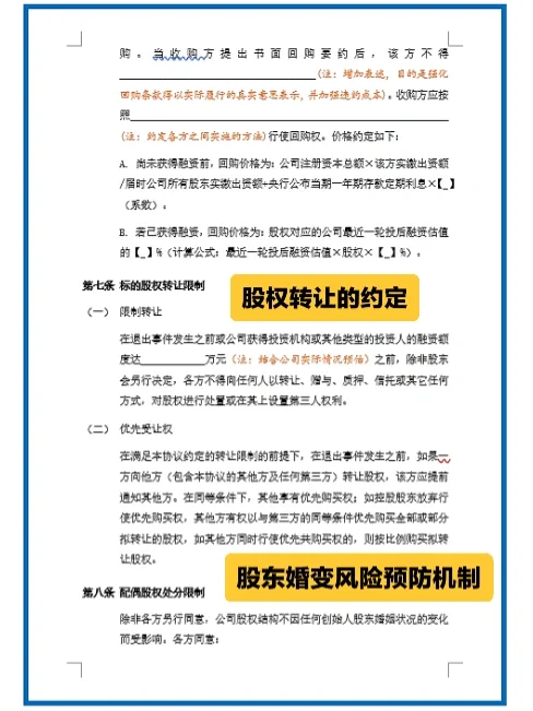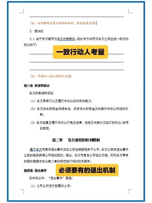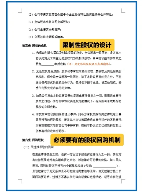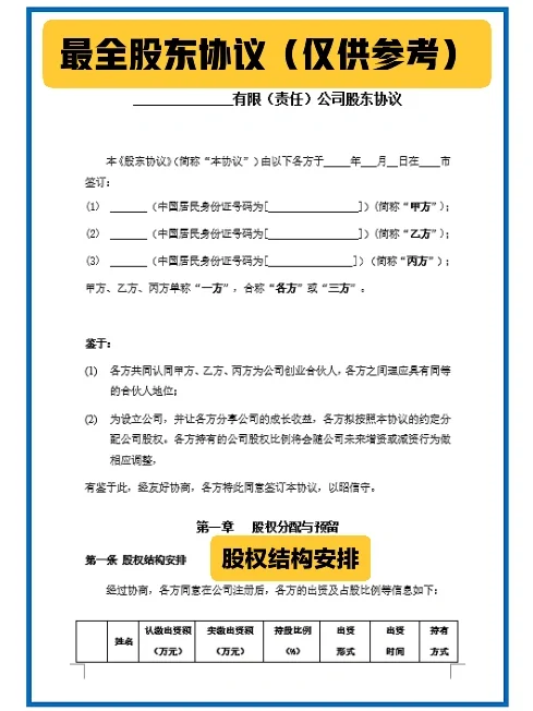 股东协议是股东之间就投资项目、投资方式、收益分配、公司人事任命、商业风险和损失、经营管理方式、公司清算和终止以及其他股东权利和义务等事项达成的协议。 本股东协议(仅供参考)涵盖股权分配、股权激励预留、限制性股权(长期约束和激励效果)、股息设计、控制权设计(一致行动)、退出机制和匹配回购机制、股权转让协议、股东配偶股权处置限制和协议、股权继承限制、竞业禁止和说服、知识产权所有权和许可、增资扩股、违约责任等内容。内容全面,在关键条款中有注释和提醒,方便创业者根据自身情况进行合理调整。