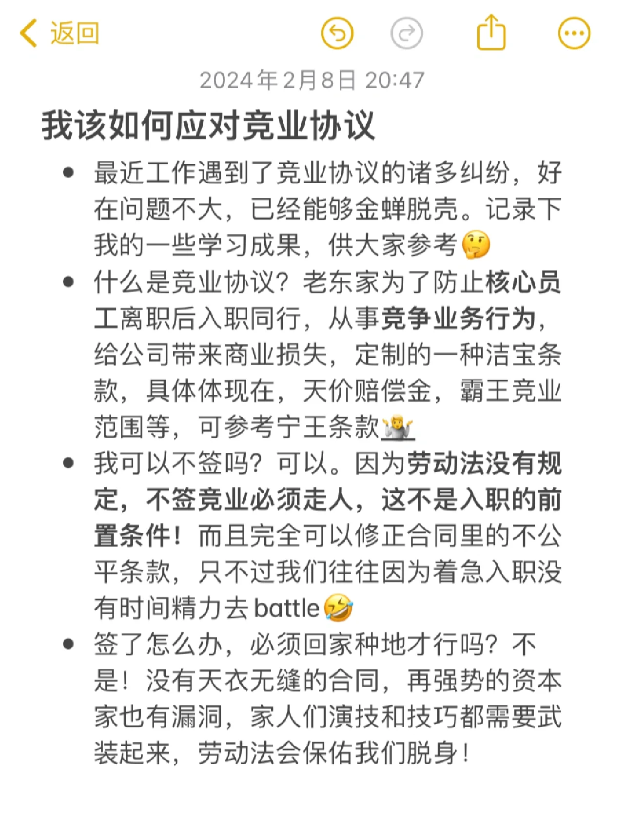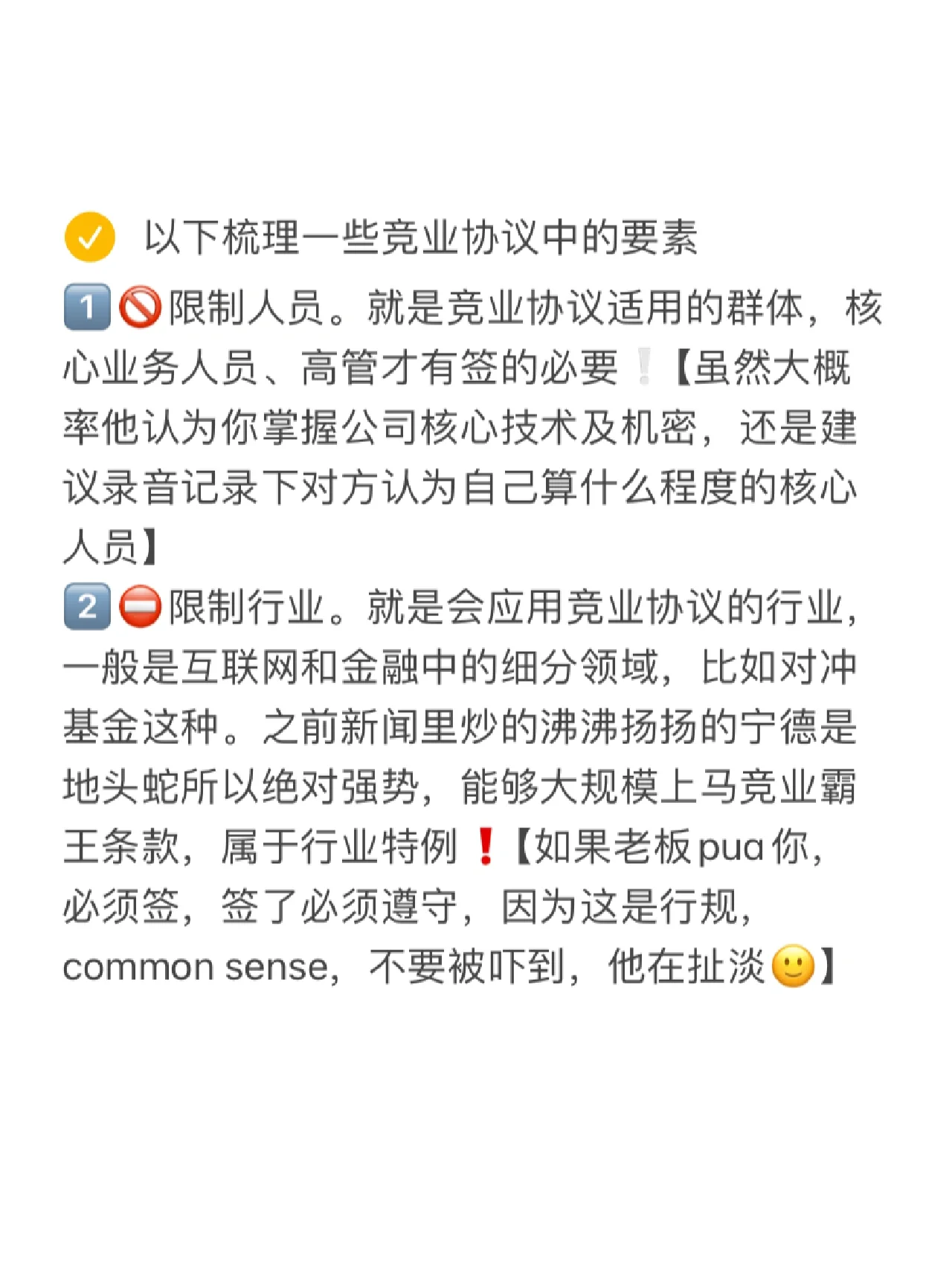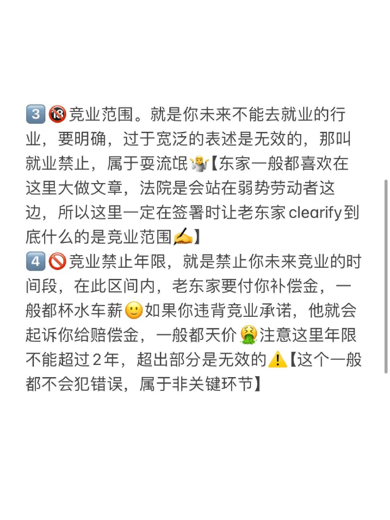 最近,我在工作中遇到了很多关于竞业禁止协议的争议,但幸运的是,问题并不严重,我已经成功地解决了它。记录下我的一些学习成果,供大家参考 什么是竞业禁止协议为了防止核心员工离职后从事竞争性商业活动,给公司造成业务损失,老公司定制了清洁条款 我可以不签字吗当然因为劳动法中没有规定竞业禁止的申请人必须离开,这不是就业的先决条件! 签订合同后我该怎么办我必须回家种地吗不没有无缝的合同,即使是最强大的资本家也有漏洞。家庭成员需要用他们的演技和技能武装起来,劳动法会保佑我们逃离! 以下是竞业禁止协议的一些要素,如图2所 受限人员。竞业禁止协议适用于该集团,只有核心业务人员和高管需要签署该协议❕ 尽管他很可能认为你已经掌握了公司的核心技术和秘密,但仍然建议记录对方对你是什么级别的核心人员的看法 限制行业。它指的是将适用竞业禁止协议的行业,通常是互联网和金融的一个细分领域,如对冲基金。此前在新闻中炒作的宁德,是地方龙头,所以绝对强势。能够大规模推出竞争优势条款是行业中的一个特例 如果老板想要你,你必须签字,如果你签字,你必须遵守,因为这是商业规则。常识,别害怕,他在胡说八道 竞争范围。这是你将来找不到工作的行业吗要明确的是,过于宽泛的表述是无效的,这叫禁止就业,属于耍流氓业主们通常喜欢在这里大做文章,法院会站在弱势工人一边。因此,在签约时,必须要求老东家澄清竞争范围是什么️ 竞业禁止期是指您在未来被禁止参加比赛的一段时间。在此期间,你的前雇主通常被要求向你支付赔偿金,这通常是杯水车薪如果你违反了竞业禁止承诺,他会起诉你要求赔偿,通常会花天价请注意,这里的使用寿命不能超过2年,任何超过都无效 这通常不是错误,属于非关键阶段