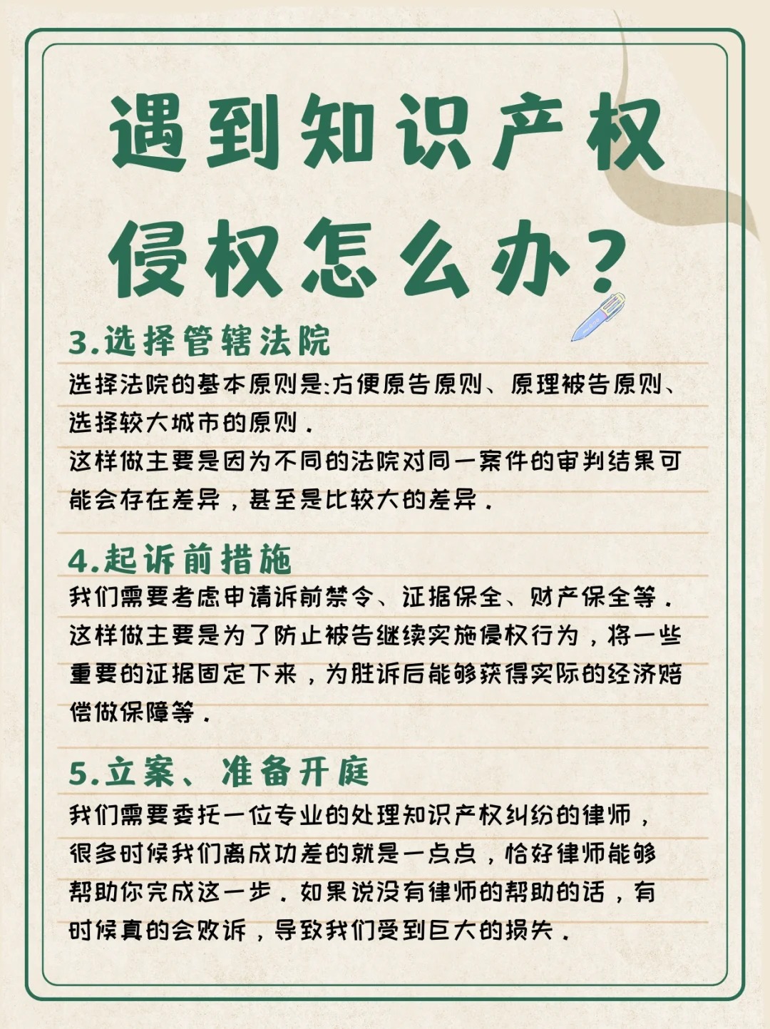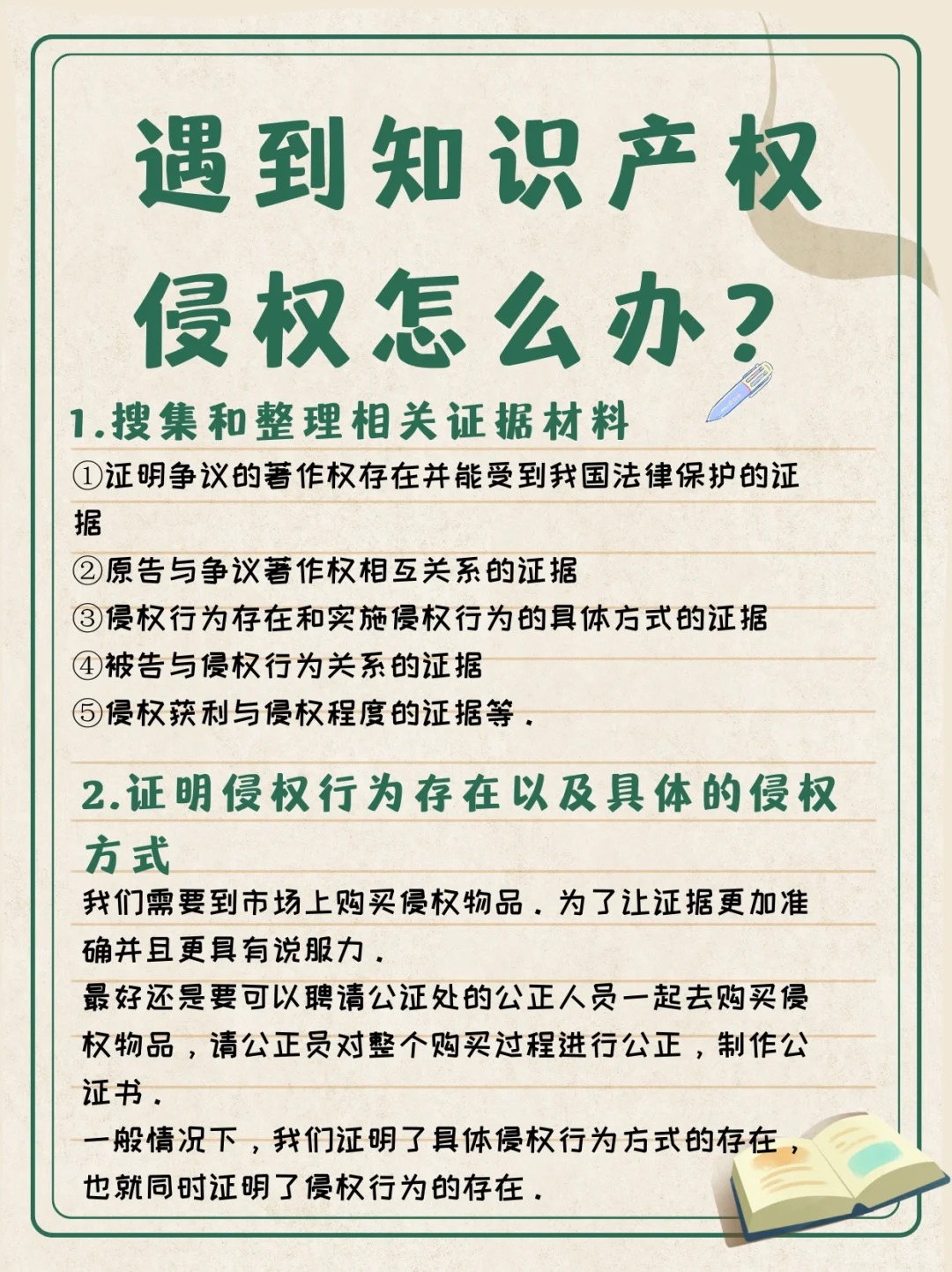 1.搜集和整理相关证据材料 ①证明争议的著作权存在并能受到我国法律保护的证据 ②原告与争议著作权相互关系的证据 ③侵权行为存在和实施侵权行为的具体方式的证据④被告与侵权行为关系的证据⑤侵权获利与侵权程度的证据等。 2.证明侵权行为存在以及具体的侵权方式 我们需要到市场上购买侵权物品。为了让证据更加准确并且更具有说服力。 最好还是要可以聘请公证处的公正人员一起去购买侵权物品,请公正员对整个购买过程进行公正,制作公证书。 一般情况下,我们证明了具体侵权行为方式的存在,也就同时证明了侵权行为的存在。 3.选择管辖法院 选择法院的基本原则是:方便原告原则、原理被告原则、选择较大城市的原则。 这样做主要是因为不同的法院对同一案件的审判结果可能会存在差异,甚至是比较大的差异。 4.起诉前的措施 我们需要考虑申请诉前禁令、证据保全、财产保全等。 这样做主要是为了防止被告继续实施侵权行为,将一些重要的证据固定下来,为胜诉后能够获得实际的经济赔偿做保障等。 5.立案、准备开庭 如果觉得请律师成本太高,那就仔细听接下来的方案: 1. 首先就要确定是否构成侵权,在确定侵权的情况下才有可能涉及赔偿。 2. 在确定侵权的前提下,查看对方证据里有没有专利评价报告,可以寻求现有设计抗辩。 3. 如果你是从其他渠道进货的,能证明合法来源,且不知道侵犯别人专利权(善意),可以进行合法来源抗辩。(合法来源抗辩一直是知识产权抗辩的一个策略,但是法律实践中合法来源抗辩成立的情况极少) 4. 专利案件中,具体赔偿金额的多少,不单单只看销售额,也许你觉得只卖了百来块钱,让赔几万不合理,但是赔偿不仅要看侵权人获利,还要看原告的损失(后面有解释)。 5. 仔细查看传票上的开庭时间,如果销量不高,就在开庭前及时寻求和解。 如果你最近遇到相关的法律难题,需要找律师处理的话,欢迎随时联系我们。