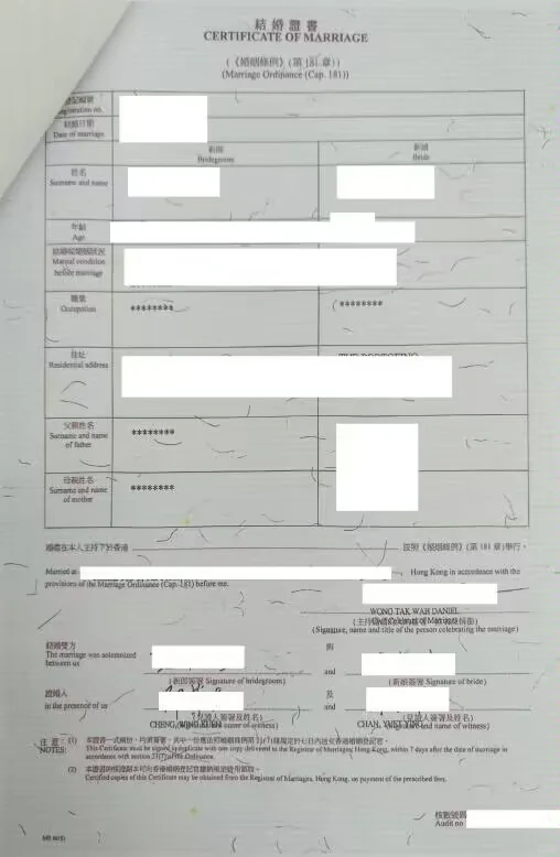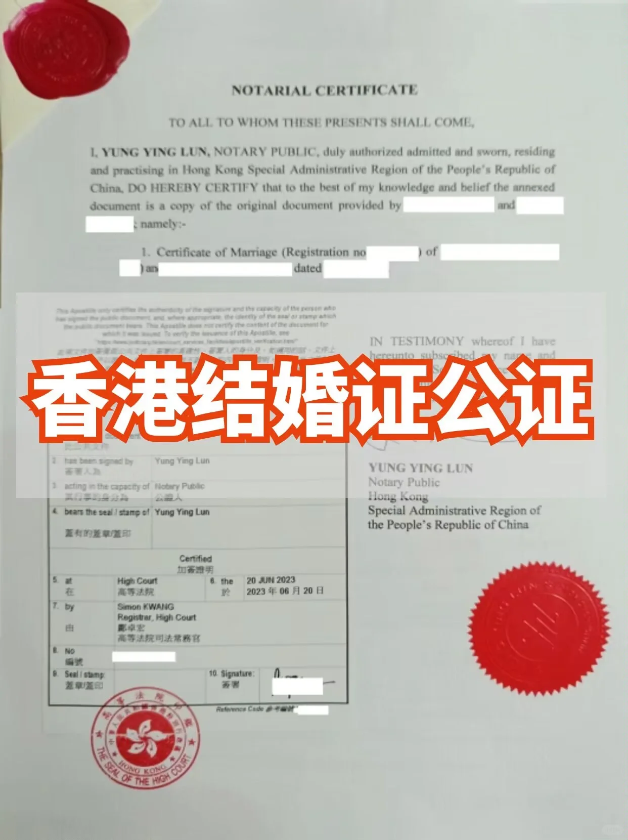 随着中国内地与香港的频繁交往,许多人选择在香港结婚,然后在中国内地生活、工作、买房等等。 在处理一些事情的过程中,需要一份结婚证书来证明婚姻关系。 公证结婚证书的样式因用途而异。 香港结婚证公证按目的和方式分为三类 1.真实性公证: 一般在离婚诉讼中使用,只有结婚证原件和复印件的一致性才需要公证。 2.附有照片的真实性公证: 一般用于改变中国大陆的婚姻状况,拥有在中国大陆出生的户籍子女,获得银行贷款,以及买卖国内房产(深圳、广州和东莞除外)。这就要求双方的照片贴在公证证书所附的结婚证书副本上。 3.婚姻状况和家庭成员的声明: 一般用于在中国深圳、广州、东莞购房,享受香港优惠政策。 1.已婚,无婚史 已婚且有结婚史 使用区域和注意事项 对于中国大陆: 1、公证申请人应先向委托公证人提交公证申请表、结婚证原件/扫描件、身份证。公证员对材料核实无误后,出具公证证书; 2.经公证的结婚证在中国内地使用的,必须将经公证的婚姻证送交中国法律服务(香港)有限公司并加盖转发印章。 用于国外地区: 1、公证申请人应先向香港国际律师提交公证申请表、结婚证原件/扫描件、身份证。公证律师对材料核实无误后,出具公证证书; 2、公证结婚证在境外使用,需将公证结婚证送香港高等法院签注,然后可选择领事馆认证或海牙认证。