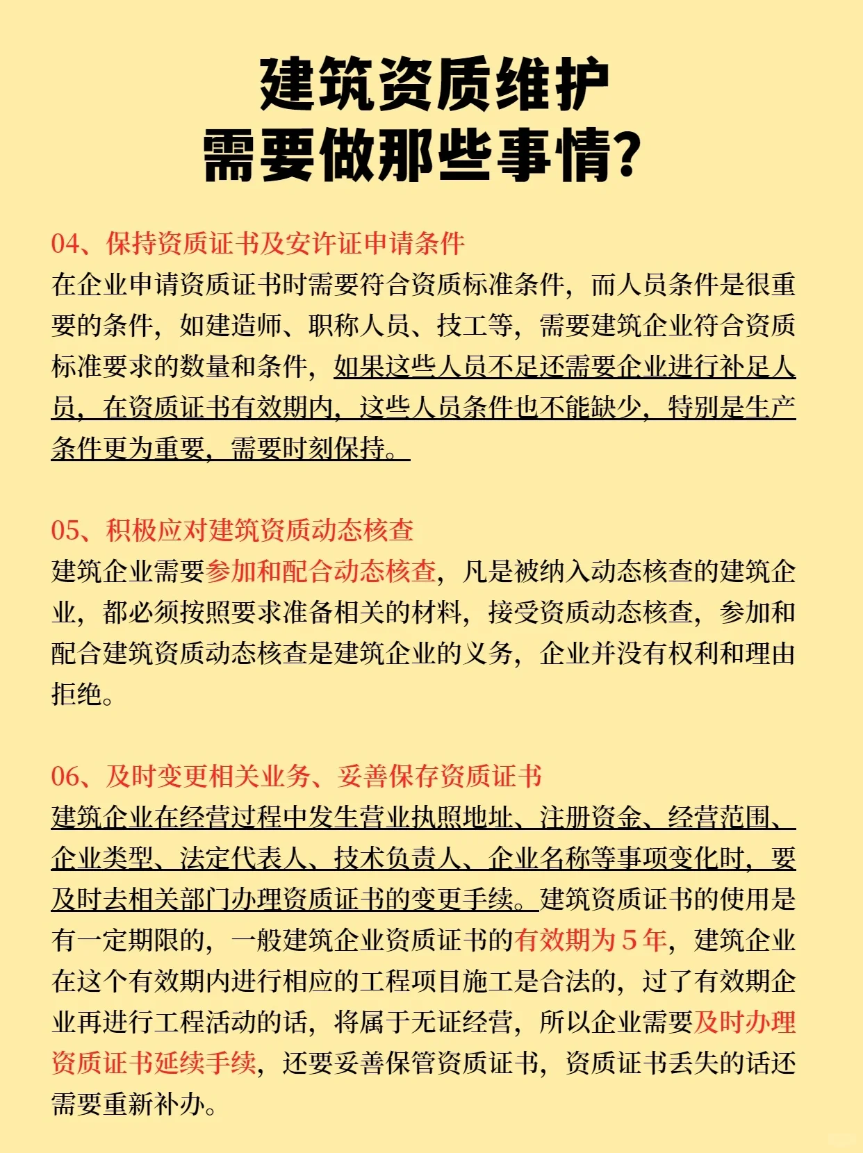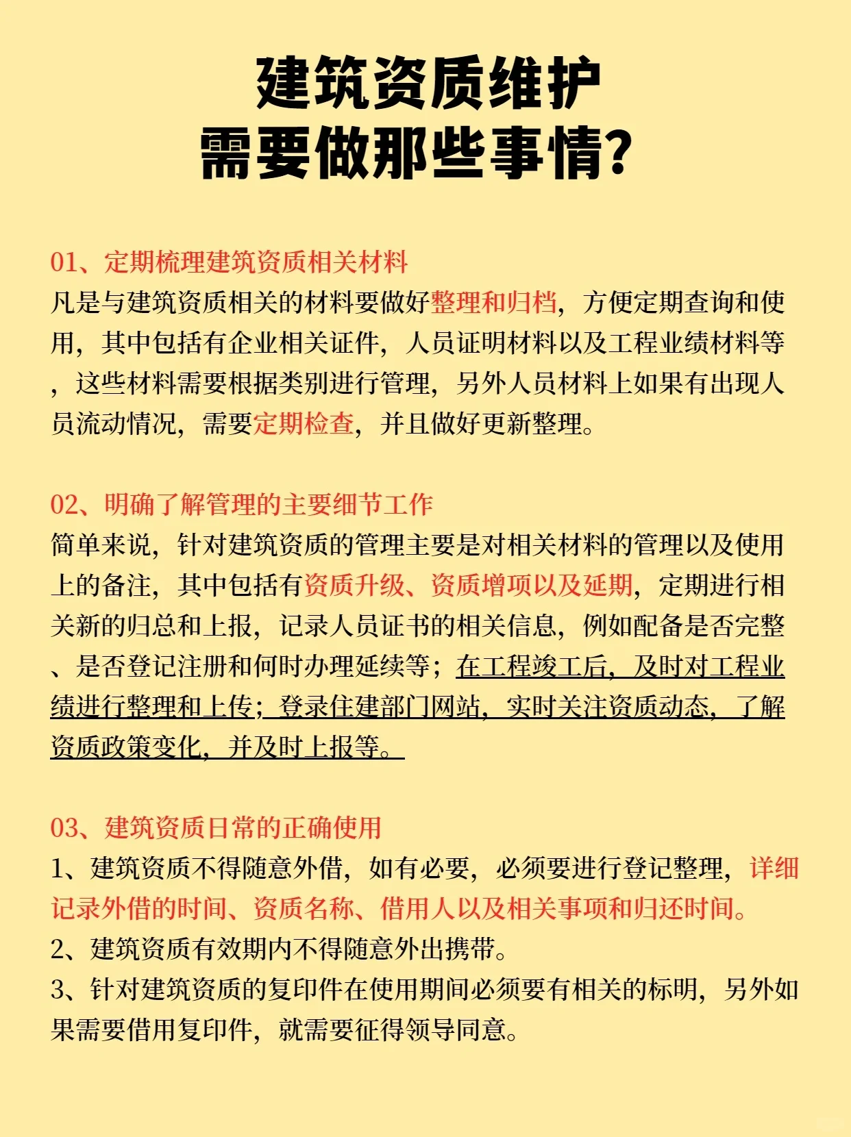 我们需要做些什么来保持建筑资质 01.定期审核建筑资质相关资料 所有与建筑资质有关的材料都应妥善组织和归档,以便定期查询和使用,包括企业相关证书、人员证明材料和工程性能材料。这些材料需要按类别进行管理。此外,如果人员资料上有人员流动情况,需要定期检查和更新。 02.清楚了解管理工作的主要细节 简单地说,建筑资质的管理主要涉及相关材料及其使用说明的管理,包括资质升级、资质增加、年度检查和延期、相关新信息的定期合并和报告,以及人员证书信息的记录,如设备是否齐全、是否注册、何时申请延期;项目完成后,及时组织上传项目业绩;登录住建部门网站,实时跟踪资质更新情况,了解资质政策变化,及时上报。 03.建筑资质的正确日常使用 1、施工资质不得随意外借。如有必要,必须进行登记和组织,并详细记录贷款时间、资格名称、借款人、相关事项和归还时间。 2.在建筑资质有效期内,未经许可不得擅自进行。 3、建筑资质复印件在使用过程中必须有相关标识。此外,如果需要借用副本,则需要得到领导的批准。 04.维护资质证书和安全许可证申请条件 在企业申请资质证书时,必须满足资质标准条件,而人员条件非常重要,如建筑工程师、职称人员、技术人员等。建筑企业需要满足资质标准要求的数量和条件。如果这些人员不足,企业需要弥补。在资格证书的有效期内,这些人员条件是不能缺少的,尤其是生产条件更为重要,需要时刻保持。 05.积极响应楼宇资质动态核查 施工企业需要参与并配合动态核查。凡纳入动态核查的施工企业,必须按要求准备相关材料,接受资质动态核查。参与和配合施工资质动态核查是施工企业的义务,企业无权也没有理由拒绝。 06.及时变更相关业务,妥善保管资质证书 建筑施工企业在经营过程中发生营业执照地址、注册资本、经营范围、企业类型、法定代表人、技术负责人或者企业名称变更时,应当及时到有关部门办理资质证书变更手续。建筑施工资质证书的使用有一定的期限,一般建筑施工企业资质证书的有效期为5年。