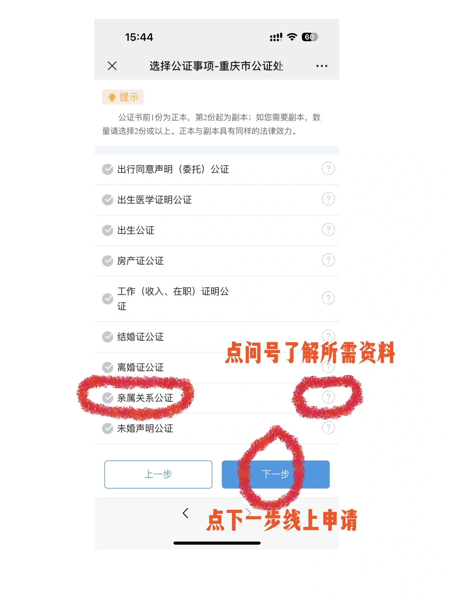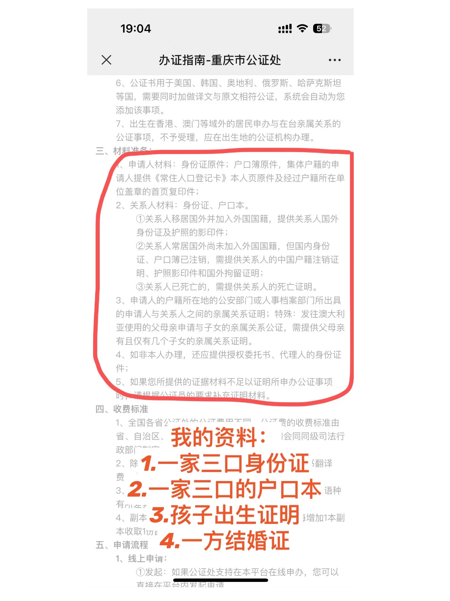 我计划申请申根旅游签证,并了解了家庭关系公证。在找了很长一段时间没有重庆地区的任何笔记后,我亲自操作了它,并不困难。我将与重庆妈妈们分享: 让我们首先了解三个概念: 亲属关系公证:证明您的孩子是您的孩子,由重庆市公证处办理,可翻译成所需语言文字。 单项认证:收到公证证书后,到重庆市外事办公室进行认证。 双重认证:获得公证证书后,由外事办公室和相应领事馆单独认证。 我需要申请西班牙签证。签证文件需要公证和文件认证,这相对简单。我只需要去公证处和外事处分别办理。而且重庆公证处可以代我办理证件认证,省心! 首先,我在重庆市公证处的公众号上了解了所需信息,然后在信息准备齐全后直接去办理。申请人为子女,父母为关联方。公证和英文翻译(200元+复印资料的费用,我花了7元)。我加了一份复印件供以后使用(30元),然后告诉公证员我需要他们来办理表格认证。我去了另一个办公室填写信息。表格认证费为50元(不急),代理费为80元。工作完成后,你可以打电话给我取文件,也可以发邮件。 附言:公众号也可以在线提交信息申请,公证员审核后会与您联系,然后现场办理。无论如何,我必须当场处理,所以我没有在线申请。虽然我没有去外事办公室,但工作人员告诉我,现场的人很少,非常方便。如果有足够的时间,就没有必要代表我采取行动。