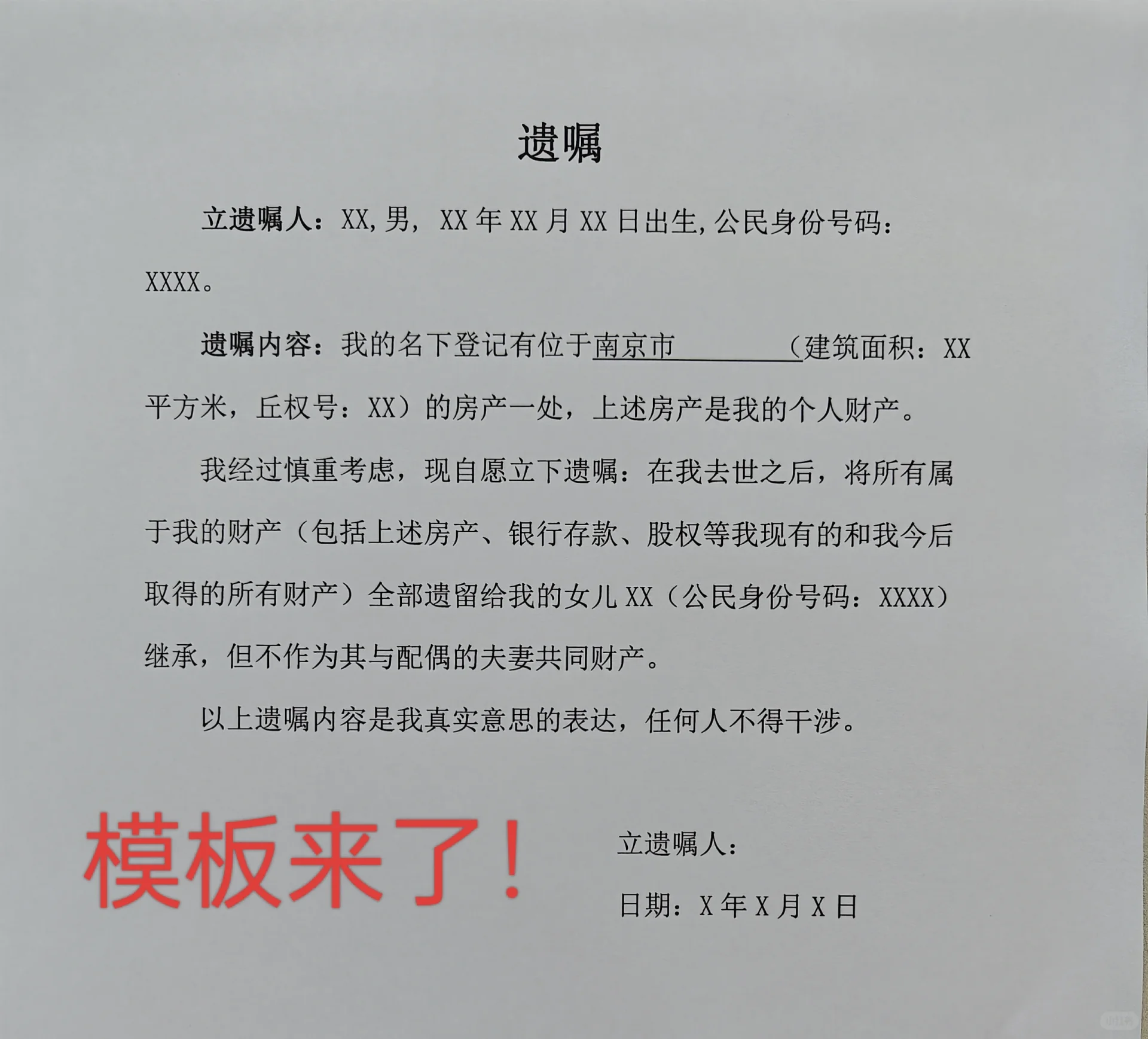 很多人不知道怎么写遗嘱,现在把模板直接发出来,但是有几点要注意!并对常见问题进行解答 1.遗嘱有很多种形式,如果是自书遗嘱,需要立遗嘱人全部亲笔手写,签名,注明年月日。 2.如果是代书遗嘱,需要有两个以上的见证人,由其中一人代书,并由遗嘱人、代书人和其他见证人签名,注明年、月、日。(见证人与遗嘱受益人之间最好不要有利害关系) 3.公证遗嘱和普通遗嘱哪个效力高 答:只要是符合法律规定的遗嘱,效力同等,不存在高低之分(民法典之前,公证遗嘱效力是最高的,但是现在没有区别。) 4.那还有必要办理公证遗嘱吗 答:仍然建议办理。因为公证人员更专业,有些表述更明确,另外虽然法律效力相同,但是公证遗嘱的证据能力更高,也就是说在出现纠纷和争议时,经公证的遗嘱更有利于认定签名的真实性和处分财产的自愿性。 另外,遗嘱的形式要件很重要,自己写的总是会有这样那样的问题(真是这样)。 5.遗嘱中写了全部,还需要再具体表述某一处财产吗 答:建议单独列出,即便内容看似有重复,但是能明确尽量明确,不能明确的再笼统处理。 6.房产写的父亲一个人名字,母亲需要立遗嘱吗 答:房产在婚姻存续期间内取得的,且没有特别约定的,一般视为夫妻共同财产,无论名字在不在房产证上,都需要立遗嘱!而且建议分开立遗嘱,各自写各自的,不要立共同遗嘱! 7.遗嘱立过后可以撤销吗 答:可以,遗嘱在死亡时生效,生前都可以修改或者撤销。 8.可以将房子只给儿子(女儿)不给儿媳妇(女婿)吗 答:可以,明确不作为其夫妻共同财产就可以了! 9.将房子立了遗嘱可以再卖房吗 答:可以,但是房产转让后,遗嘱的财产标的灭失,如果再买新房需要重新立遗嘱。 10.可以立遗嘱给孙子孙女吗有什么要求 答:可以,但是孙子孙女是法定继承人以外的人,属于遗赠。根据民法典的规定,受遗赠人应当在知道受遗赠后六十日内,作出接受或者放弃受遗赠的表示;到期没有表示的,视为放弃受遗赠。 也就是说爷爷奶奶将房子给孙子女,如果他们任一人去世了,孙子女都要在60天内表示接受(形式不限,但是需要公开,不懂可以再办理一份接受遗赠的公证),如果没有及时表态将视为放弃,60天,切记!!!