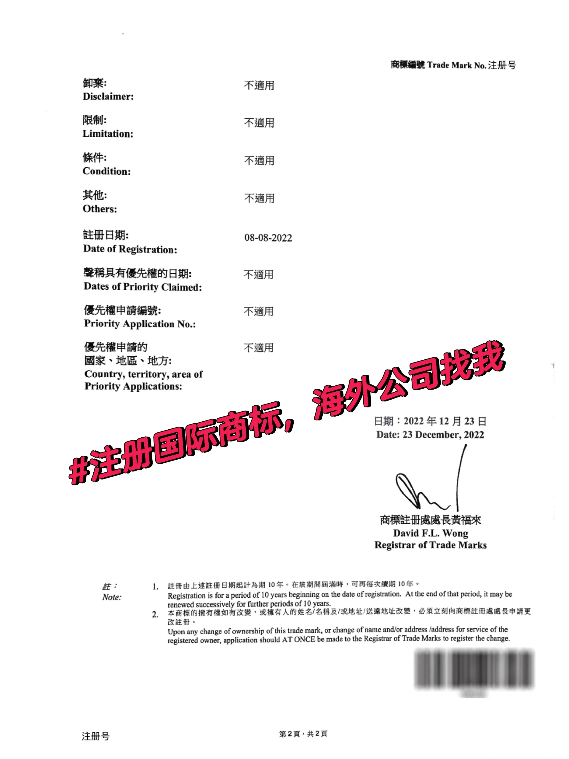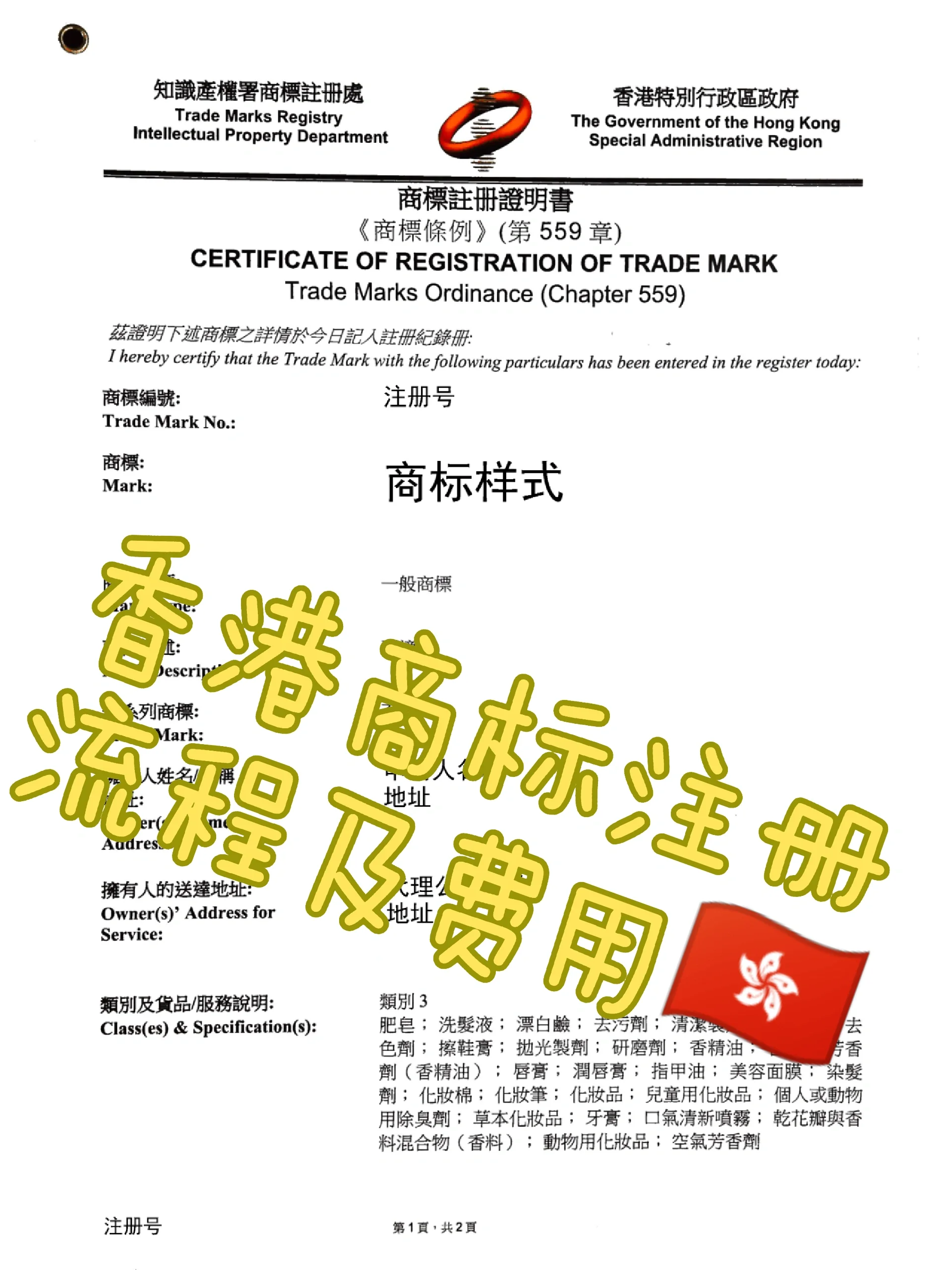 香港公司成立后,别忘了注册商标,拥有香港商标可以快速提升公司知名度,促进海外市场的快速开放。 1、 香港的商标注册程序是什么 向香港知识产权局提交材料并申请注册; 香港知识产权署接受申请并进入审查阶段; 申请商标公告并进入公告期; 如果在公告期内有异议,申请人需要在一定时间内进行辩护(如果辩护不成功,则撤回商标申请); 公示期结束,核准注册后,即可领取《香港商标注册证》。 2、 申请香港商标需要准备哪些文件 申请人资格 香港商标既可以以个人名义申请,也可以以公司名义申请。个人申请需要身份证副本,而公司申请需要营业执照副本。 清晰的商标设计 建议背景为白色,基本颜色为黑色。成功注册商标后,可以更改颜色。如果指定了其他颜色,则注册成功后无法更改颜色。 产品和类别 香港商标不限制产品的具体数量,也可以选择注册整个类别的产品。 商标注册授权书 商标注册授权书由商标代理机构签署,是对双方权利义务的确认。 3、 注册香港商标要多少钱 香港商标注册费包括:香港商标公费+香港律师费+代理服务费。 4、 香港商标的有效期是多少 根据香港商标法,香港商标的有效期为10年,此后可续期10年,续期次数不受限制。 5、 香港商标证书的格式是什么 目前香港商标均为纸质证书。商标局将首先将证书邮寄到代理商的地址,然后再邮寄给您。 需要注意的是,如果证书不幸丢失,需要补发的证书将是证书的副本,与原件不同(如图所示),但法律效力不变。 以上是注册香港商标的流程、所需信息、费用及其他相关事宜,希望对您有所帮助