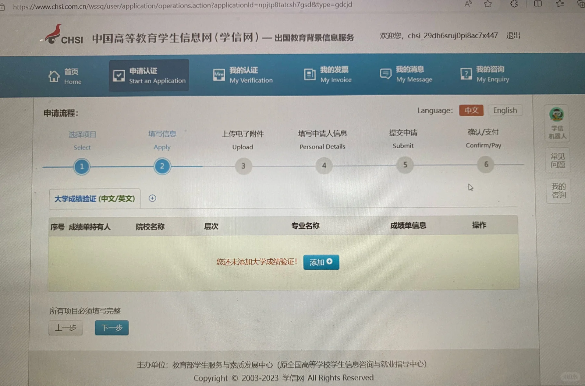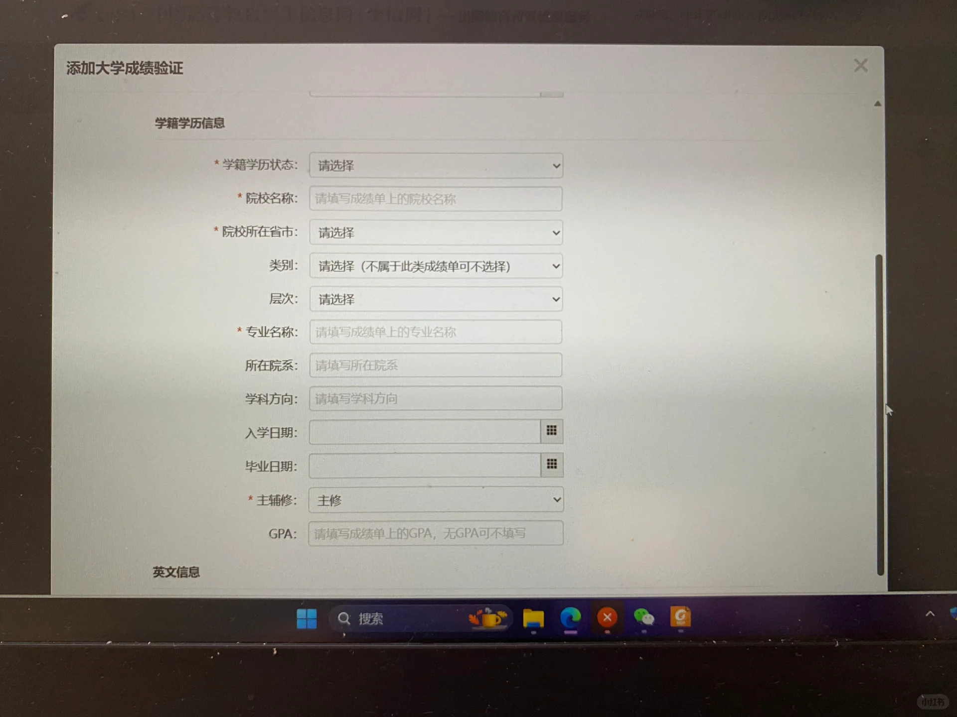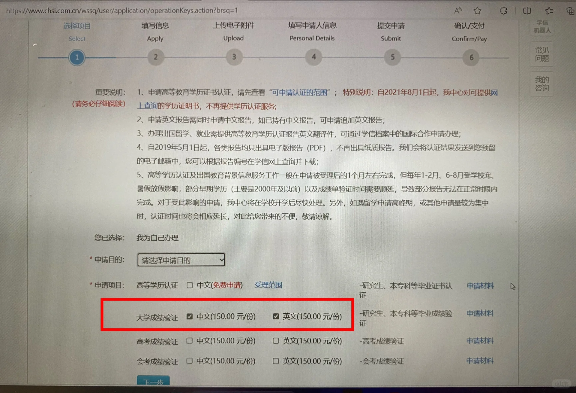 今天发的是学信网高校成绩单验证报告的申请流程,这个真的特别难找而且过程也很繁琐,大家一步一步看仔细啦~ 登录学信网官网,点击“出国教育背景信息服务”,选择“网上申请”; 点击进入网上申请系统,选择“新申请”,选择是否为本人办理; 申请类型里选择“大学成绩验证”,想要英文报告一定要先有英文报告,否则无法申请下去,所以付费是中英文各150元合计300元; 按照步骤往下填写学校信息等,上传擅长版本的成绩单,中英文均有模板,可以下载下来填写; 最后一步是上传证件,包括: 1.学校中文成绩单 (跟教务处申请一定要有学校教务处的盖章) 2.成绩单英文翻译件 (这个学校提供最好,不然可以找一个有翻译资质的机构进行翻译,一定要有翻译资质要不盖章无效) 3.学位证 4.毕业证 5.身份证正方面照片或扫描件 填写申请人信息,选择受理机构,填写发票信息,核对验证信息后点击“提交申请”; 需要用学信网应用程序进行实人验证; 确认申请信息无误后点击“确认支付”。 想要快速的认证成功,成绩单擅长表格 (中文、中英文)这个成绩单的填写是重中 之重! 学信网对此有着许多的要求,如果不清楚这些要求遭到学信网退件将是家常便饭。 1.上传的中文成绩单图片模糊、分辨率低, 需要上传完整清晰的,大小在800KB-2MB的成绩单原件高清彩色照片或扫描件 2.成绩单上有重修或补考的课程需要在成绩后备注。正确如:60(补考) 3.英文成绩单请您按照您提供的成绩单原件录入,保持与原件相一致,请注意单词首字母大写 4.提交后可在网申平台“我的认证”中查看提交的认证申请;如果工作人员校对时发现材料不齐、不清晰等情况,将会校对不通过该申请。申请人会收到短信及站内信通知,需按通知内容补充材料后,再次提交此份申请单;(再次提交申请无需重新支付费用) 5.申请中英文大学成绩单验证时需录入中文及英文课程信息,申请中英文高考成绩单及学业水平考试(会考)成绩单验证时仅需录入中文成绩单信息。 6.验证目的为申请法国签证,需提供法签档案号。