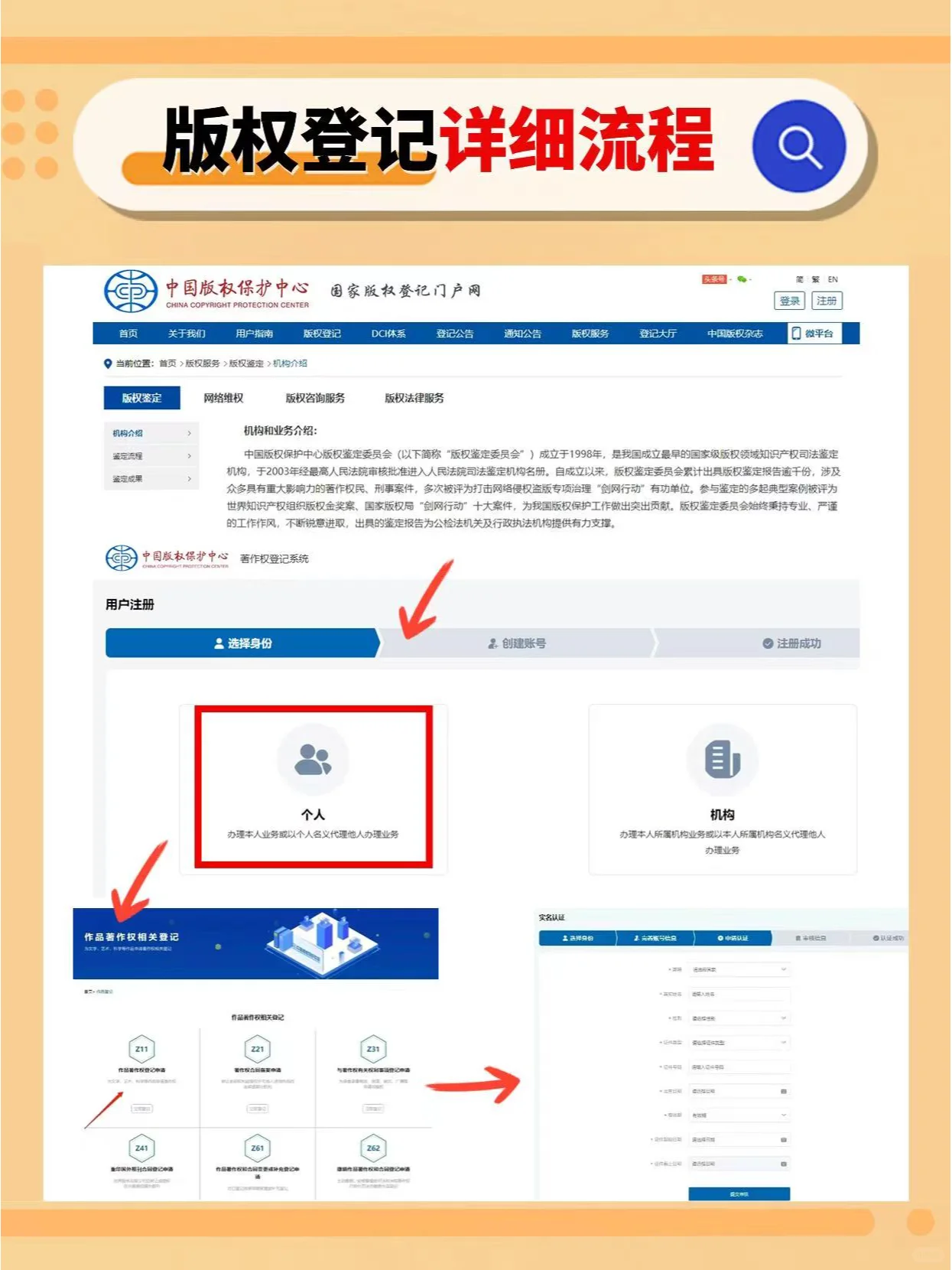 第一步是打开浏览器,搜索中国版权保护中心,进入页面,找到注册,选择个人注册,并添加图像上的信息。提交后,再次登录时会提示进行实名认证,1-3个工作日内实名认证成功。以艺术品版权为例,实名注册后,进入版权注册申请窗口底部,立即点击注册。记得先完成工作注册承诺书,拍一张照片,然后上传。 第二步是选择我是作者的窗口,并完成有关作品创作的信息。工作创建说明有一个模板。如果您想自己编辑它,请按照下面的提示进行操作。 第三步,填写作品的所有权信息,并根据信息逐步填写。将新上传的工作登记承诺书上传到此处的其他权属证明文件中。请注意,公司的申请需要加盖公司公章。 第4步,确认信息,选择A4纸作为艺术品,打印并邮寄给版权局。 第五步,提交成功后,再次进入用户中心,选择作品注册,查看作品的申请状态。接下来,我们将等待5-7个工作日进行审查,最早可以在7天内收到我们作品的电子版权证书。