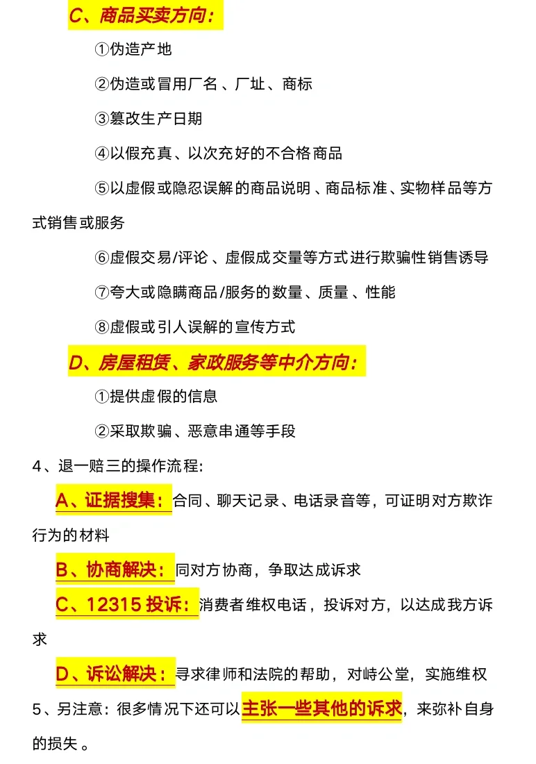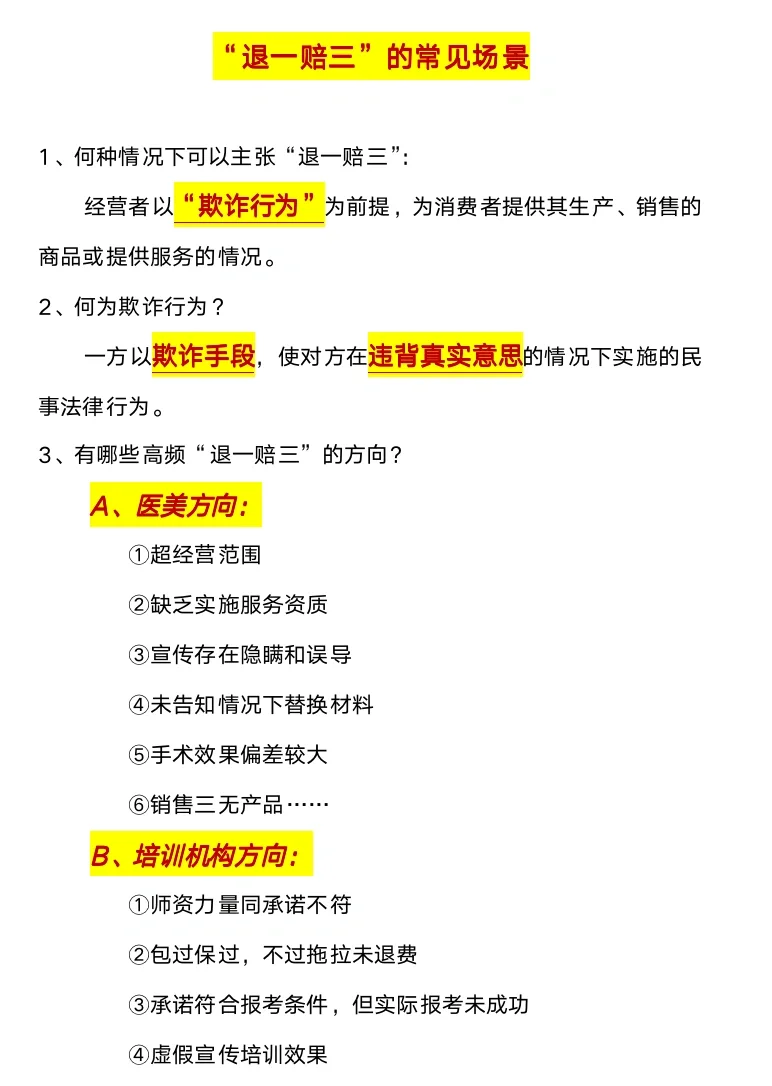 “退一赔三”的常见场景有哪些让我们先了解几个问题 在什么情况下,我们可以提倡“退一赔三”的政策 经营者以欺诈行为为前提,向消费者提供其生产或销售的商品或服务的情形。 什么是欺诈行为 一方通过欺诈手段实施的民事法律行为,导致另一方违背其真实意图。 什么那么,高频的“一背、一背、三背”场景是什么呢 医美方向: ① 超出业务范围 ② 缺乏实施服务资质 ③ 隐瞒和误导性宣传 ④ 更换材料而不通知 ⑤ 手术结果的显著偏差 ⑥ 销售三无产品 培训机构方向: ① 教职员工与承诺不符 ② 包裹已被保险,但延期未退还 ③ 承诺满足申请要求,但实际申请失败 ④ 虚假的晋升和培训效果 商品买卖方向: ① 伪造原产地 ② 伪造或假冒工厂名称、地址、商标 ③ 篡改生产日期 ④ 不合格的产品被错误地认定为正品,不合格的被视为良品 ⑤ 通过虚假或误导性的产品描述、产品标准、实物样品等销售或提供服务 ⑥ 通过虚假交易/评论、虚假交易量和其他方式进行欺骗性销售诱导 ⑦ 夸大或隐瞒商品/服务的数量、质量和性能 ⑧ 虚假或误导性的促销方法 住房租赁、家政服务等中介方向: ① 提供虚假信息 ② 使用欺骗、恶意串通等手段 退一赔三的操作流程: 证据收集:能够证明对方欺诈行为的合同、聊天记录、电话录音等文件 协商解决方案:与对方协商,努力实现需求 12315投诉:消费者维权电话,投诉对方实现我们的诉求 诉讼解决:寻求律师和法院的帮助,在法庭上对峙,落实维权措施 什么 另请注意:在许多情况下,可以提出其他索赔来补偿自己的损失。