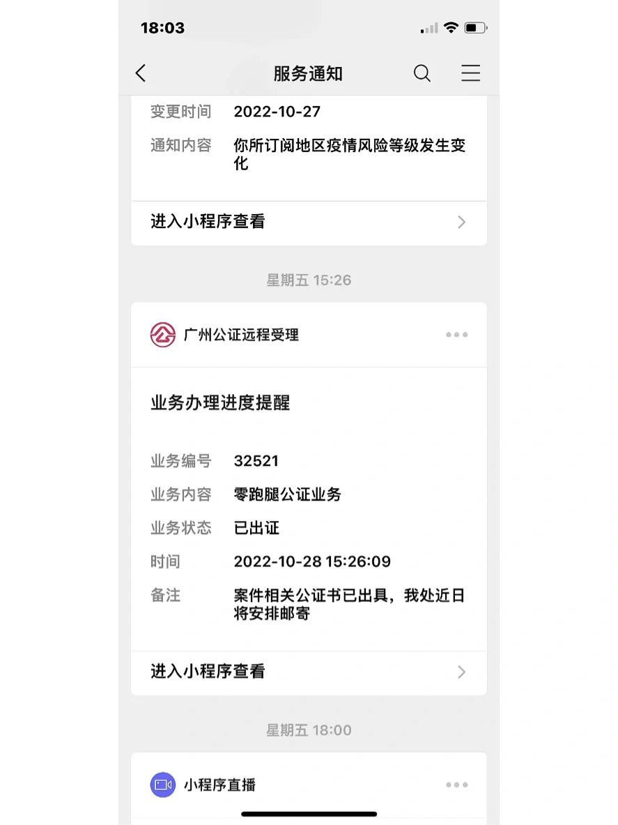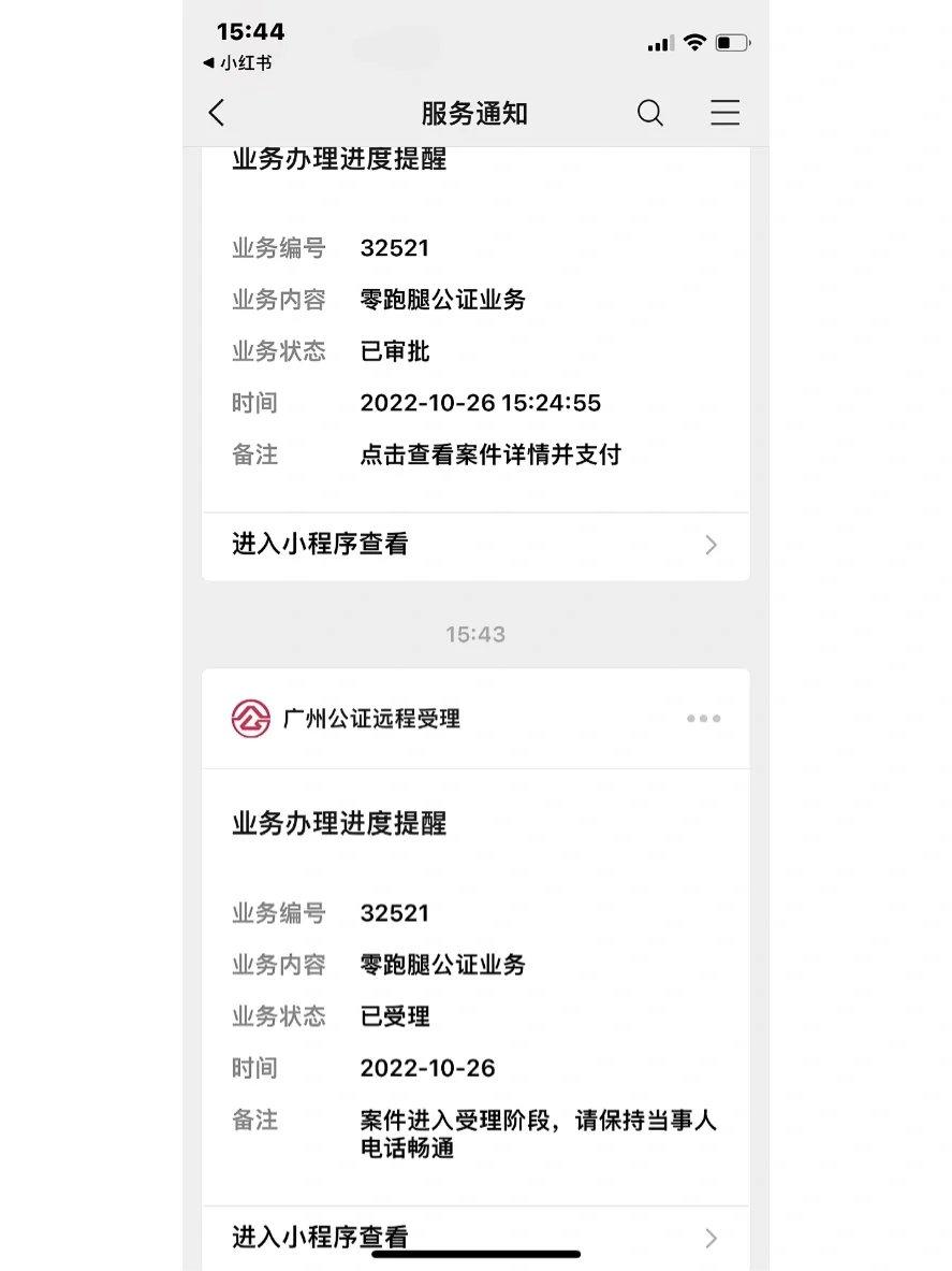 因为我需要使用无犯罪记录证明和公证文件,但我不能长时间回外地户籍。在阅读了提示后,我试着在网上处理它。从申请无犯罪记录证明到拿到公证书,只需十天时间,我们真正做到了为民零跑腿 以下是一个流程分享,有需要的朋友可以参考: (图1)广东省事项目-家庭保障-无犯罪记录证明。点击填写信息,并根据个人需要提交。前年,我试图申请,但被拒绝了。幸运的是,当时我不需要使用。我写了一份申请表并提交了相关信息(虽然上面说申请不需要在一年内提交三次,但为了顺利审核,我还是提交了)。公众号将推送有关流程进展的信息。图2是有关过程进度的信息。我是在第三天早上通过电子邮件收到的。犯罪记录证明的电子档案! 拿到无犯罪记录证明后,就可以开始公证了! (图3)广州公证员小程序-网上公证申请。点击它并按照它的流程根据您的需求填写相关信息。记得选择邮寄公证文件!您无需亲自前往或委托他人领取。在提交上述申请后,我于中午11点左右提交了申请。下午2点,公证处的工作人员给我打电话询问了相关情况,然后加了微信提交了公证所需的文件。我在整个过程中使用的文件都是电子文件(身份证和户口本),可以从广东省政府下载 在公证员确认没有问题后,公证员迷你程序将提醒您付款,并提醒您流程的进展(图4和图5)。您可以随时查看,然后等待公证书的出具。公证处会直接邮寄给您付款!(图6)收到发票后,发现工作人员好心地将发票放在一个文件袋中,并用夹子将其夹在一起 最后,整个过程感觉非常好、快速、方便。