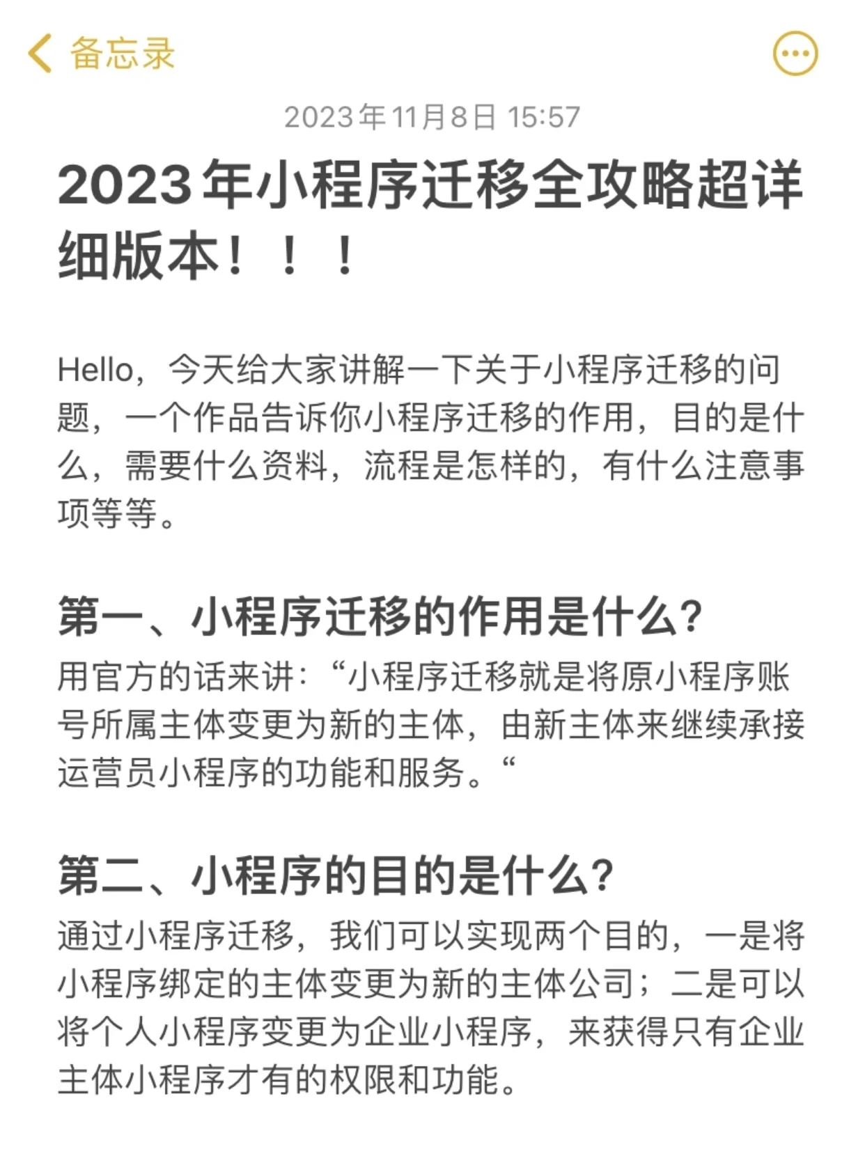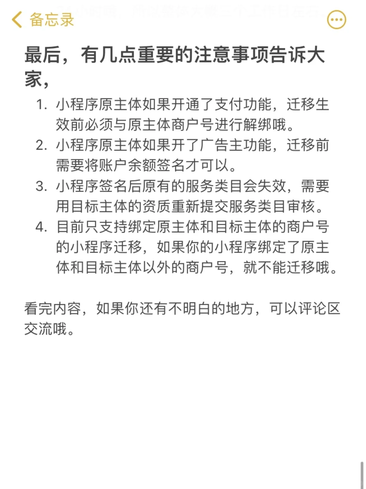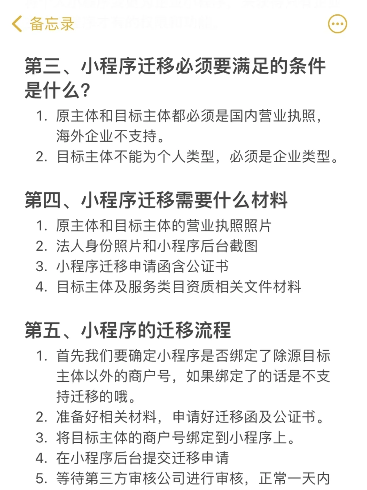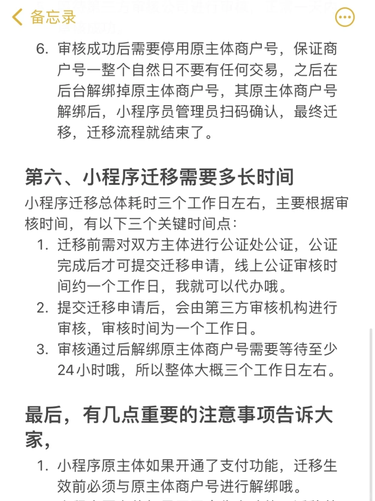 大家好,今天我来给大家解释一下小程序迁移的问题。一个作品告诉你小程序移植的作用,需要什么材料过程是什么注意事项是什么 小程序迁移的作用是什么 在官方术语中,迷你程序迁移是将迷你程序帐户的原始所有者更改为新所有者的过程,新所有者将继续承担运营商迷你程序的功能和服务 迷你程序的目的是什么 通过小程序迁移,我们可以实现两个目标:第一,将与小程序绑定的实体更改为新的实体公司;其次,可以将个人迷你程序更改为企业迷你程序,以获得只有企业主迷你程序才能拥有的权限和功能 小程序迁移必须满足哪些条件 1.原始实体和目标实体都必须具有境内营业执照,而境外企业不支持该执照 2.目标实体不能为个人类型,必须为企业类型 小程序迁移需要哪些材料 1.原始和目标实体的营业执照照片 2.小程序后台企业身份照片及截图 3、小程序迁移申请书及公证证明 4.与目标实体和服务类别相关的资格文件和材料 小程序的迁移过程 首先,我们需要确定迷你程序是否绑定到源实体和目标实体以外的商家帐户。如果已绑定,则不支持迁移 2、准备好相关材料,办理移民证、公证书 3.将目标实体的商户账号绑定到小程序 4.在小程序后端提交迁移申请 5.等待第三方审计公司进行审计,一天内审计成功。 6.审核成功后,需要停用原始主体商户账户,以确保整个自然日没有交易。然后,在后台解除对原始主体商户账户的绑定。原主题商户账号解除绑定后,程序员管理员扫码确认,最后进行迁移。迁移过程结束 迷你程序迁移需要多长时间 迷你程序的总体迁移时间约为三个工作日,主要基于审查时间,有以下三个关键时间点 1、移民前,双方需经公证处公证。公证完成后,即可提交移民申请。网上公证审核时间约为一个工作日,我可以代为办理 提交迁移申请后,将由第三方审计机构进行审查,审查时间为一个工作日 3.批准后,取消绑定原始商户账户至少需要24小时,因此总共需要大约三个工作日 最后,有几点很重要,需要大家注意 如果小程序的原始主体已启用支付功能,则迁移生效前必须与原始主体的商户账户解除绑定 2.如果小程序的原始主体已启用广告客户功能,则需要在迁移前签署帐户余额 3.小程序签署后,原始服务类别将失效,需要重新提交目标实体的资格进行服务类别审查 目前,只支持绑定原始实体和目标实体的商户账户的迷你程序进行迁移。如果您的迷你程序绑定了原始实体和目标实体之外的商家帐户,则无法迁移