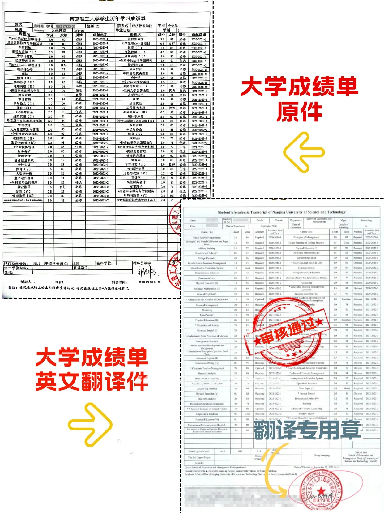 准备留学的小伙伴们,出国留学,申请资料都准备好了吗成绩单翻译,这一环节千万别忽视哦!成绩单,不仅是你学术实力的见证,更是留学申请中的关键材料! 成绩单如何获取 1.可以去学校的教务处或者相关管理部门咨询具体的办理流程。注意办理的时间哦,有的学校可能需要一定的工作日来处理。 2.现在很多学校也提供在线申请和下载成绩单的服务,要随时关注学校的官网信息。 成绩单英文翻译件如何获取 1.如果学校提供英文版成绩单就可以直接用。 2.学校不提供英文版成绩单,可以找kk学姐翻译盖翻译章! 成绩单翻译有哪些注意事项 1.成绩单翻译件的格式和内容必须与原件保持一致。 2.成绩单翻译件上的信息要准备专业翻译,包括课程名称、成绩、学分等 3.成绩单翻译完成后,需加盖翻译专用章,并签字确认。 总之,出国留学,提交的成绩单翻译件一定要谨慎不能大意,学姐建议大家一定要认真对待,希望大家都可以顺利拿到心仪高校的提供