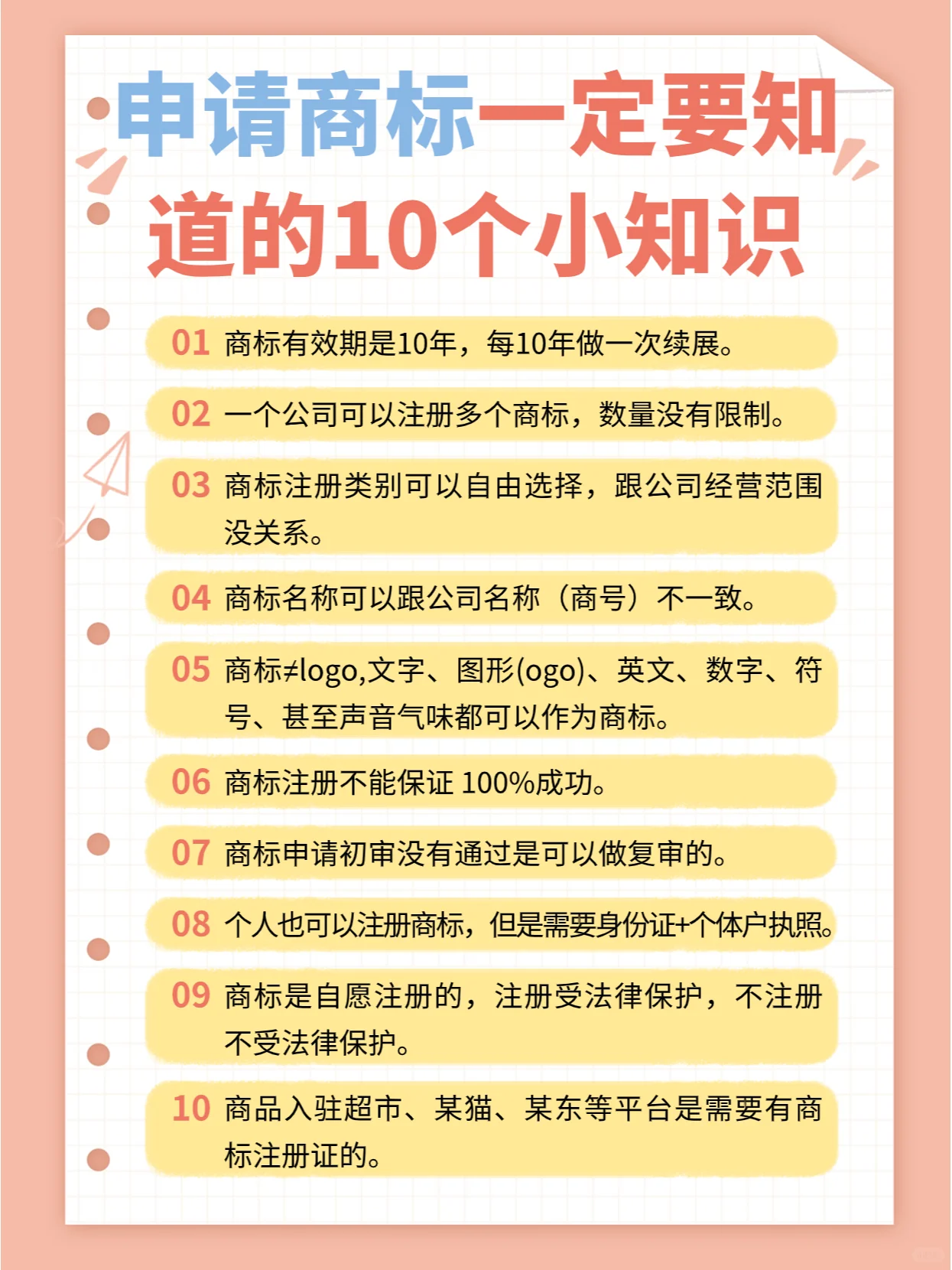 朋友们,今天我就来给大家讲解10个关于申请商标的晦涩知识,帮助你更加熟练地保护品牌,远离法律风险!来和我一起看一看! 知识点1:商标的有效期为10年,每10年更新一次。 知识点2:一个公司可以注册无数的商标,没有任何限制! 知识点三:商标注册类别可以自由选择,不受公司经营范围的限制! 知识点四:商标的名称可以与公司的名称不同。回想起什么 知识点5:个人也可以注册商标,但申请时需要携带身份证和个人营业执照! 知识点六:商标不仅指标志,还包括文字、图形、英语、数字、符号,甚至声音和气味!什么 知识点七:商标注册不能保证100%成功,你需要做好准备! 知识点8:商标是自愿注册的,只有注册才能受到法律保护! 知识点9:如果你想在超市、天猫和京东等平台上储存你的产品,你必须有商标注册证书! 知识点10:如果商标申请初审失败,不要气馁。你可以继续复查了! 朋友们,关于申请商标注册的这些重要知识,你们都掌握了吗