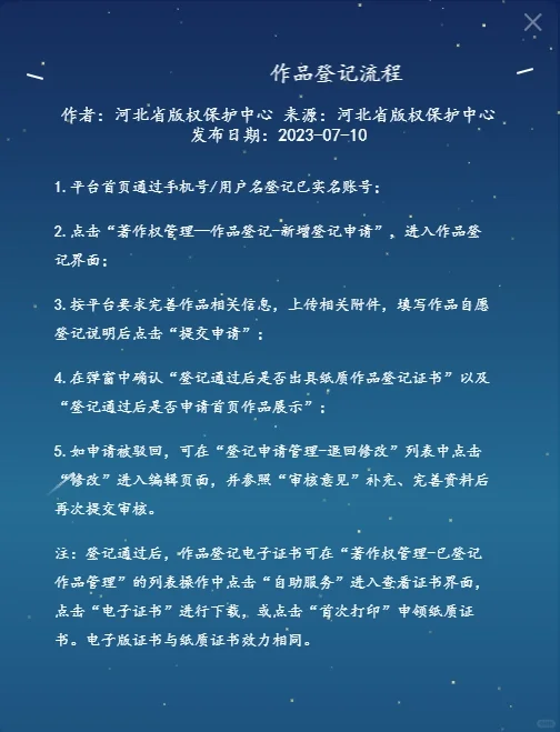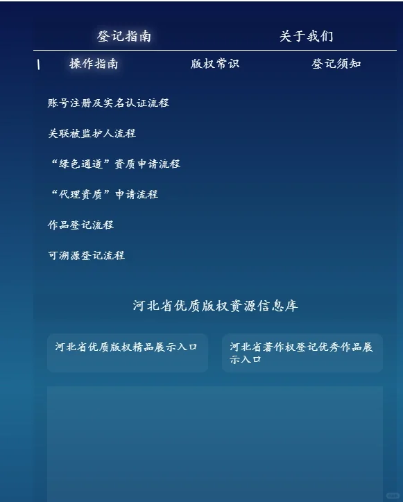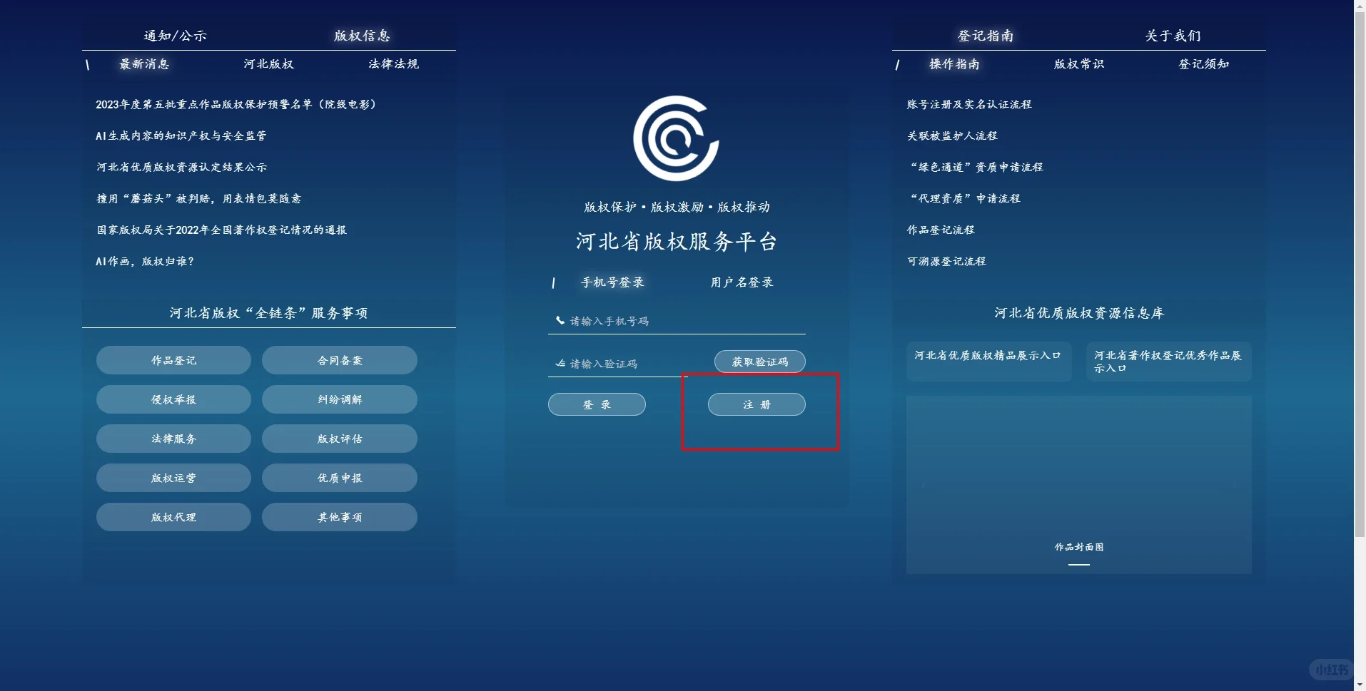 1.注册入口:河北省版权服务平台 2.进入页面后,注册个人信息并进行实名认证。 3.然后在“服务项目”部分选择“版权登记”,按照官方提示按顺序填写信息,上传作品资料。 4.提交后,即可完成注册,并在初审和终审完成后下载证书。