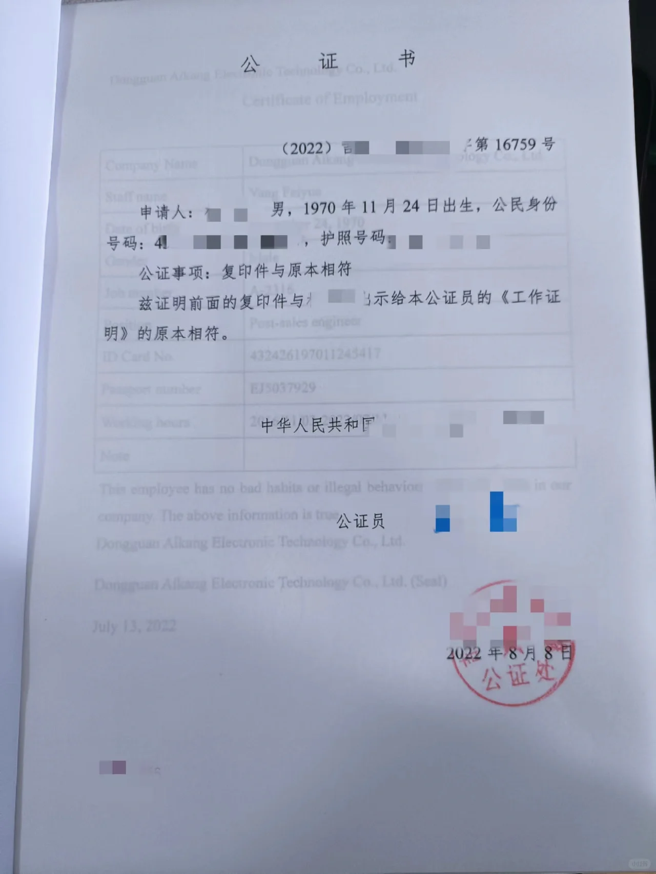 工作证明公证认证 工作证明公证所需资料: 1.申请人身份证正反面扫描件; 2.户口本扫描件:户主页+户主页+申请人页; 3.相关单位出具的收入证明盖章扫描件; 4.出具证明单位的营业执照扫描件。 注:含近三个月单位所发工资凭证或纳税证明我司是正规代办公司,公证书均由公证处出具,所以公证书是真实有效的。 第一,每本公证书都是有编号,可拨打114查询该公证处电话,然后报公证号查询申请人。 第二,每本涉外的公证书证词及证词翻译用具有编号的专用水印纸张。 第三,每本公证书都是有全本贯穿钢印的,每页都有钢印章。