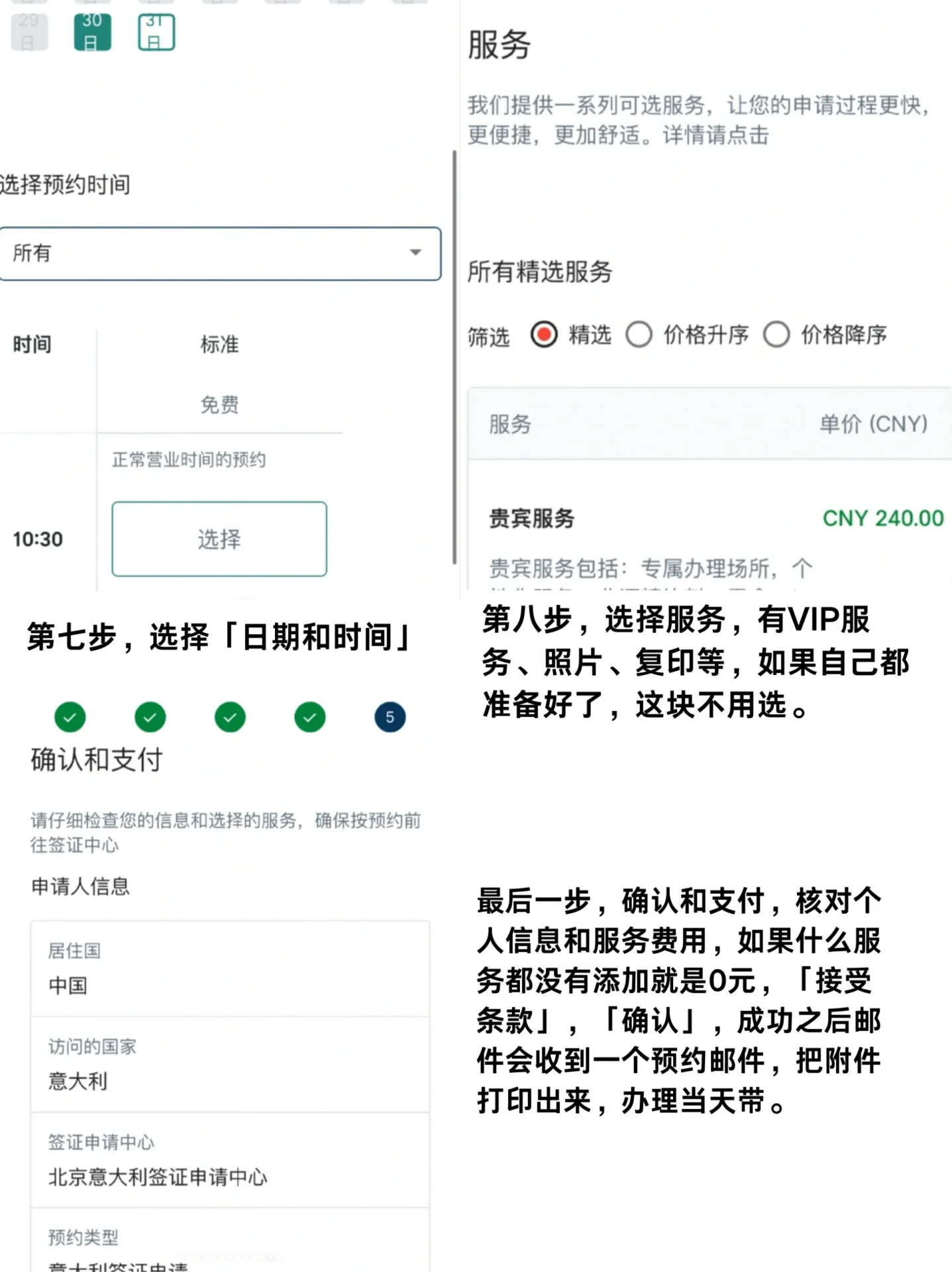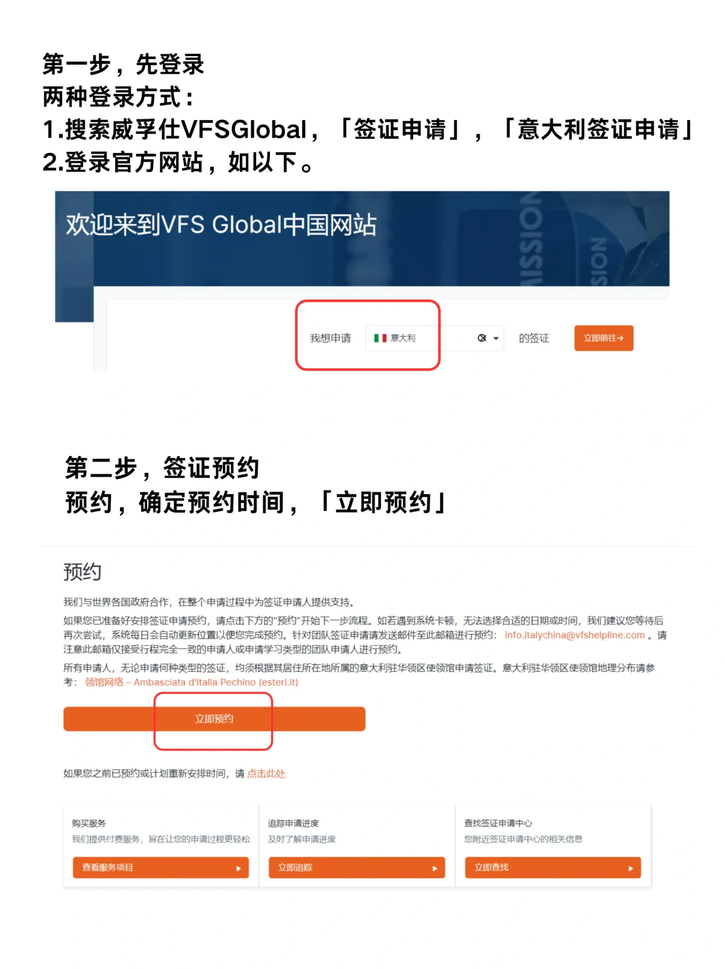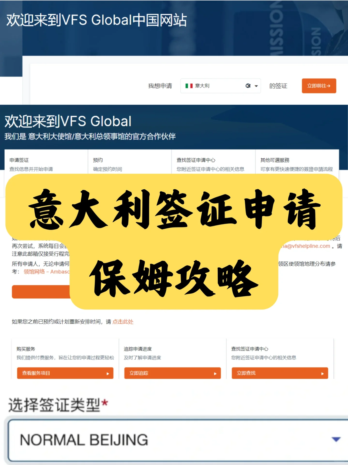 第一步是先登录 两种登录方式: 1.搜索VFS Global,“签证申请”,“意大利签证申请” 2.登录官方网站,如图2所示。 第二步,预约签证,确认预约时间,并立即预约 步骤3,登录或注册帐户 登录帐户,输入新注册的电子邮件和密码,下面的验证区域应该有一个绿色的复选框和“成功”字样,如下所示。 第四步,进入后,点击“开始新预约”,选择签证申请中心“北京意大利签证申请中心”。约会类型将自动显示。选择签证类型,最早的预约时间将显示在“正常北京”下。单击继续。 NORMAL是一个常规号码,VIP是一个VIP号码,大厅里排队等候该号码的队伍是相同的。不同的是,VIP号码处理区的人略少,环境更好,价格略贵。 第五步,添加联系方式,根据您的护照填写,然后继续下一步。每个注册帐户丢失只能添加一个联系人,并且只能安排一个人。 步骤6,点击一次性密码(OTP)生成OTP。验证码将发送到注册的电子邮件中,并填写以表示验证成功。 第7步,选择日期和时间。 第8步,选择服务,包括VIP服务、照片、复印件等。如果你已经准备好了,你不需要选择这个选项。 最后一步是确认并支付、核实个人信息和服务费。如果没有添加服务,则为0元。“接受条款”和“确认”。成功后,将收到一封预约电子邮件,附件将在处理的同一天打印出来并随身携带。