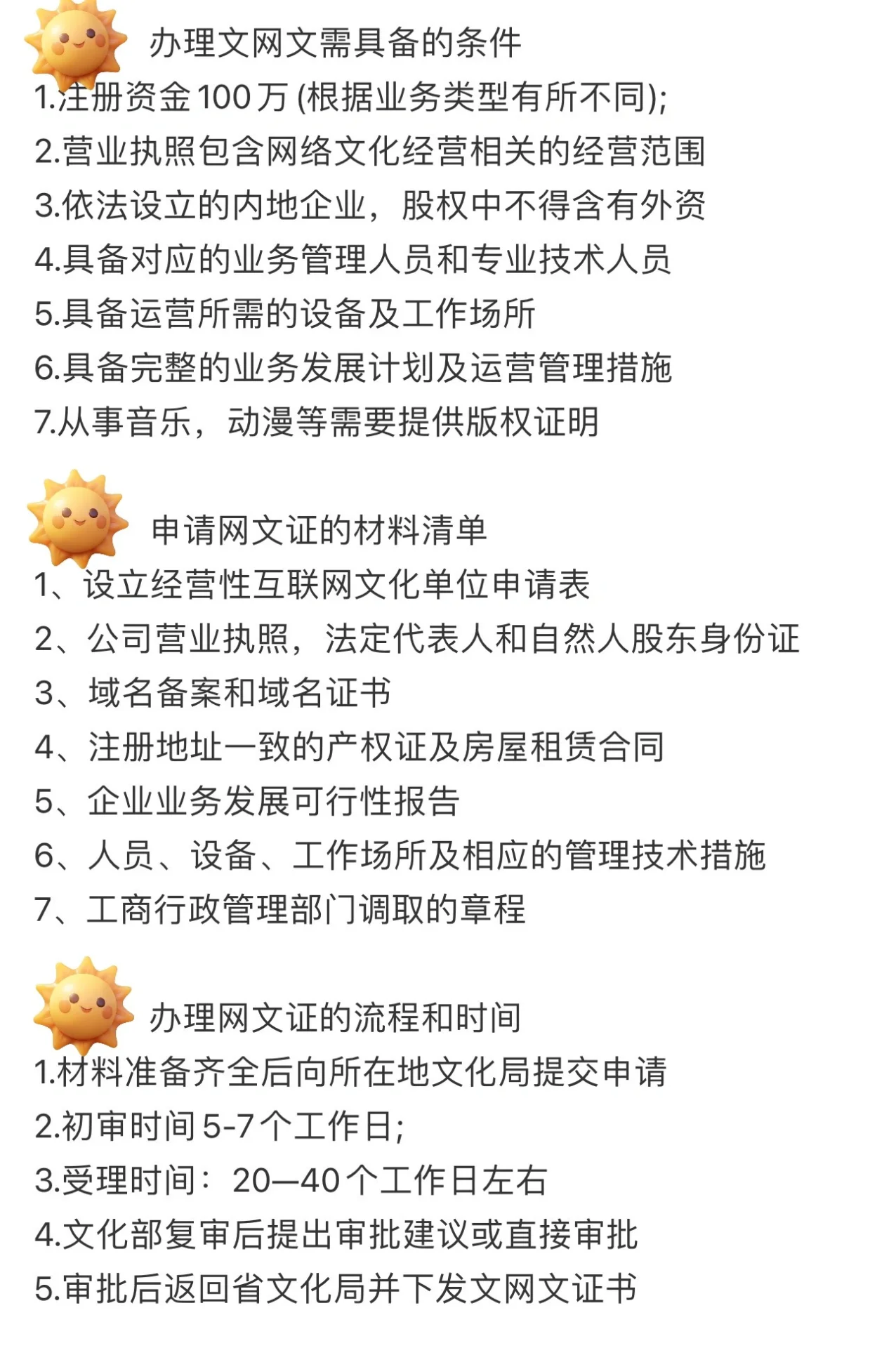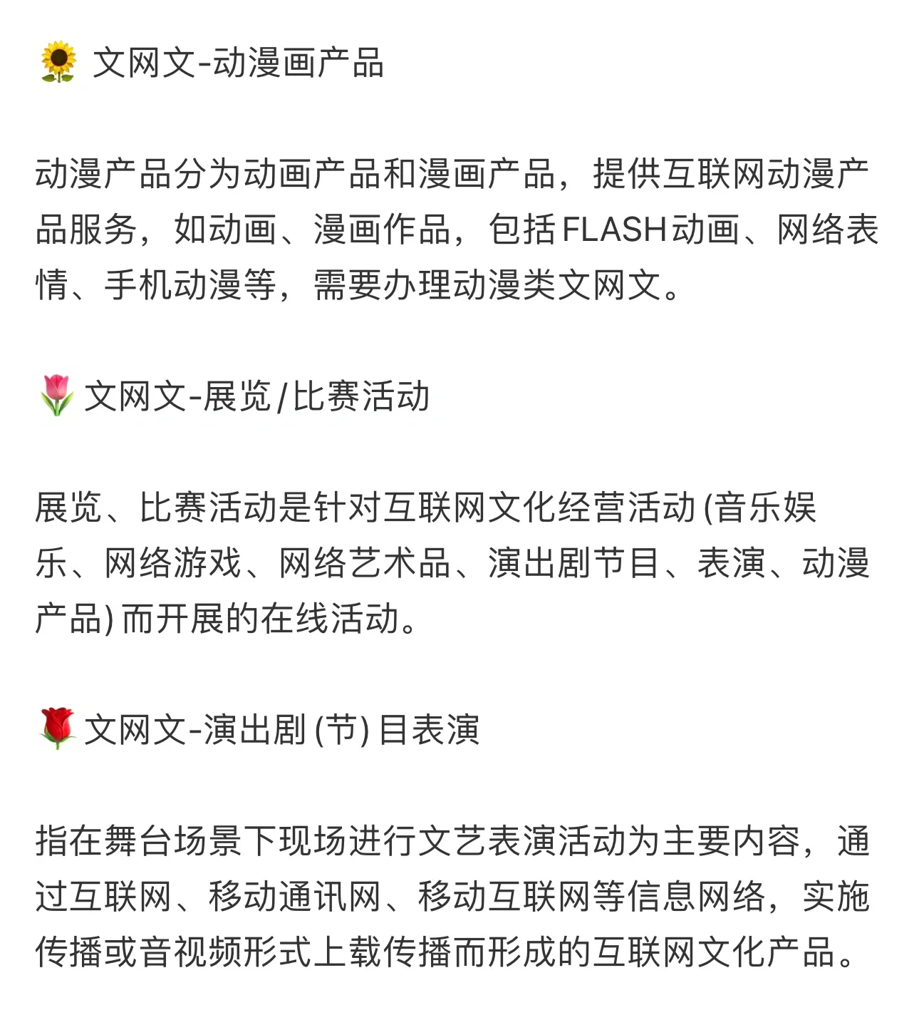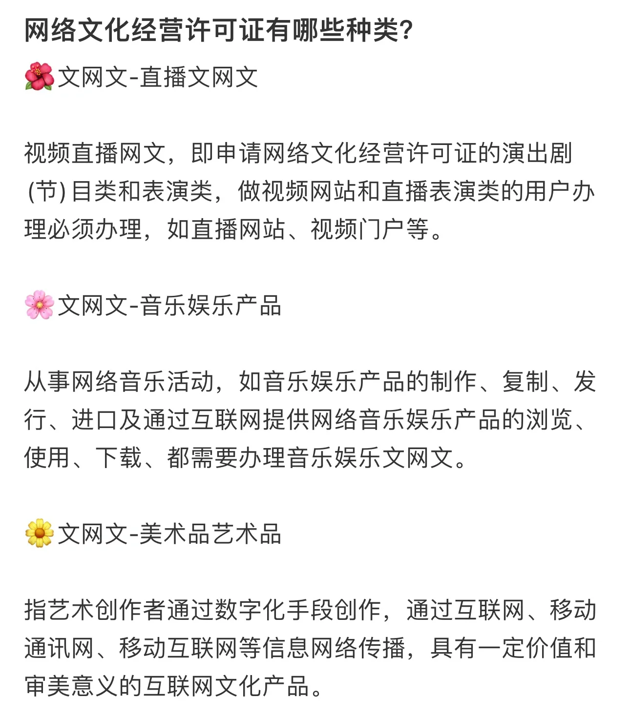 网络文化经营许可证有哪些种类 直播 视频直播网文,即申请网络文化经营许可证的演出剧(节)目类和表演类,做视频网站和直播表演类的用户办理必须办理,如直播网站、视频门户等。 音乐娱乐 从事网络音乐活动,如音乐娱乐产品的制作、复制、发行、进口及通过互联网提供网络音乐娱乐产品的浏览、使用、下载、都需要办理音乐娱乐文网文。 美术品艺术品 指艺术创作者通过数字化手段创作,通过互联网、移动通讯网、移动互联网等信息网络传播,具有一定价值和审美意义的互联网文化产品。 动漫画 动漫产品分为动画产品和漫画产品,提供互联网动漫产品服务,如动画、漫画作品,包括闪光动画、网络表情、手机动漫等,需要办理动漫类文网文。 展览/比赛活动 展览、比赛活动是针对互联网文化经营活动(音乐娱乐、网络游戏、网络艺术品、演出剧节目、表演、动漫产品)而开展的在线活动。 演出剧(节)目表演 指在舞台场景下现场进行文艺表演活动为主要内容,通过互联网、移动通讯网、移动互联网等信息网络,实施传播或音视频形式上载传播而形成的互联网文化产品。 办理文网文需具备的条件 1.注册资金100万(根据业务类型有所不同); 2.营业执照包含网络文化经营相关的经营范围 3.依法设立的内地企业,股权中不得含有外资 4.具备对应的业务管理人员和专业技术人员 5.具备运营所需的设备及工作场所 6.具备完整的业务发展计划及运营管理措施 7.从事音乐,动漫等需要提供版权证明 申请网文证的材料清单 1.设立经营性互联网文化单位申请表 2.公司营业执照,法定代表人和自然人股东身份证 3.域名备案和域名证书 4.注册地址一致的产权证及房屋租赁合同 5.企业业务发展可行性报告 6.人员、设备、工作场所及相应的管理技术措施 7.工商行政管理部门调取的章程 办理网文证的流程和时间 1.材料准备齐全后向所在地文化局提交申请 2.初审时间5-7个工作日; 3.受理时间:20-40个工作日左右 4.文化部复审后提出审批建议或直接审批 5.审批后返回省文化局并下发文网文证书
