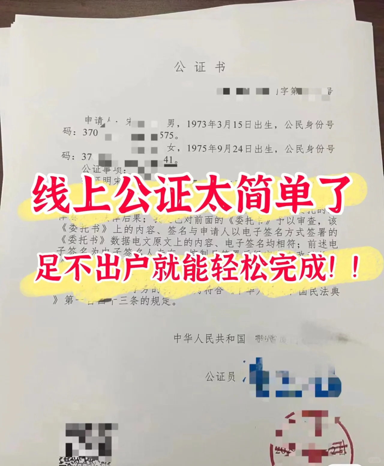 哪些公证可以线上办理 在线公证适用的范国非常广泛,包括一般的委托公证(例如房产委托公证、办理货款委托公证、委托设立或注销公司等)、一般涉外公证(例如出生公证、身份证公证等)、银行赋强公证、夫妻协议公证、离婚变更或协议公证等。 遗嘱、遗赠扶养协议、认领亲子、收养关系、解除收养关系、生存状况等与人身密切关系的公证事项,应当由本人亲自申办。(简单一句话 来说就是特别容易产生纠纷的公证都是需要涉及 所有人亲自取公证处现场签字确认办理的) 线上公证优势在哪里 ️ 1.简单在线公证可以实现“零接触”“零跑腿”,不需要反复前往公证处递交材料 2.专业!!一对一分析客户情況 可以为客户提供 最好的方案 3.透明!!办理进度随时反馈 4.轻松!!无需本人亲自到场,通过线上视频的方式超越空问和时问的局限,随时随地可操作,方便,快捷 5.迅速!!在线操作之后可当场审核,1-2个工作 日即可出证 6.正规!!支持全国办理,不限地区、不限户籍,公证书上的二维码也都支持在线查验