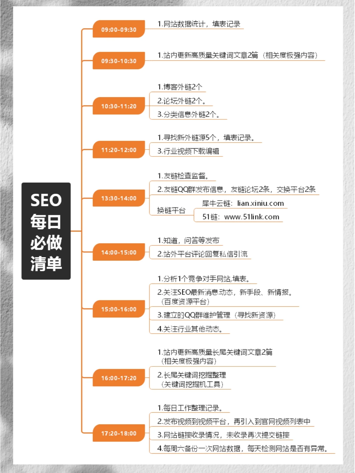 在一个网站的不同阶段,会有不同的运营策略,不同运营策略的工作内容也会有所不同。 所以SEO的工作内容不是固定的,应该根据网站的现状来制定。无论做什么工作,明确日常工作内容都可以提高工作效率,避免工作中的疏漏。 这里总结一下SEO的日常工作内容,可以根据自己的实际情况进行改进。