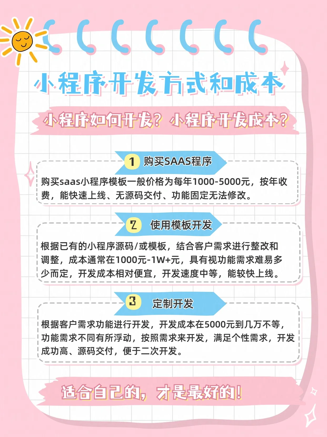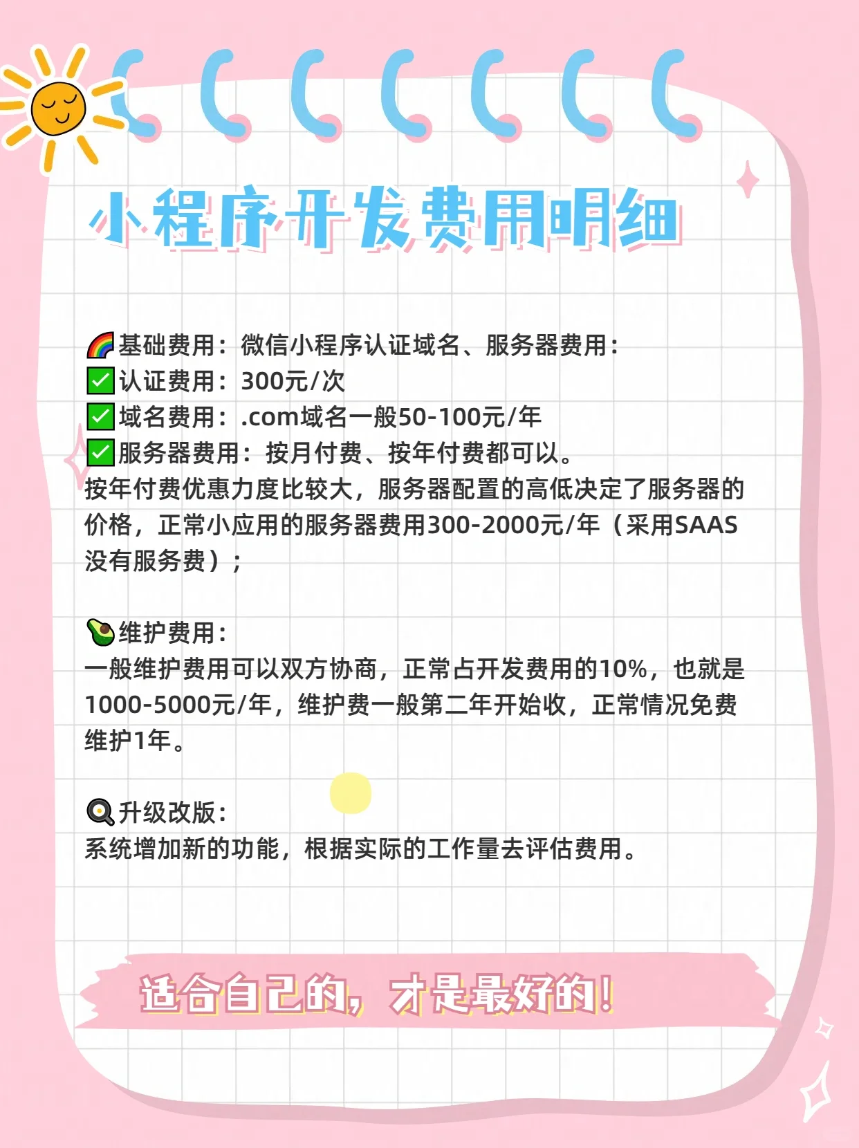 小程序开发方法: 开发一个迷你程序需要多少钱开发迷你程序需要多少时间! 小程序开发通常分为四种模式。在每种模式下创建一个迷你程序的成本是多少 1.购买SAAS软件 迷你程序开发公司已经推出了支持快速生成迷你程序、网站、应用程序等的平台。商家可以通过支付年费来使用金融、医疗保健和购物中心等SaaS应用程序。SaaS小程序成本低、启动快,由开发公司负责维护和升级。该函数是固定的,不能修改,并且源代码不属于买方。 2.模板开发: 已经有了小程序的源代码或模板,并结合客户的需求,做出相应的调整和修改以满足他们的需求。 因为它是一组多次使用的源代码,所以开发成本相对较低,通常在1000元到几千元之间。价格相对便宜,源代码可以快速启动,功能很难修改,代码也很难维护。 3.定制化开发: 基于用户定制迷你程序的功能更适合拥有成熟业务系统、客户需求、企业内部需求和充足预算的公司。因为所有的功能都是定制的,所以开发只能针对单个公司,而且开发周期长,所以成本肯定很高。它通常起价5000元,可能会根据功能的复杂性和数量而波动。 4.独立开发 客户拥有自己的组件技术团队,根据业务需求独立开发。完全自主控制,能够随时根据业务需求进行调整和优化。需要一定水平的技术实力,包括前端开发、后端开发、服务器配置等,成本投入高,风险大。 适用情况:适合拥有相关技术团队或愿意投入大量资源进行技术学习的企业。 在选择小程序开发方法时,企业需要综合考虑自己的需求、预算和技术实力,选择最适合自己的方法。 小程序开发成本: 基本费用:微信小程序认证域名,服务器费用: 认证费:300元/次 域名费:。com域名一般花费50-100元/年 服务器费用:可以按月和按年付款。 年支付折扣相对较强,服务器配置的水平决定了服务器的价格。普通小型应用的服务器费用为300-2000元/年(使用SAAS不收取服务费); 维护成本: 一般维护费用可由双方协商,通常占开发成本的10%,即1000-5000元/年。维修费通常从第二年开始收取,在正常情况下,一年内免费。 升级和重新设计: 该系统增加了新功能,以根据实际工作量评估成本。